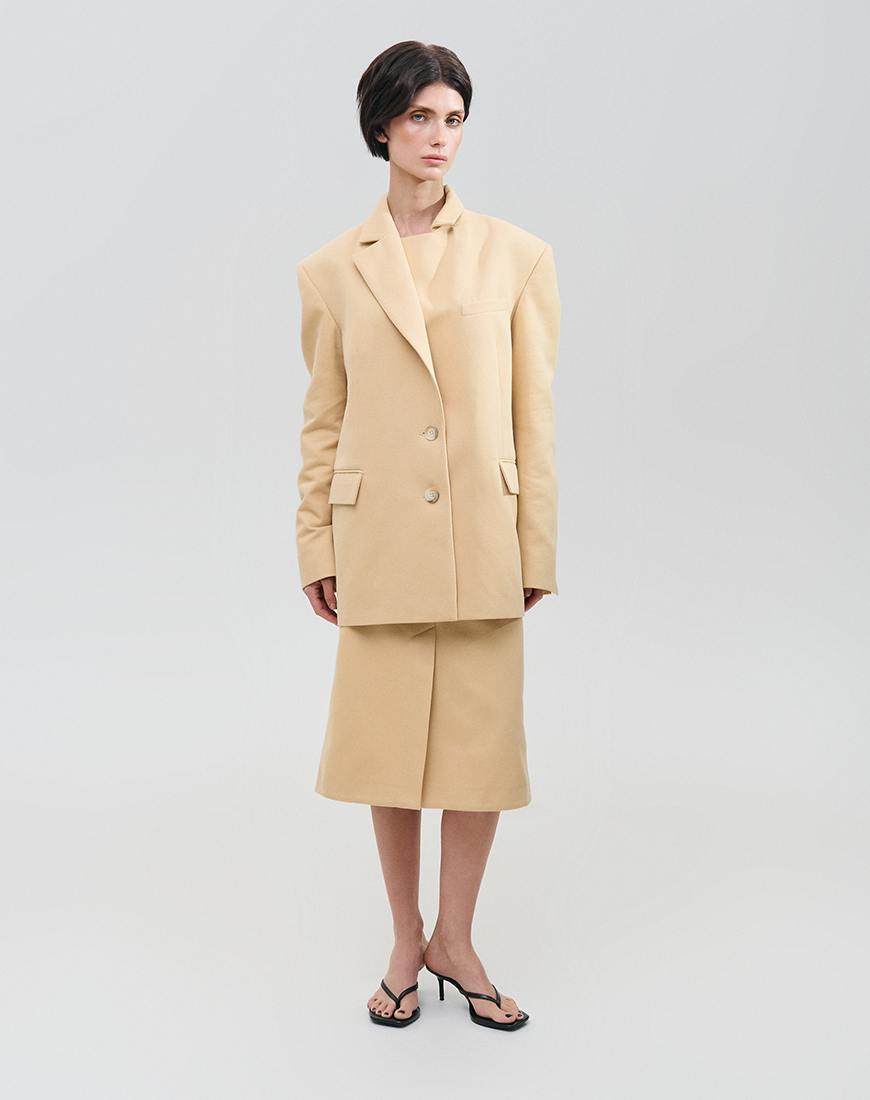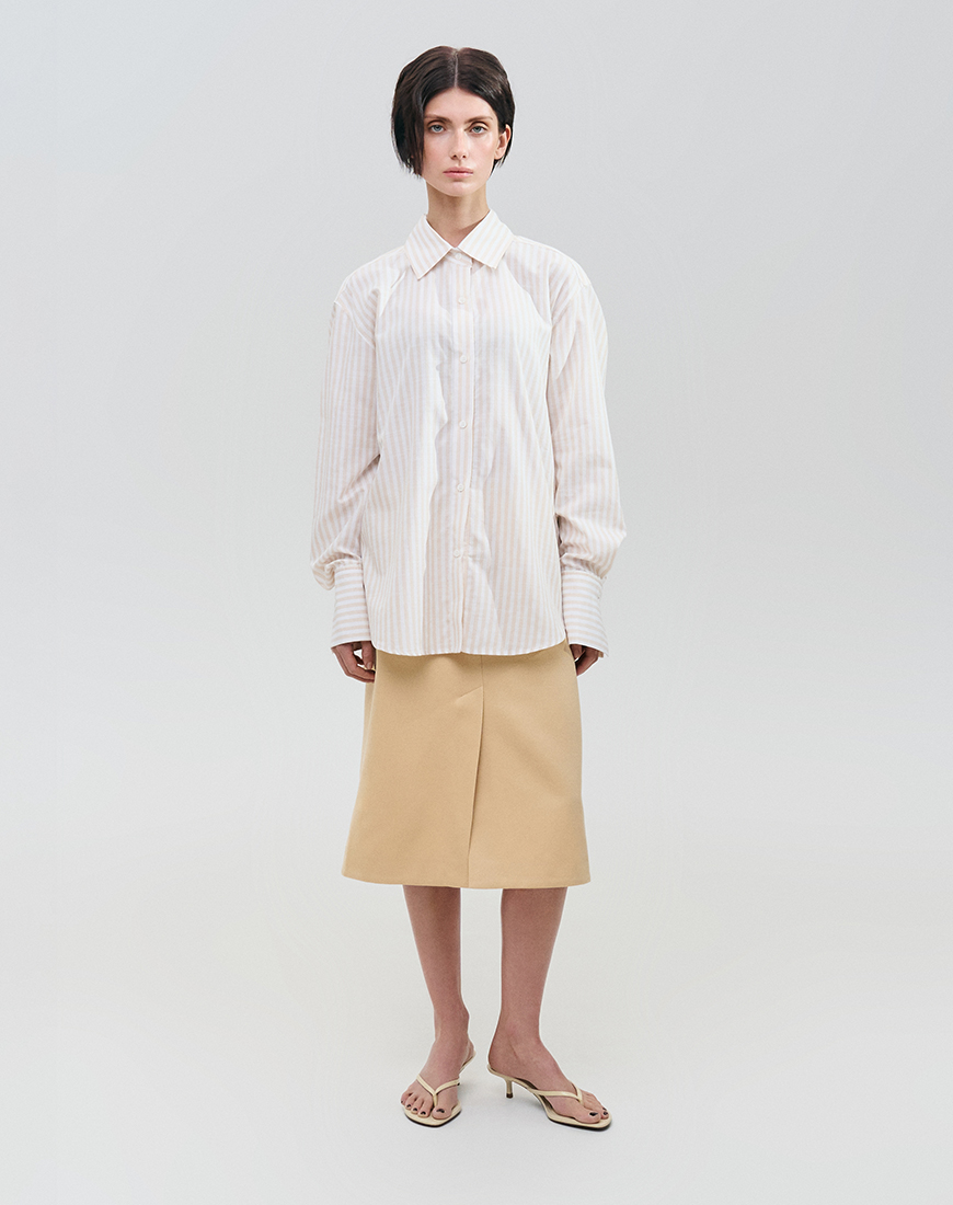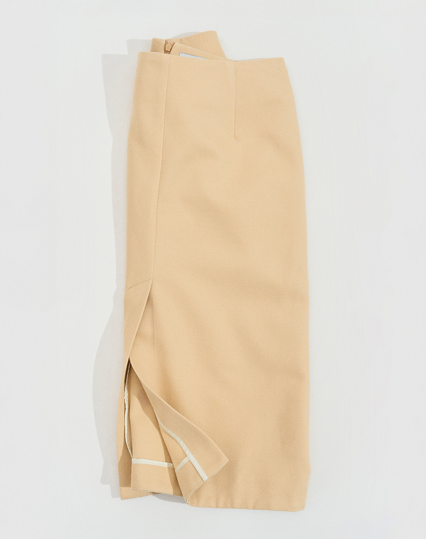 Бавовняна спідниця А-силуету — базова річ із характером, що поєднує в собі комфорт та вишуканість. Довжина міді у поєднанні зі шліцою спереду створює актуальний та збалансований образ, доречний як для офісних буднів, так і для неформальних зустрічей. Використання натуральної бавовни преміальної якості гарантує високу повітропроникність та тактильний комфорт. Бічні кишені та прихована фурнітура підкреслюють мінімалістичний підхід до дизайну, де кожна деталь має своє функціональне призначення. Завдяки пастельно-жовтому кольору виріб виглядає статусно та сучасно, легко адаптуючись під різні стилістичні запити.