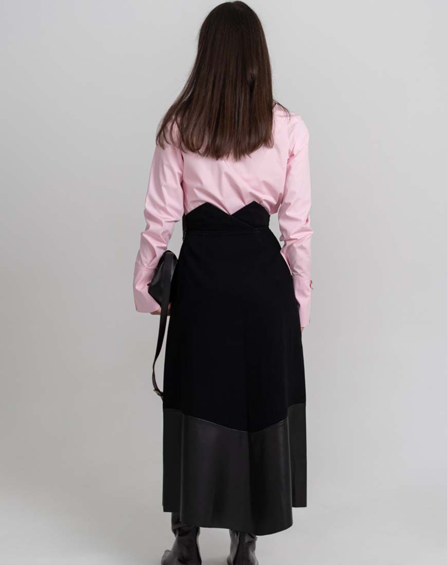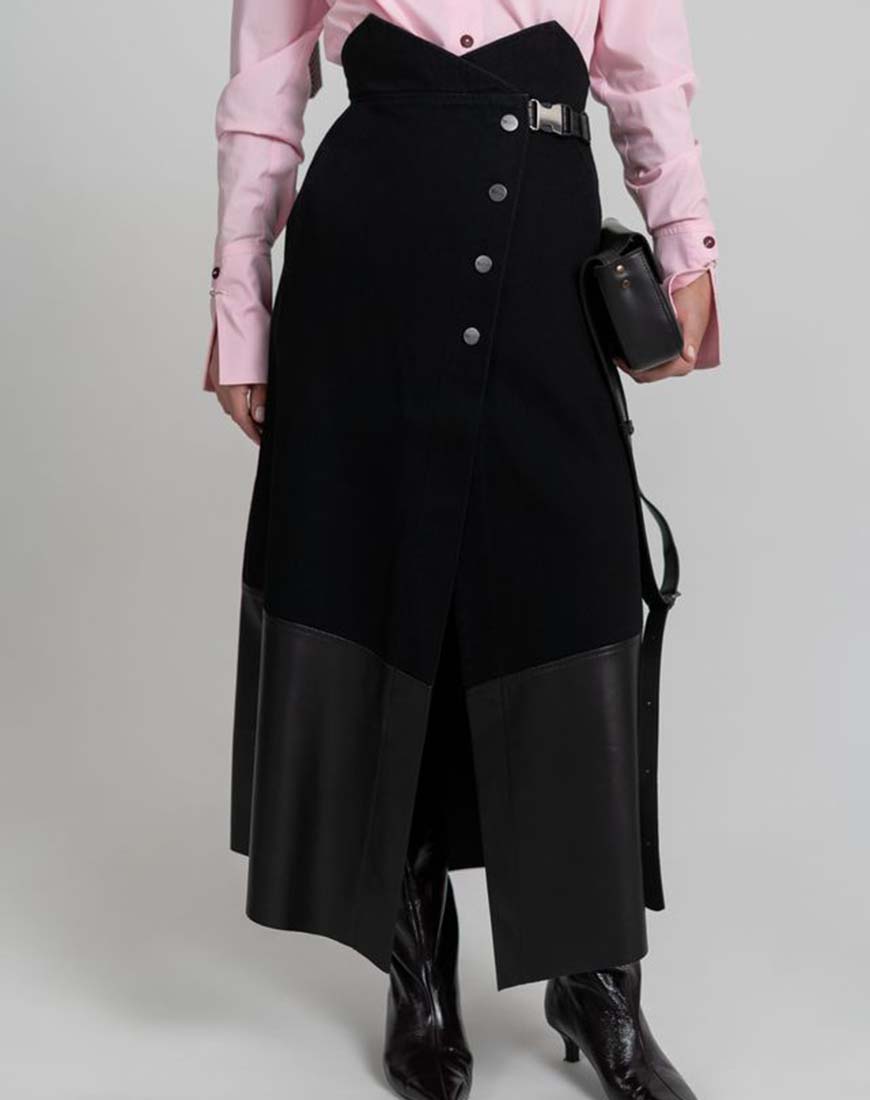Доставка в течение 2-5 рабочих днейМіді спідниця А-силуету з високою посадкою поєднує класичний крій і сучасні матеріали. Верхня частина виконана з щільного чорного деніму, нижня — з гладкої екошкіри, що створює чіткий візуальний контраст. Асиметричний пояс із металевою пряжкою формує виразний акцент на талії, застібка на кнопках. Модель доповнена функціональними кишенями.
