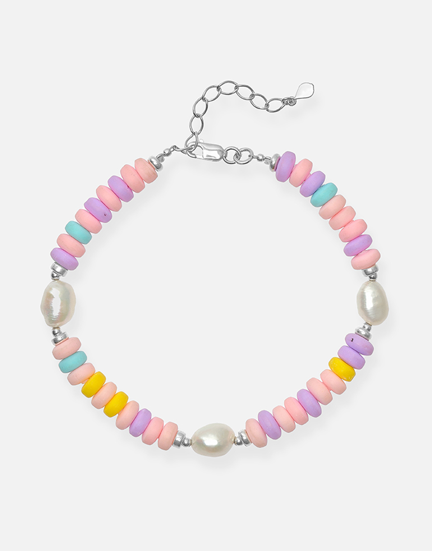 Доставка впродовж 2-5 робочих днівАнклет Wanderlust створений із пастельних намистин із полімерної глини, доповнених вставками з натуральних перлин та фурнітурою зі стерлінгового срібла 925. Поєднання яскравих кольорів і перлових деталей робить прикрасу літньою, грайливою та легкою в носінні.