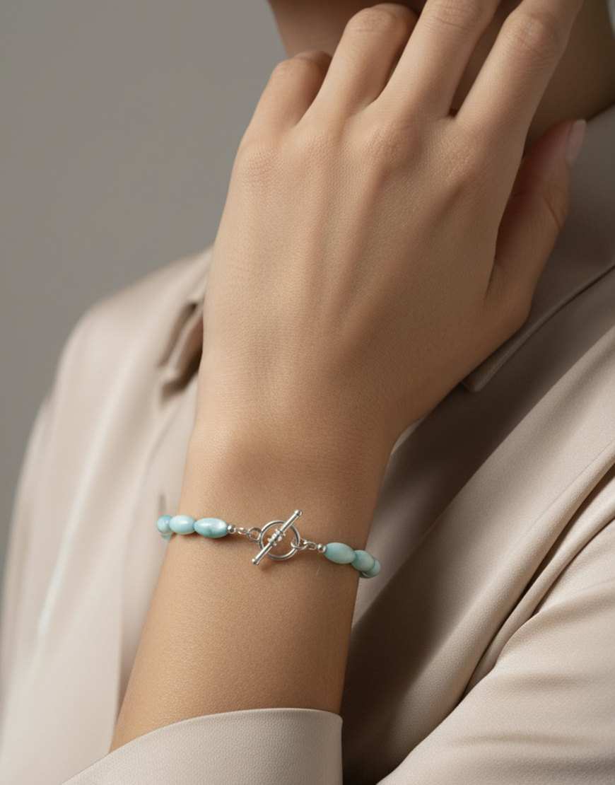 Браслет зібраний вручну та застібається на срібну застібку-тогл, що додає лаконічності й акценту.