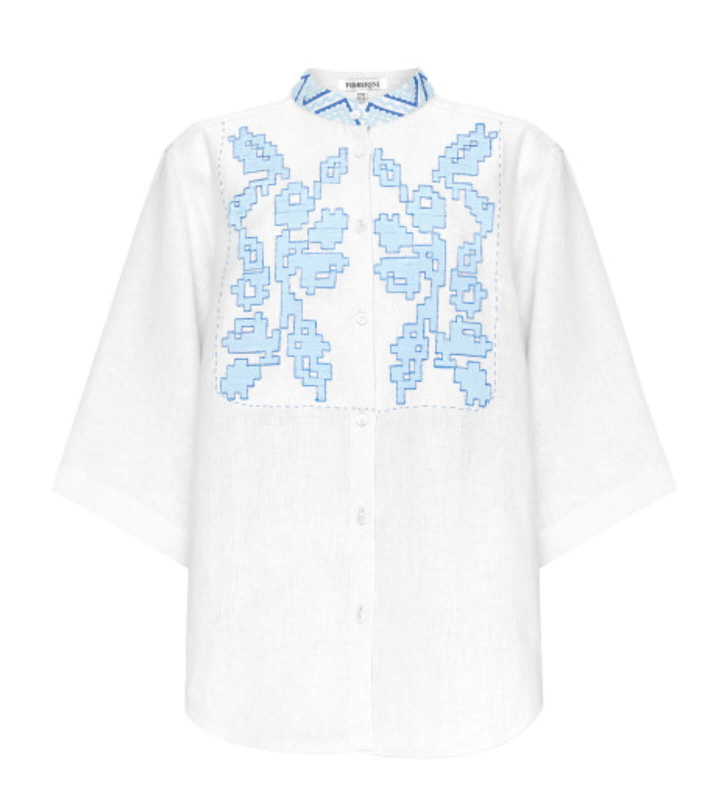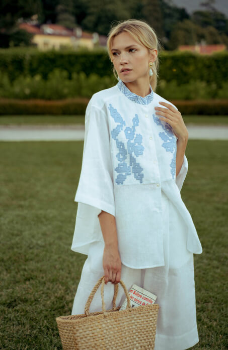 Літній костюм із вишивкою з льону. Складається з сорочки вільного крою та подовжених шортів на зручній гумці із засувками. Комір-стійка і передня частина сорочки прикрашені автентичною вишивкою з ручними стібками. Цей комплект підійде для відпочинку та прогулянок містом.