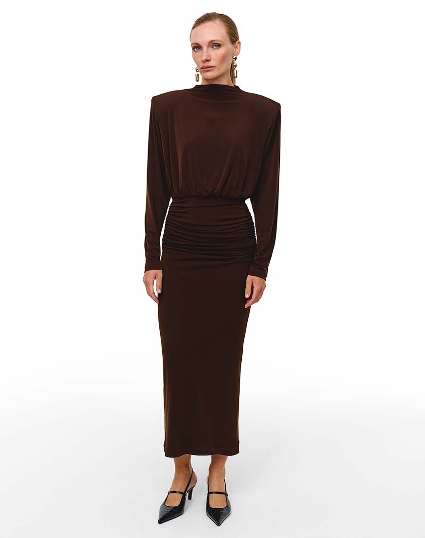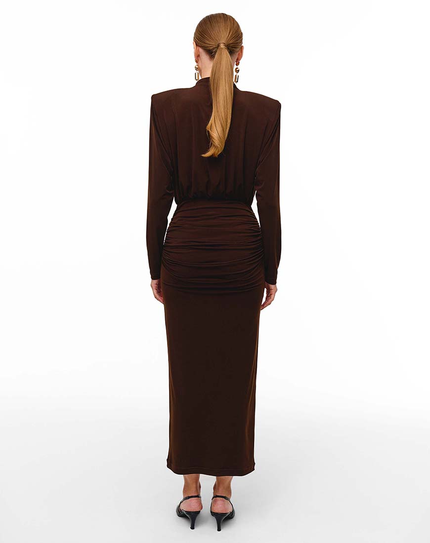 Доставка від 14 днівСукня є ідеальним втіленням сучасної драматичності та розкішної елегантності. Виготовлена з преміального струмливого матеріалу глибокого шоколадного відтінку. Дизайнерська архітектура підкреслена чіткою лінією плечей і майстерними драпіруваннями на талії, що візуально створюють ефект пісочного годинника. Бездоганний крій гарантує ідеальну посадку.