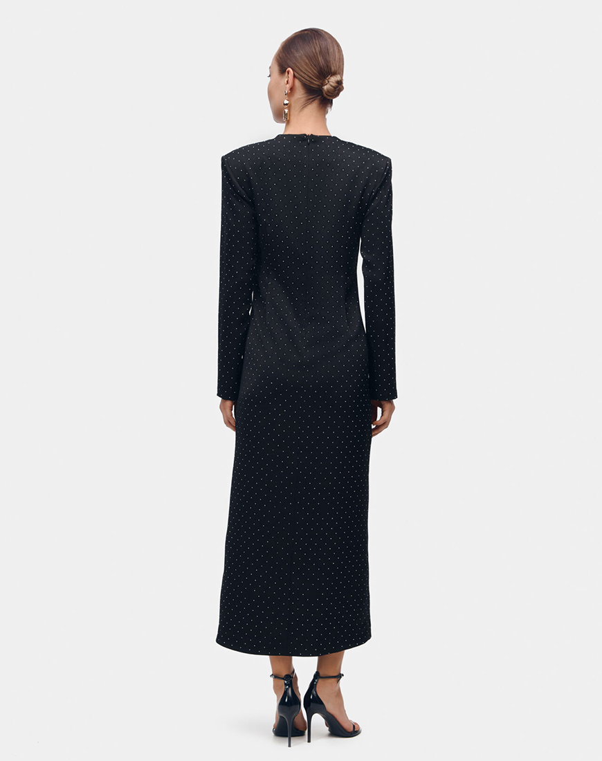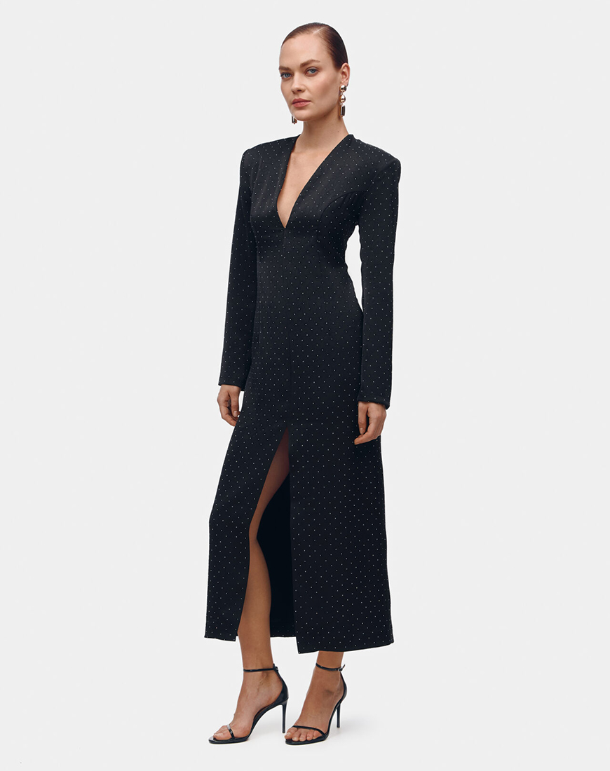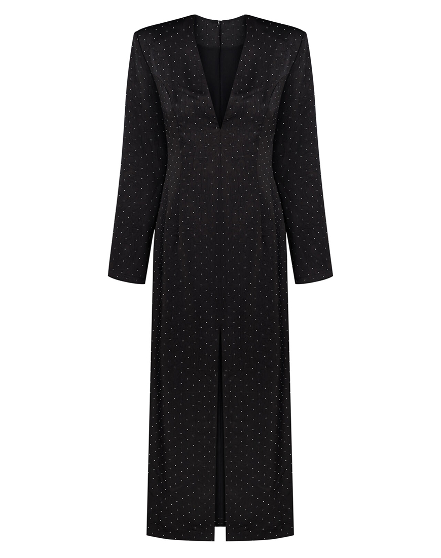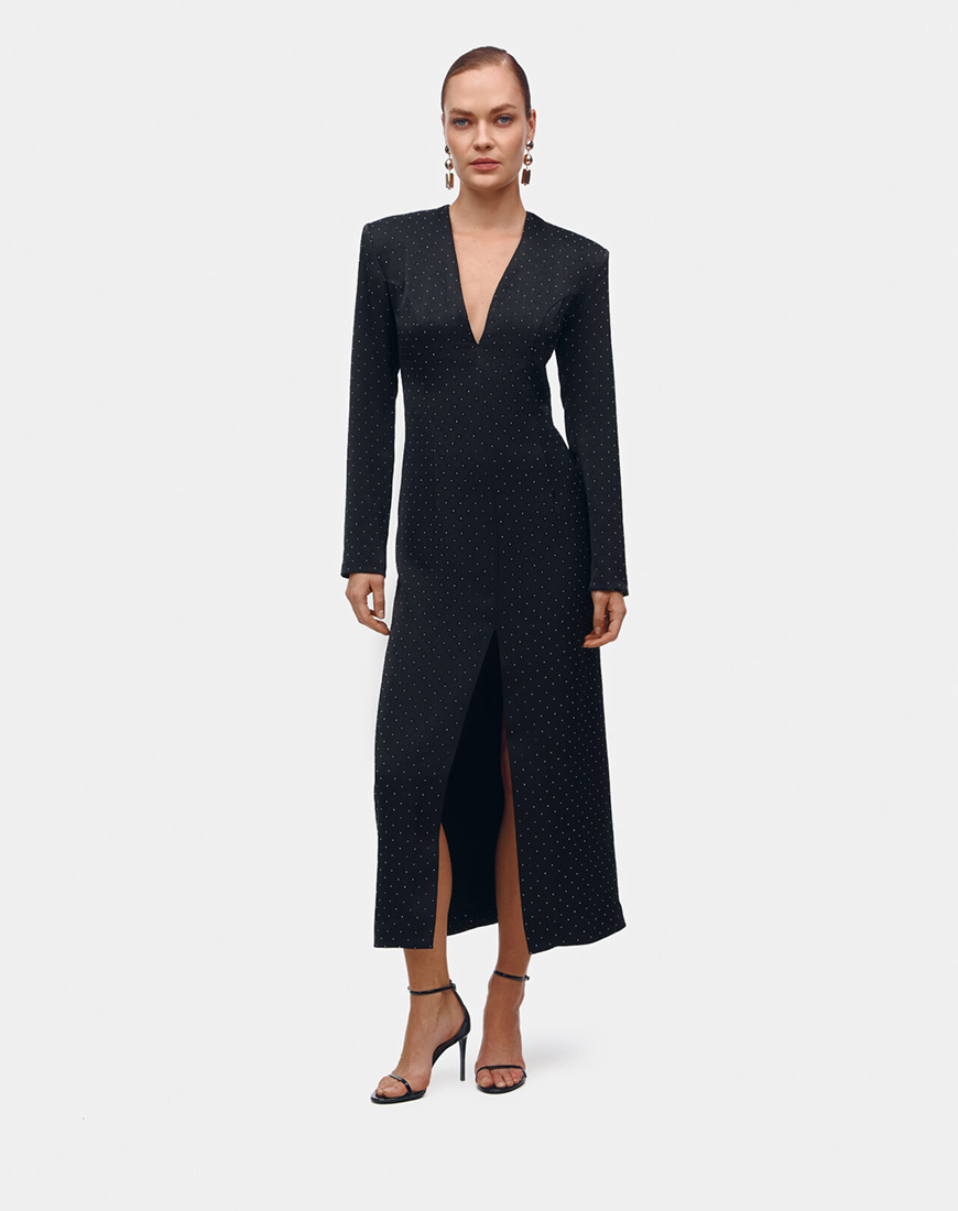 Доставка від 14 днівСукня міді, з глибоким V-подібним вирізом декольте та високим розрізом спереду. Еластичний матеріал глибокого чорного кольору, прикрашений делікатним сяйвом страз. Виразні підплічники візуально подовжують силует та створюють чітку лінію, додаючи образу сили. Довгі рукава балансують відкрите декольте.