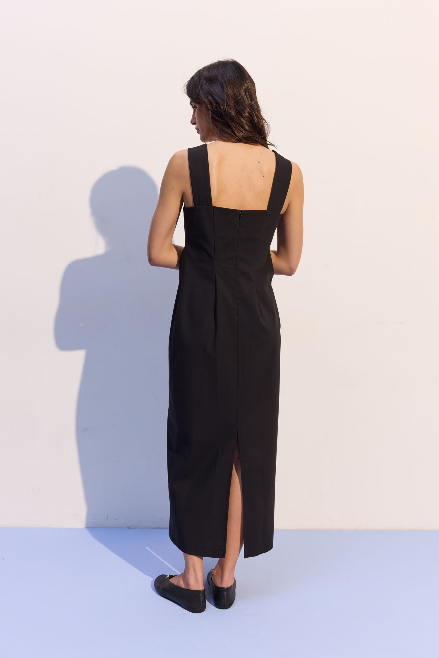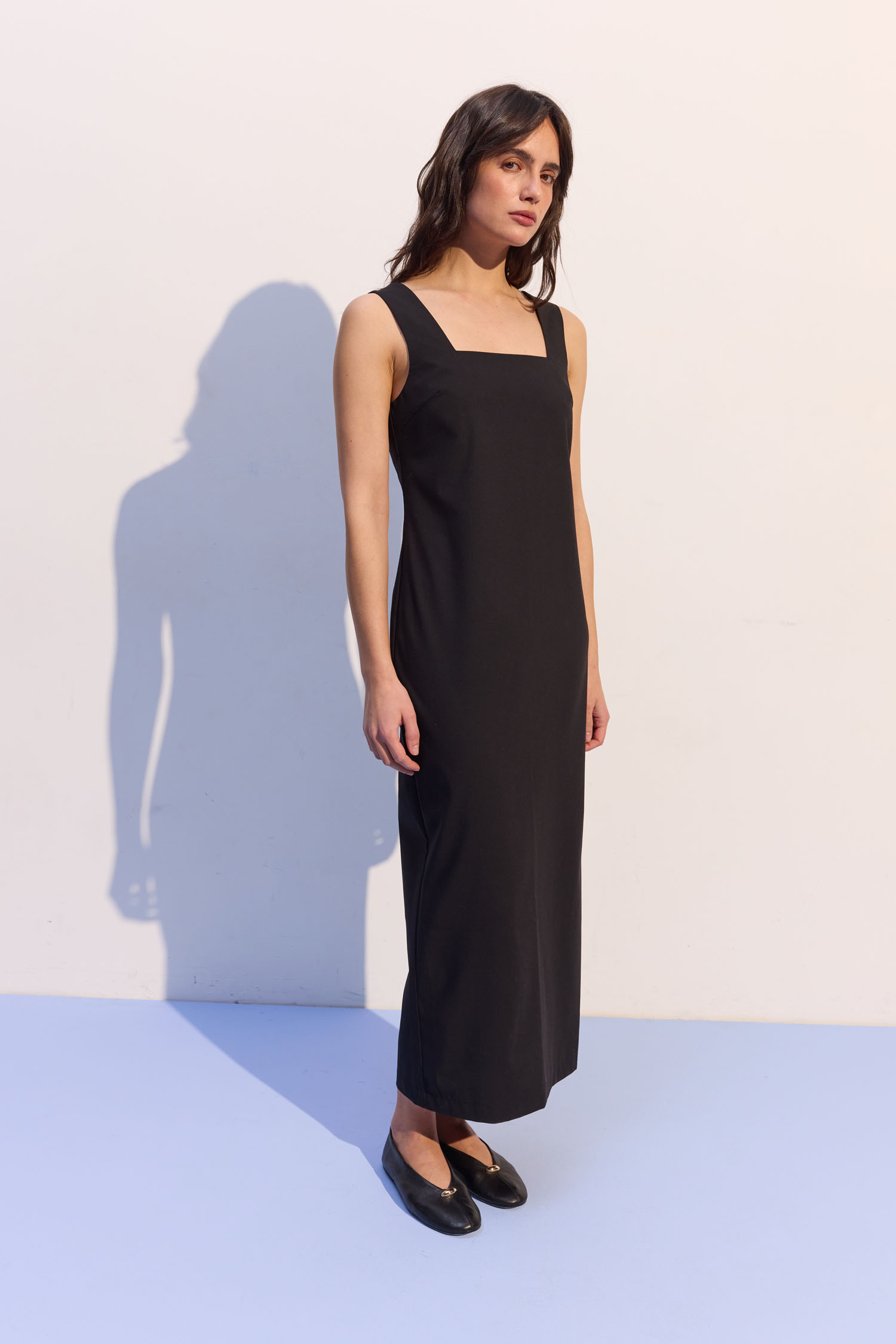 ДоставкаСукня міді чорного кольору з широкими бретелями та квадратним вирізом.