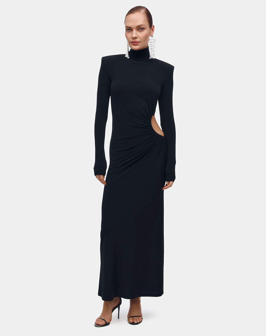 Доставка від 14 днівГоловний акцент – асиметричний бічний виріз на талії, який демонструє витончену лінію фігури. Високий комір-стійка та акцентовані, чітко окреслені плечі з підплічниками формують сильний силует, балансуючи з відкритістю талії. Тонке драпірування в зоні талії м’яко збирає тканину до вирізу, підкреслюючи талію і забезпечуючи ідеальну посадку по фігурі.