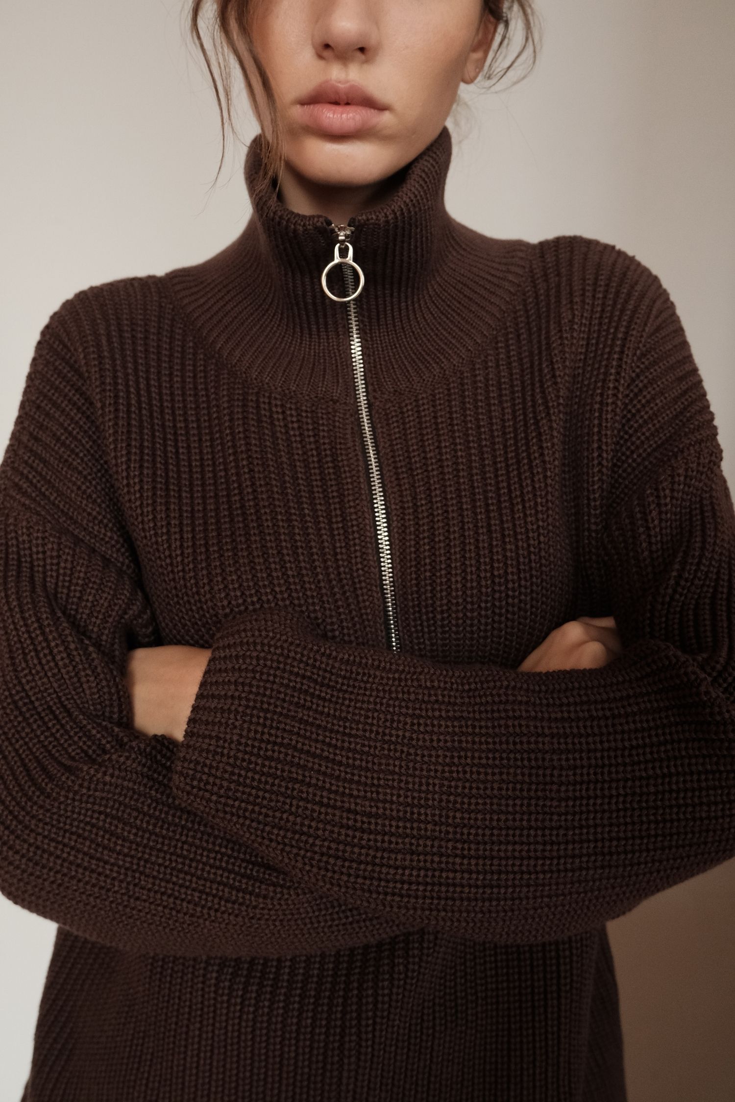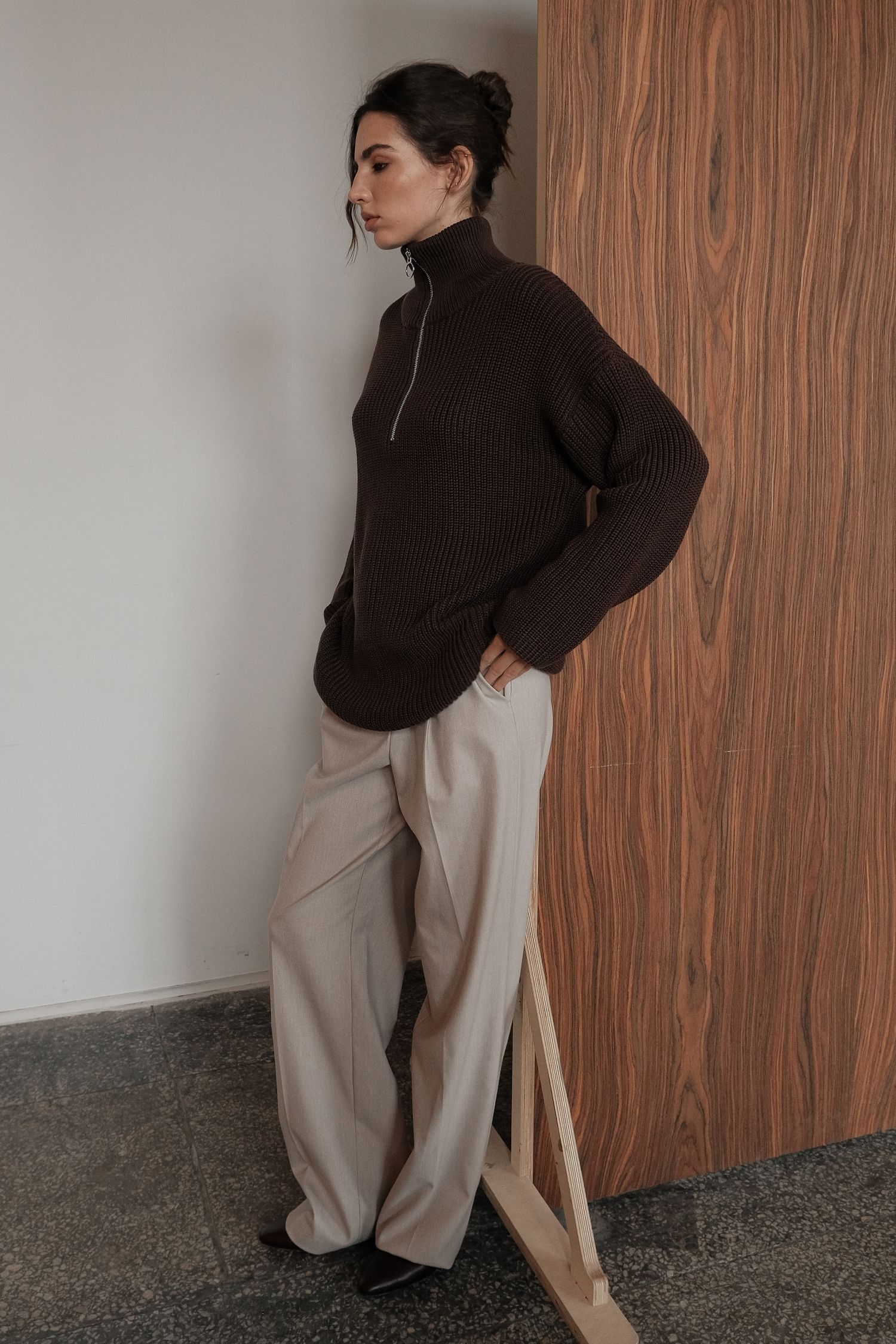 ДоставкаЖіночий трикотажний светр шоколадного відтінку, виготовлений із 100% бавовняної нитки. Фасон оверсайз з високим коміром, що застібається на блискавку. М’який на дотик і комфортний у носінні. Теплий і затишний варіант для щоденного використання, який добре поєднується зі спідницею, брюками або джинсами.