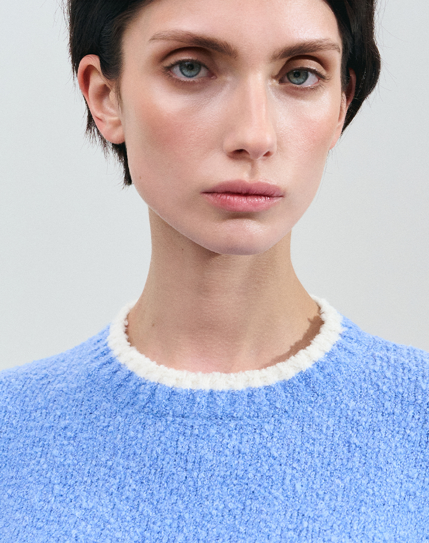 Трикотажний светр у небесно-блакитному кольорі — це втілення легкості та делікатного затишку. Завдяки гармонійному поєднанню натуральної вовни та бавовни, модель має особливу м’якість і забезпечує комфортну терморегуляцію в будь-яку пору року. Приталений силует з короткими рукавами створює витончений жіночний образ, який однаково вдало виглядає як самостійний елемент, так і в поєднанні з жакетами чи кардиганами. Класичний круглий виріз та охайна окантовка в рубчик додають виробу завершеності, підкреслюючи високу якість трикотажного полотна. Чистий блакитний відтінок додає образу свіжості та спокою.