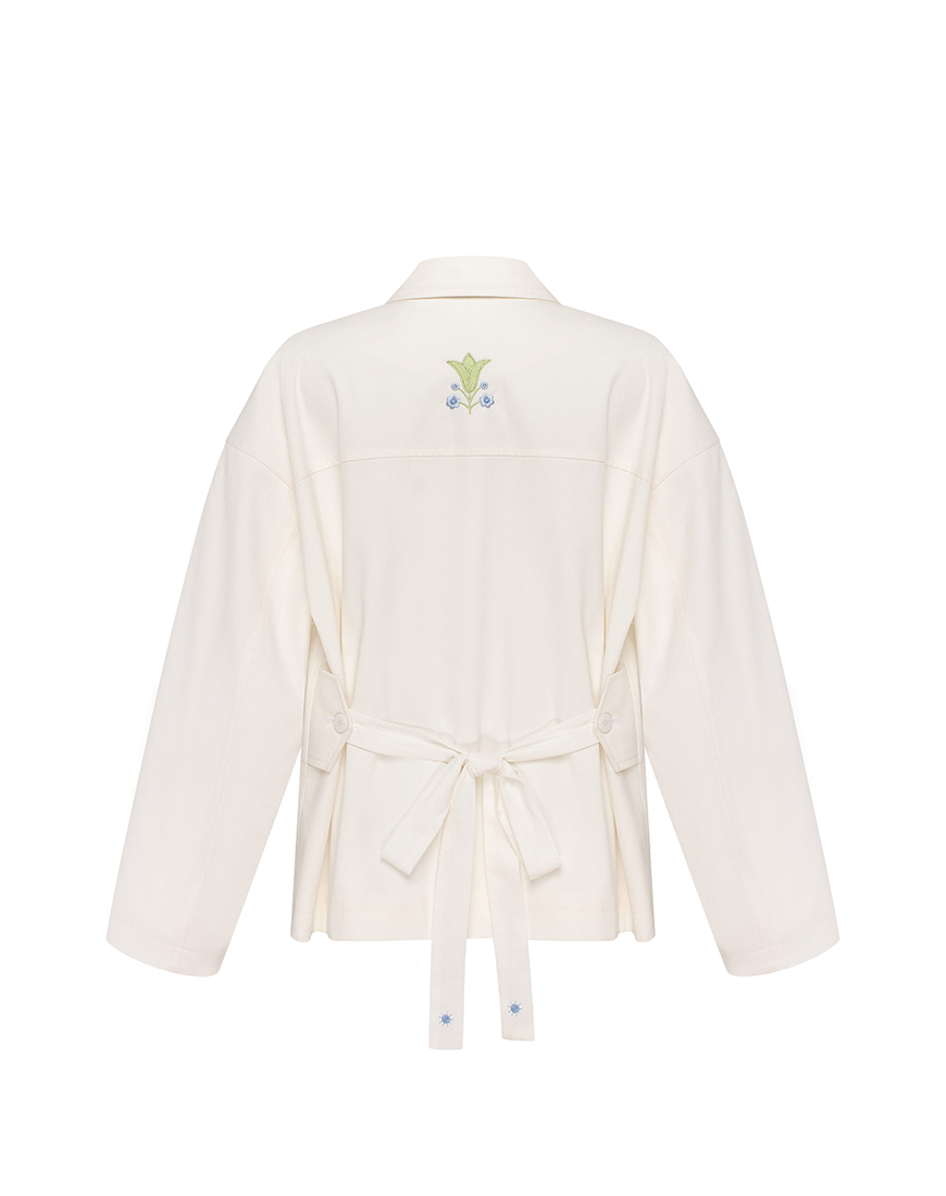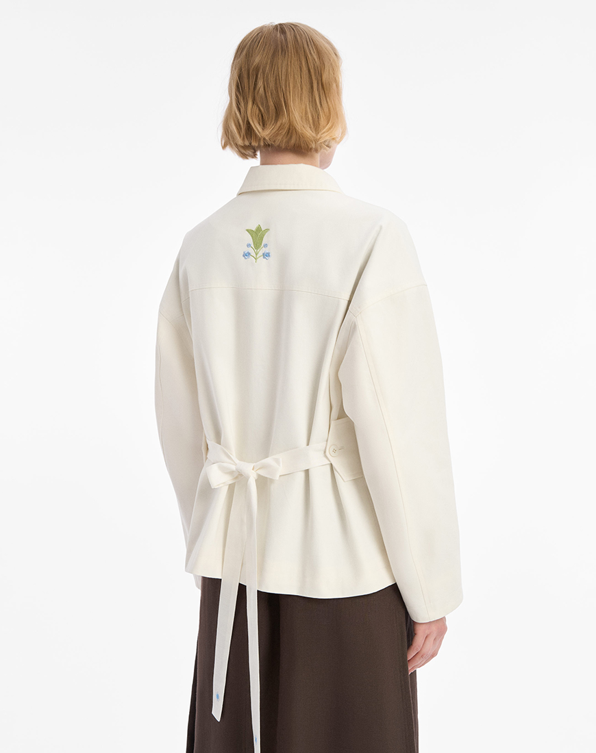 Особливістю цієї куртки є знімні лляні стрічки, що кріпляться на пояс або комір. На поясі вони дають змогу змінювати силует — від вільного до приталеного. А на комірі — стають делікатним акцентом у вигляді банта.