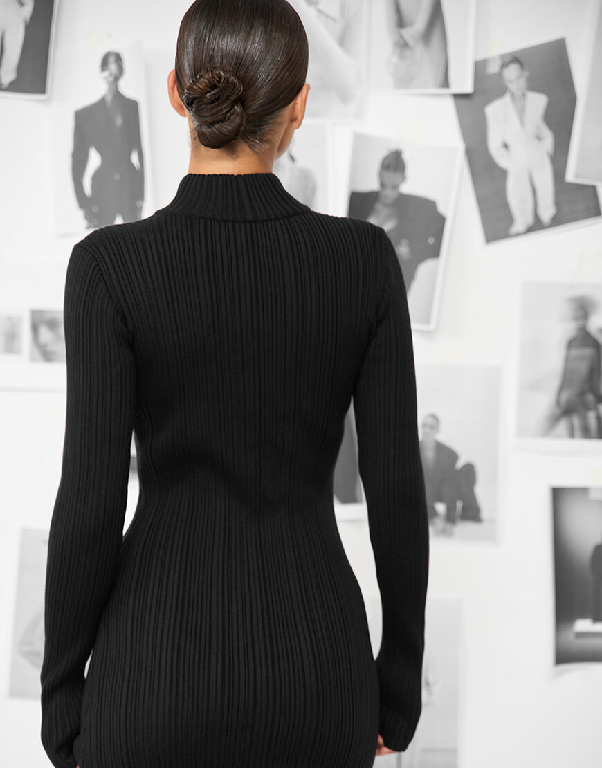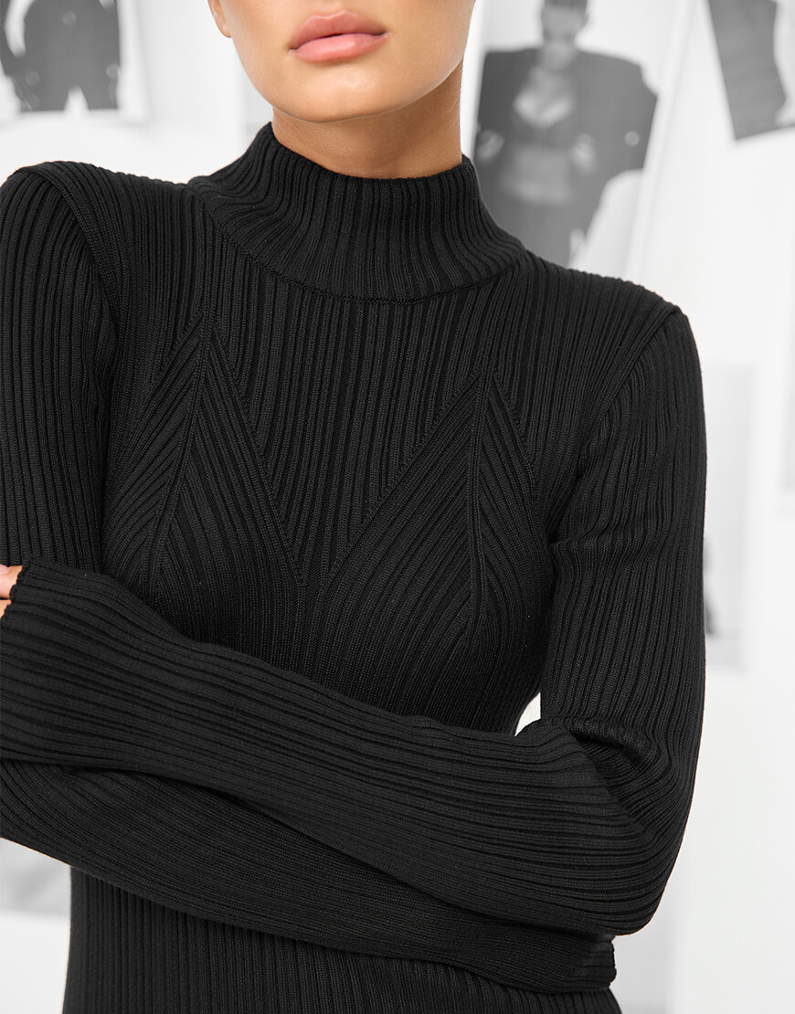 Трикотажна сукня міді з високим розрізом, виконана з віскози преміум якості з додаванням акрилових волокон.