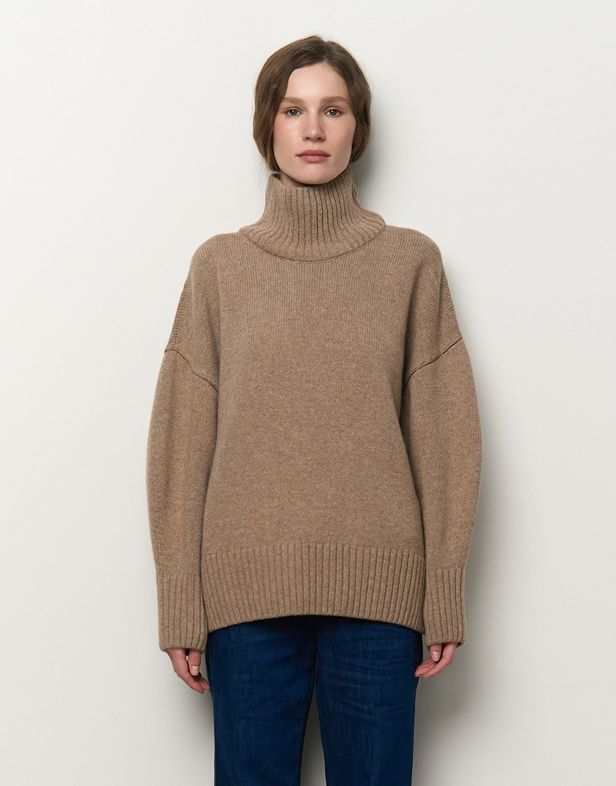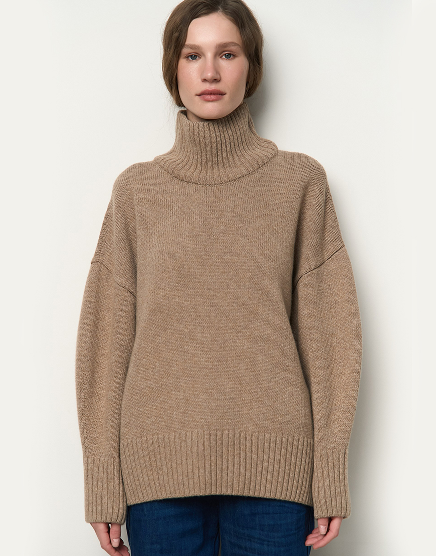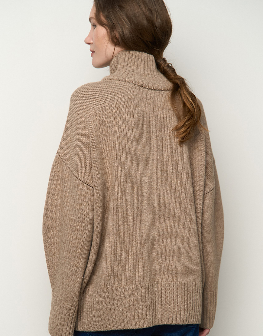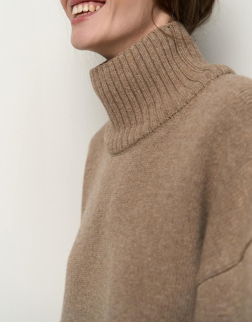 Mellow з високою горловиною. Матеріал цієї моделі – високоякісна вовна з невеликим відсотком віскози та поліаміду, завдяки чому гарно виріб тримає форму, має чудові теплоізоляційні властивості та гарну зносостійкість. Светр виконаний гладкою