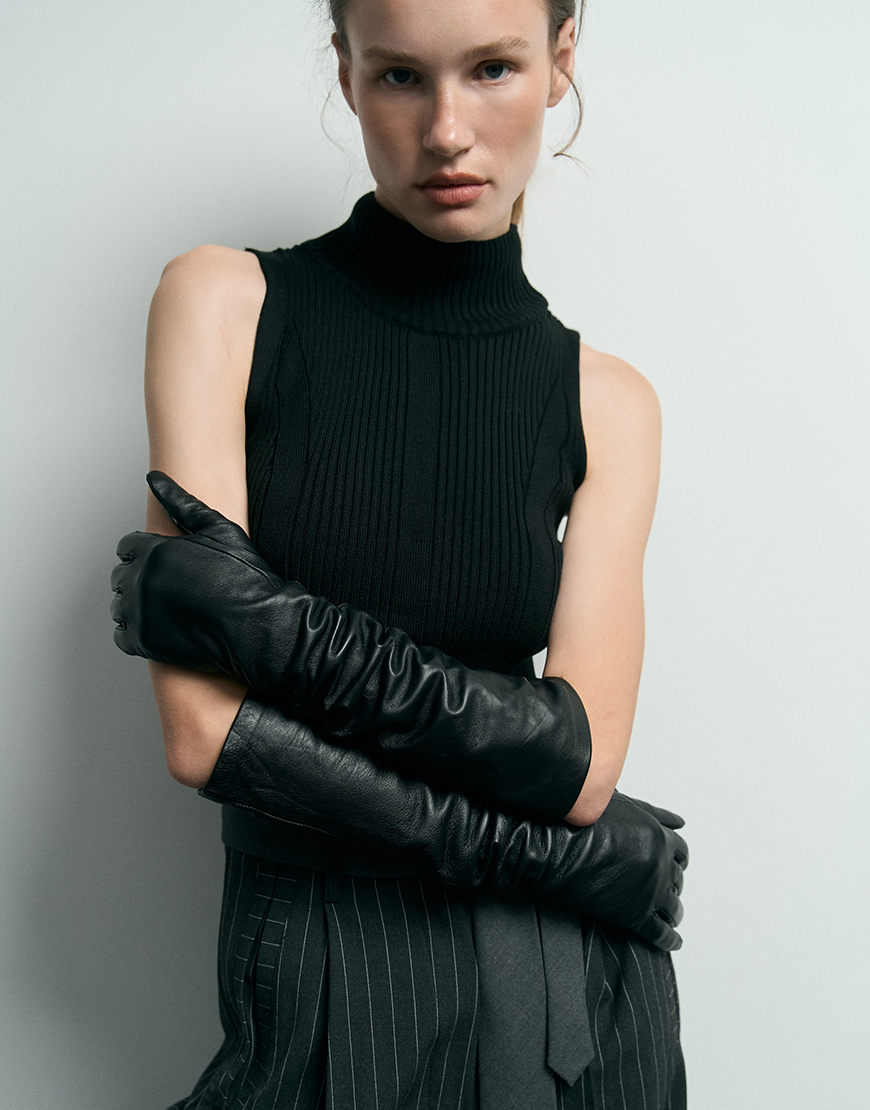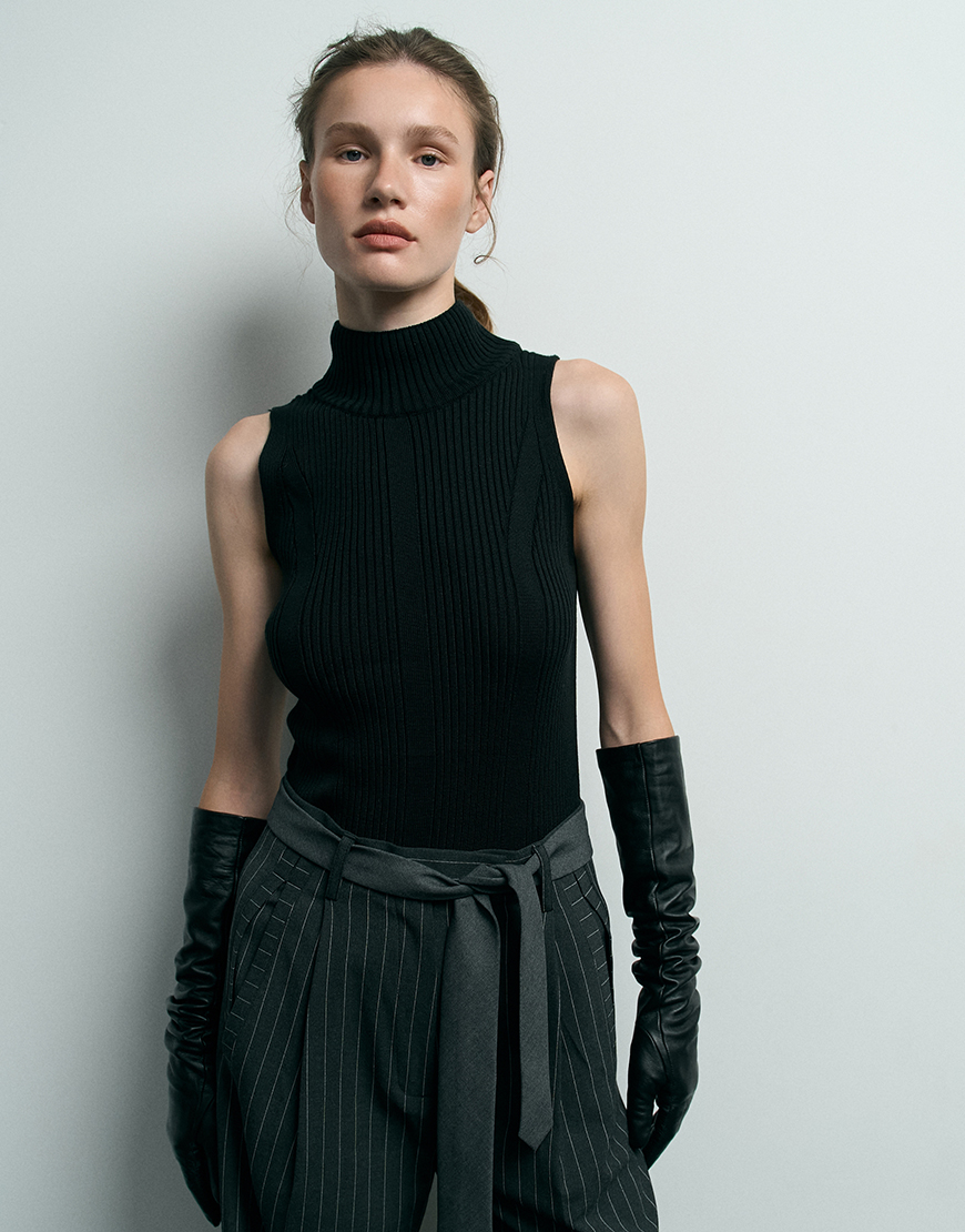 Базовий топ з тонкого трикотажу з середньої висоти горловини. Виготовлен з віскозної пряжі. Завдяки еластичності плетіння, гарно підкреслює фігуру.