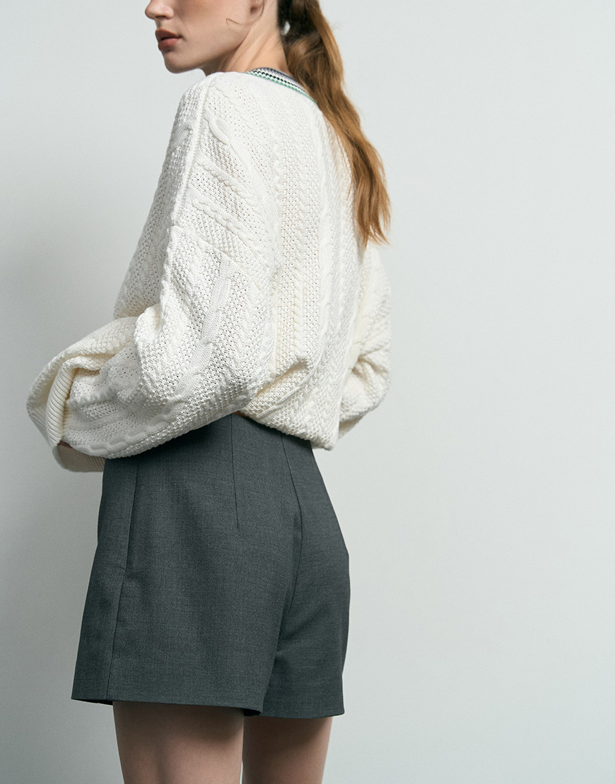 Вкорочені шорти з костюмної тканини, з потаємнимною блискавкою збоку. Висока лінія талії підкреслює силует. Лаконічна форма і чітка лінія роблять їх універсальною основою для образів. Чудово поєднується з