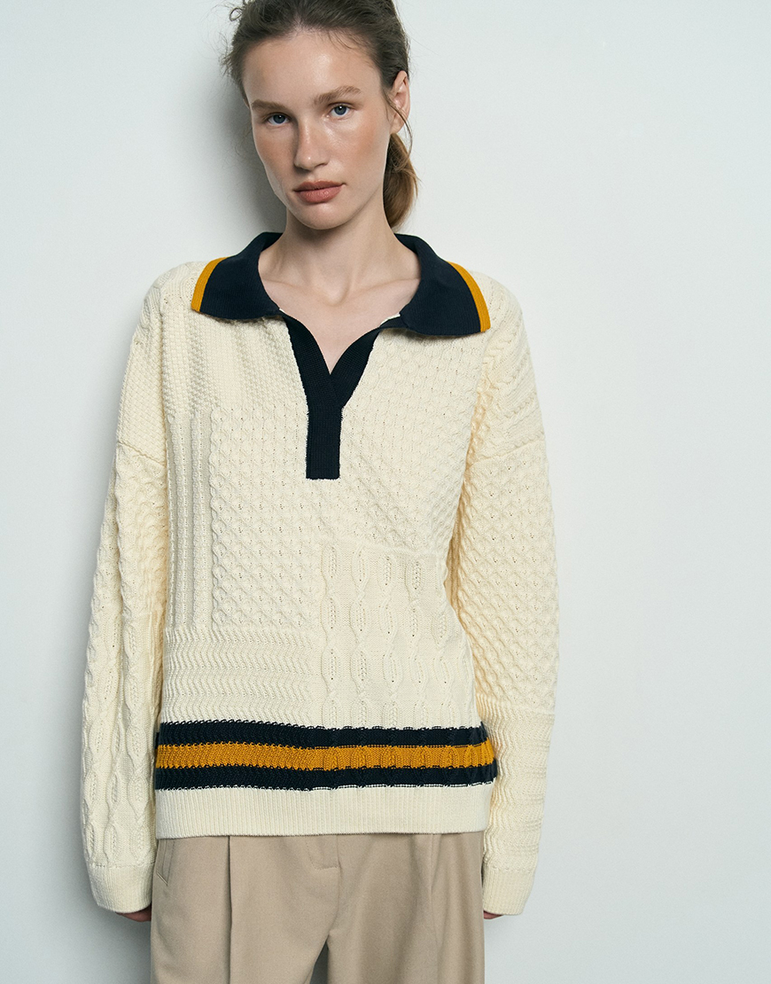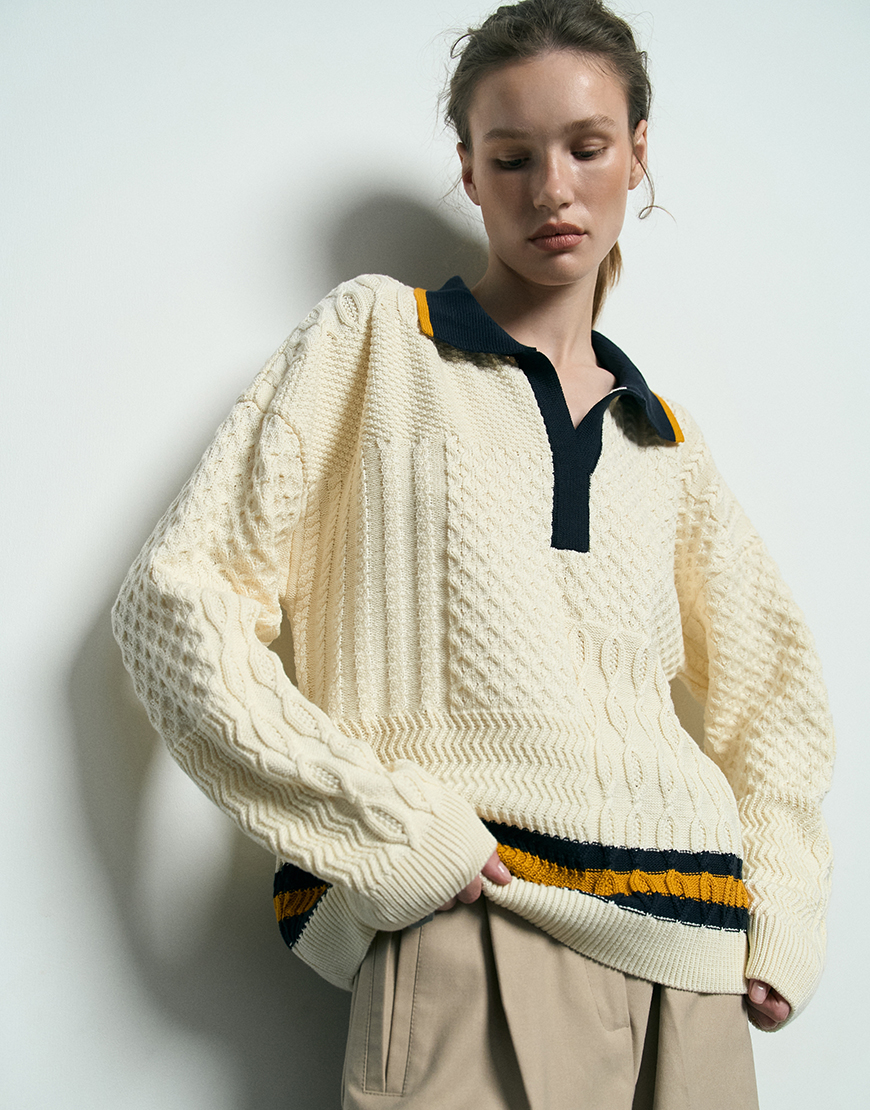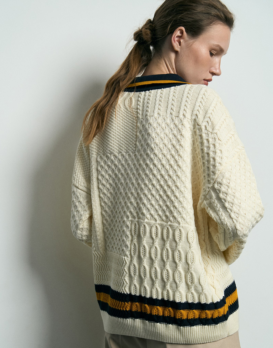 Светр вільного крою, виконаний у плетінні «коси» з акцентною горловиною мис, стане чудовим вибором для створення стильного та затишного образу.