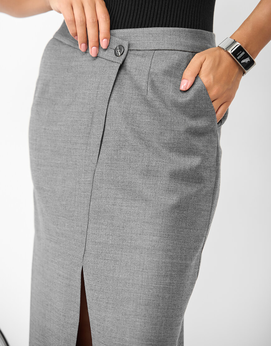 Доставка протягом 3-7 робочих днівСпідниця міді, пряма, з розрізом попереду та шліцою позаду, виконана з італійської костюмної тканини.