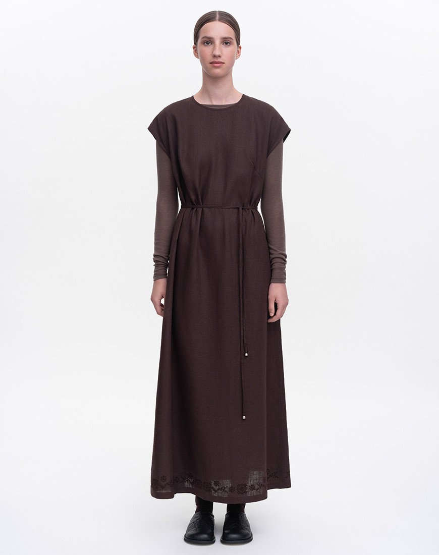 Монохромна вишивка в тон тканини оздоблює поділ, наслідуючи давні ручні стібки. Сукня має вільний крій, круглу горловину та короткі рукави. Її доповнює тонкий пояс із металевими намистинами.
