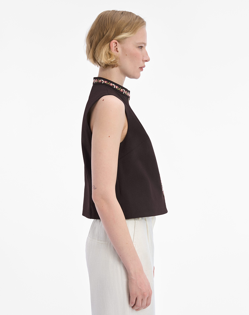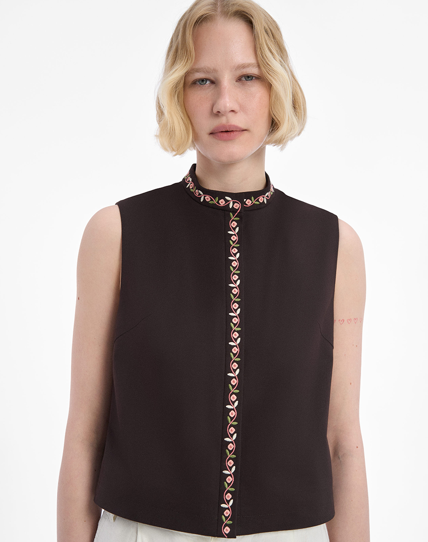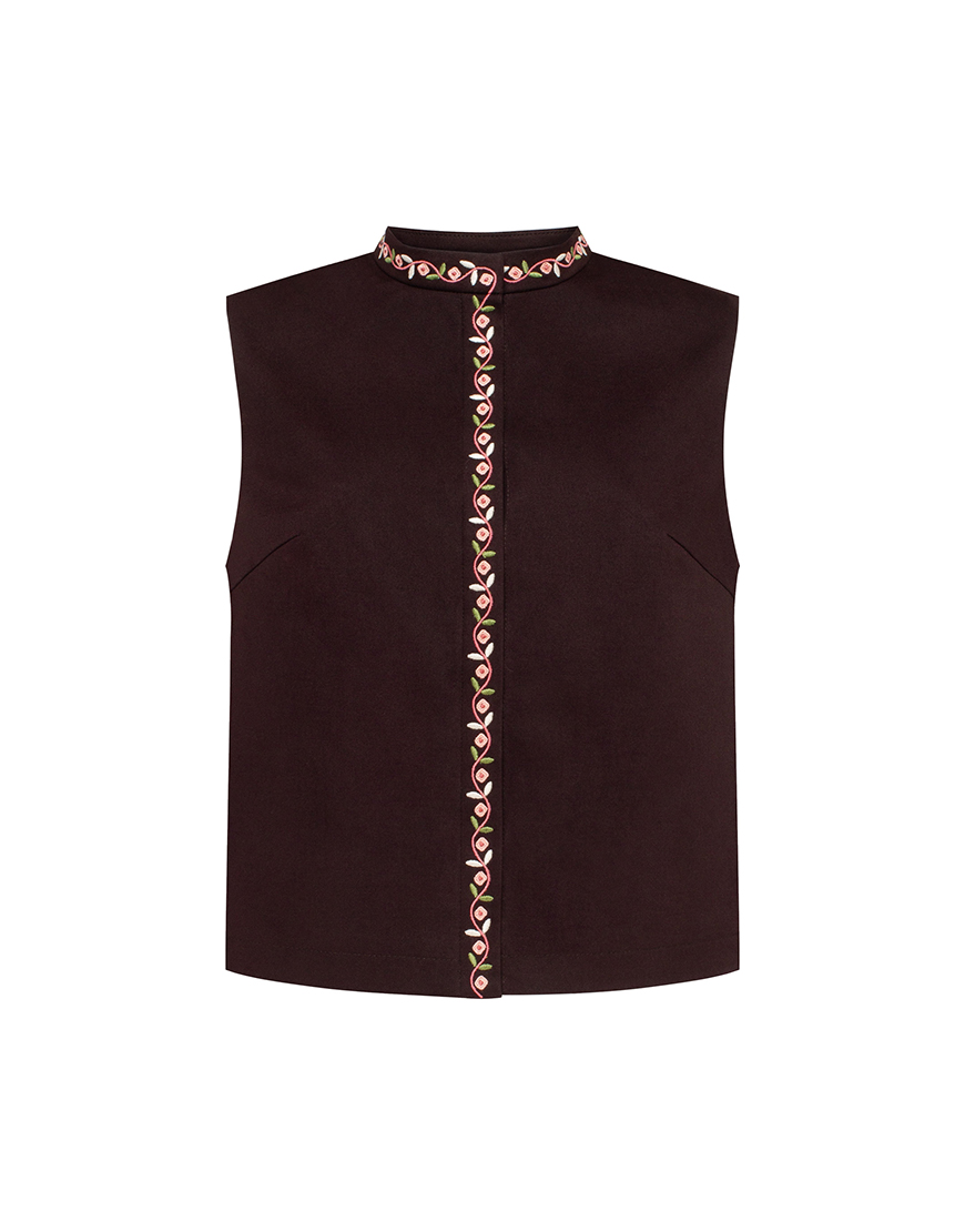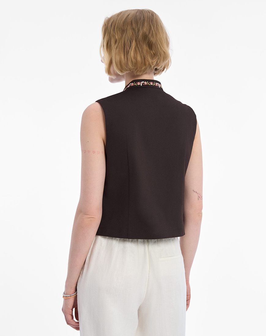 Жилет має дещо вкорочений силует, комір-стійку та потаємну застібку на кнопки.