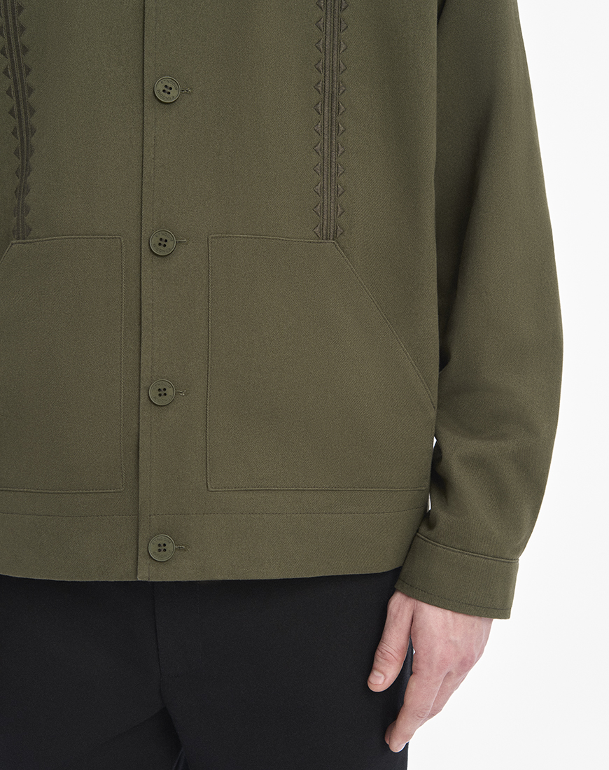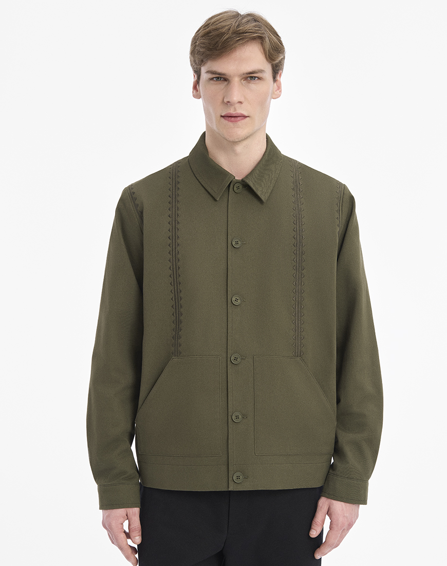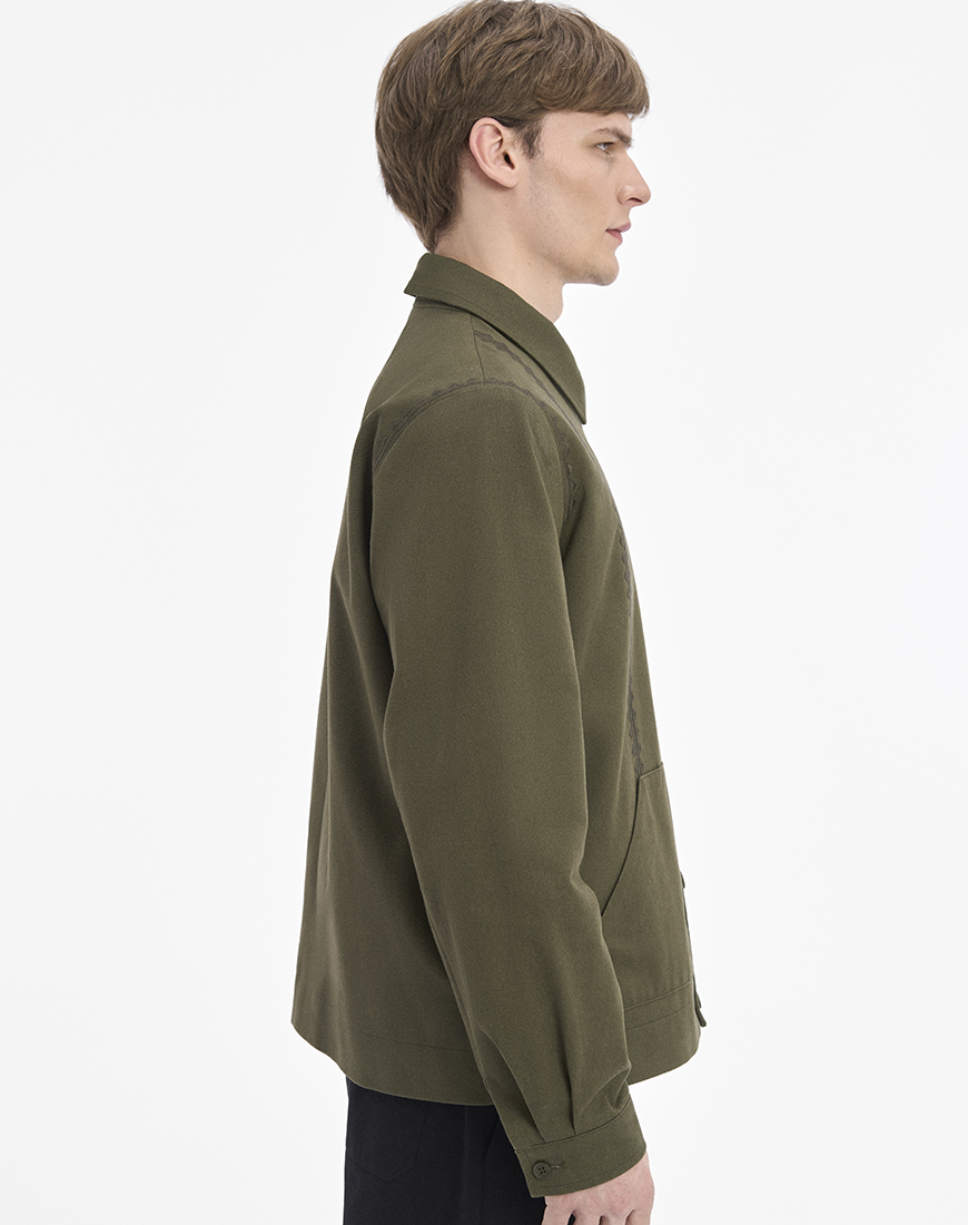 Темно-зелена куртка зі щільної бавовни, оздоблена геометричною вишивкою.
