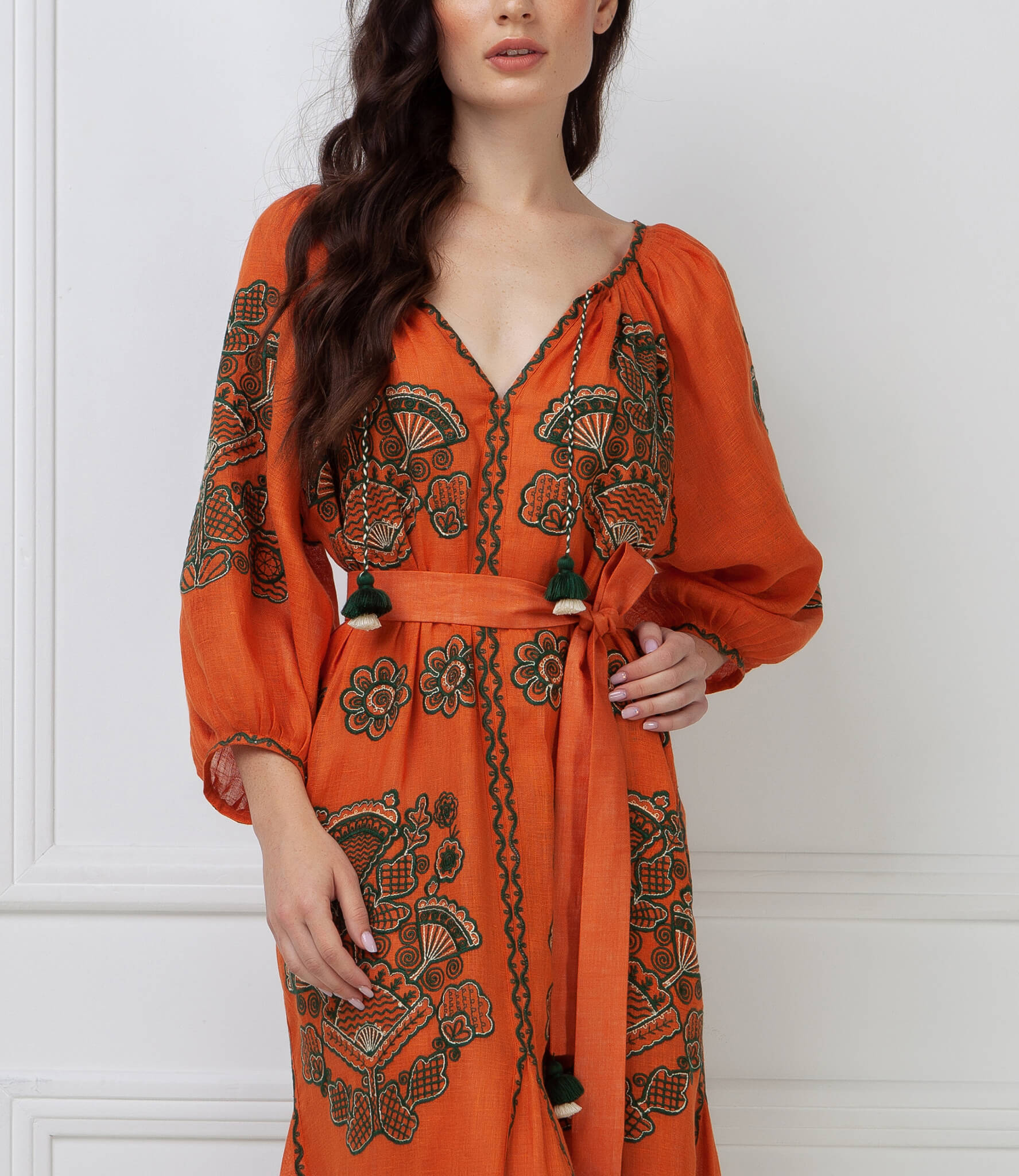 Вишита квітковим орнаментом зеленого та бежевого кольору по всій довжині виробу. Має рукави три чверті, зав’язки з кісточками на горловині. Вишуканий орнамент, легкий силует та стримане поєднання кольорів зроблять ваш образ елегантним.