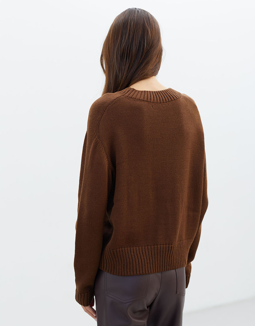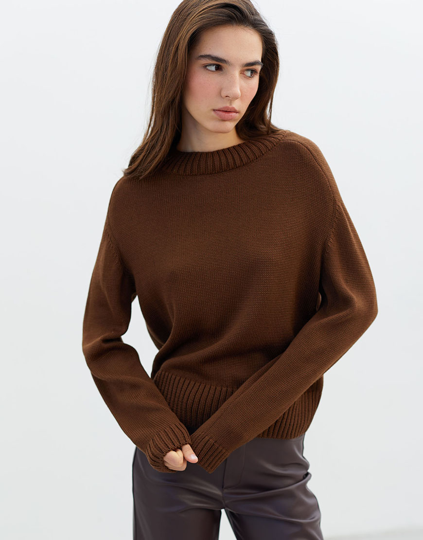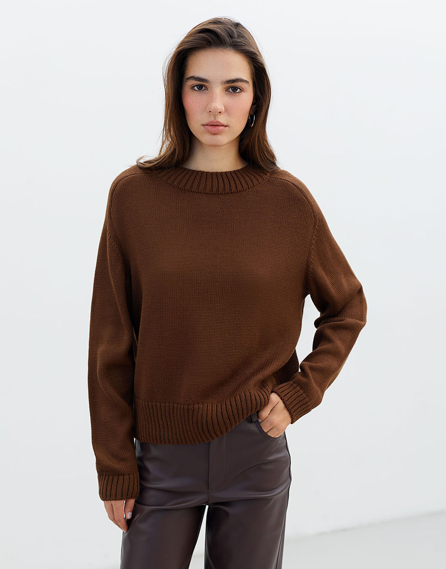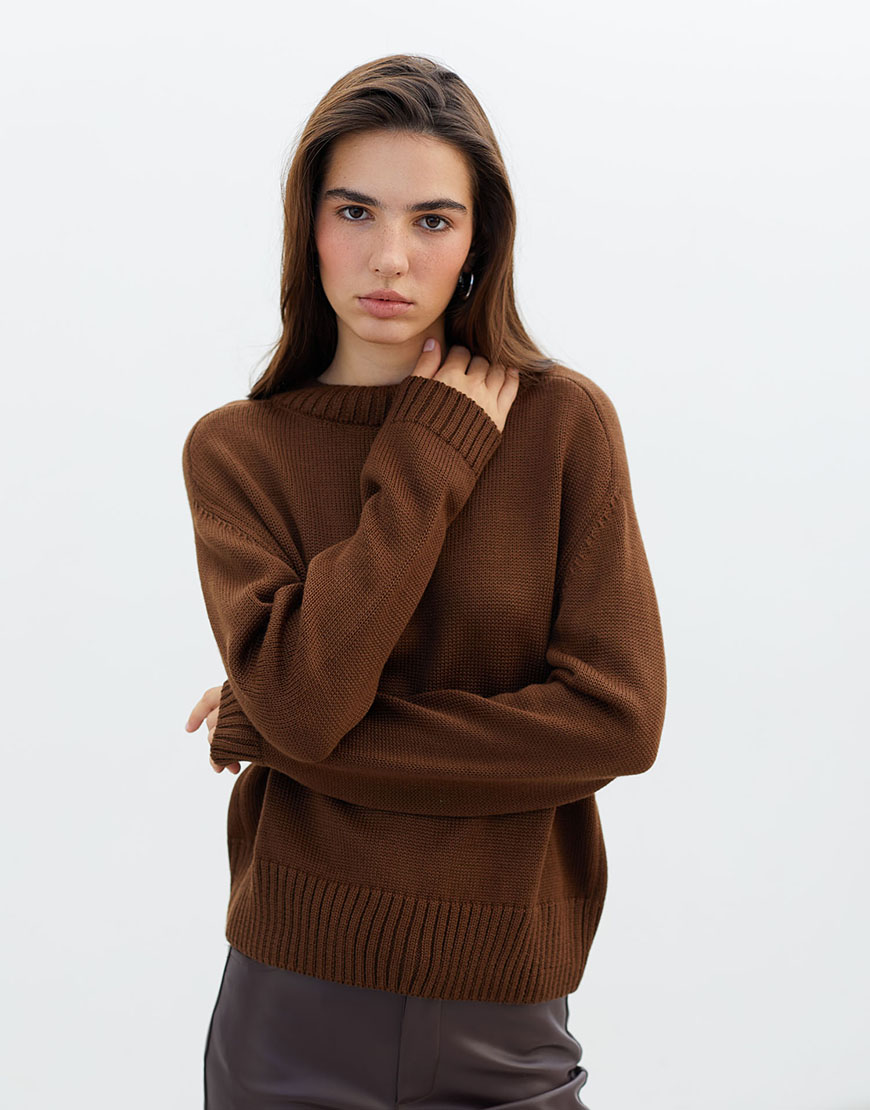 ДоставкаТеплий шоколадний джемпер THE LACE. Модель з круглим вирізом з напіввовняної пряжі. Затишний джемпер для зимових образів.