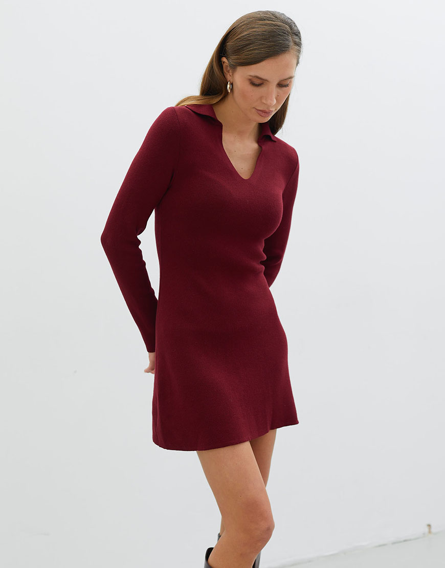 Трикотажна сукня довжини міні бордового кольору. Сукня з коміром поло та v-вирізом. Мінімалістична сукня для весняних образів.
