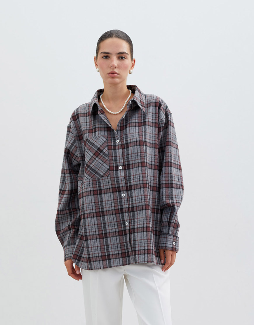 Сіра сорочка в червону клітинку з накладною кишенею. Стильна сорочка вільного крою на кожен день. Ідеально підходить до розслаблених повсякденних образів.