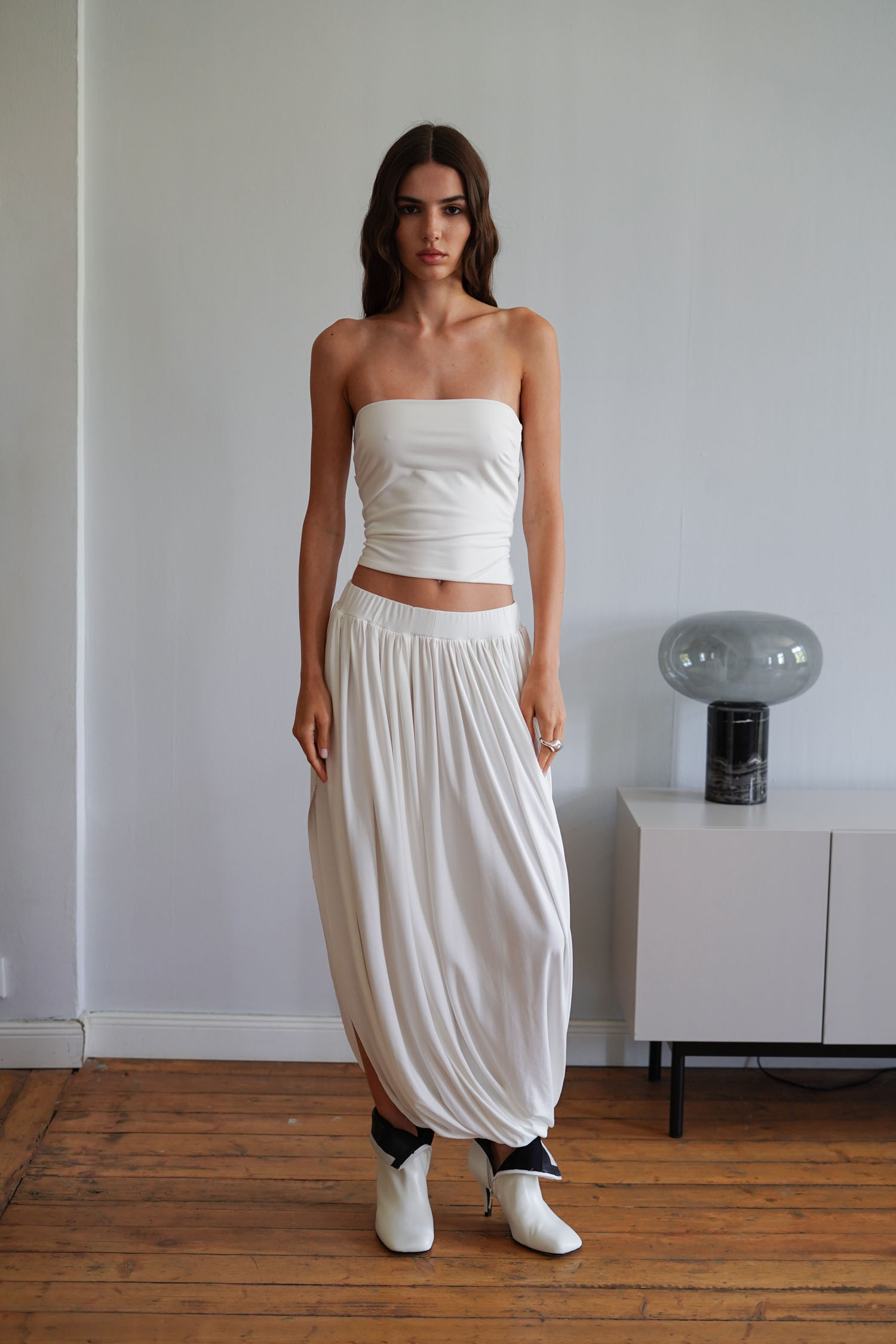 Подовжений жіночий топ-бандо в молочному відтінку. Зроблений із м’якого віскозного трикотажу. Силуетний крій щільно лягає по фігурі.