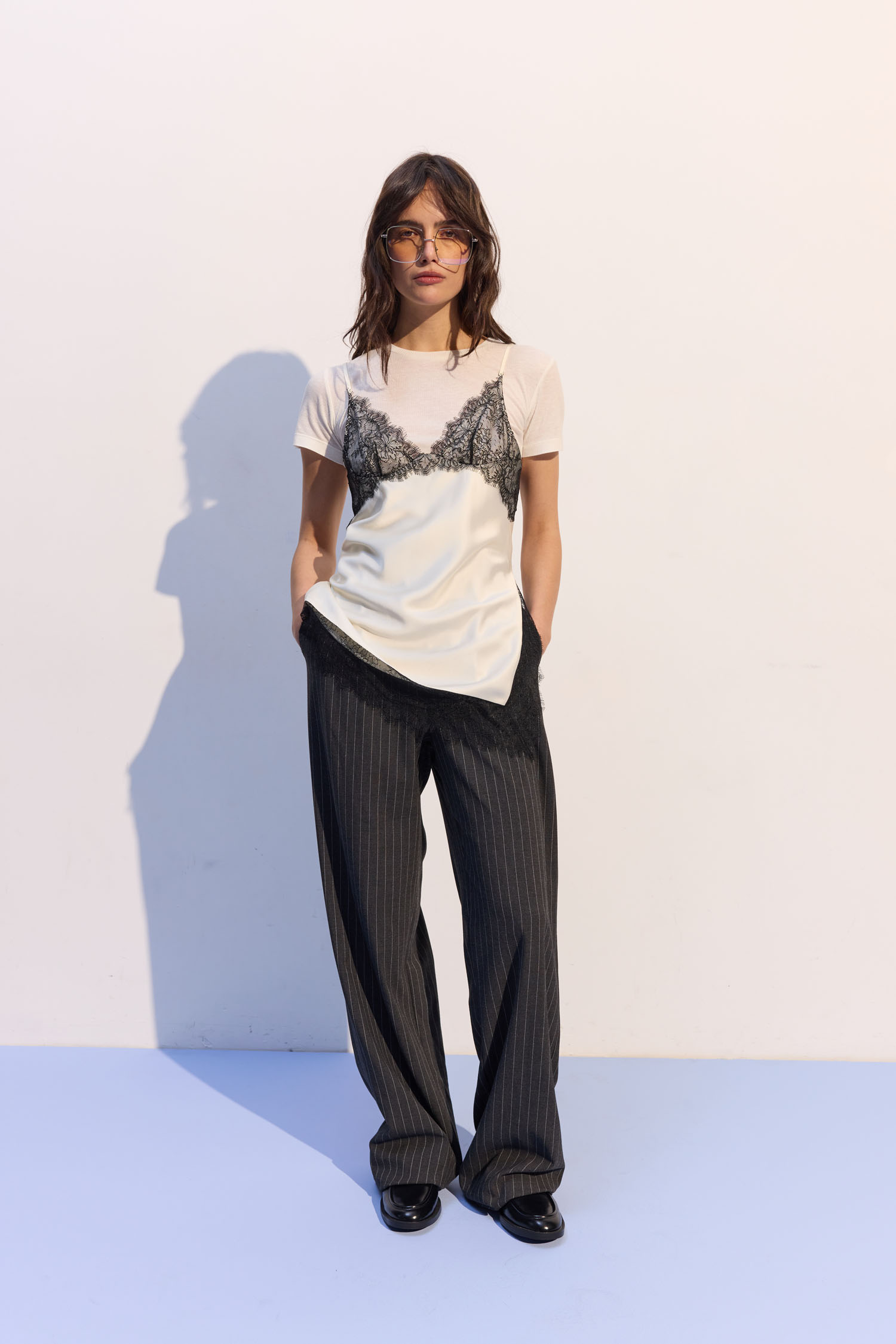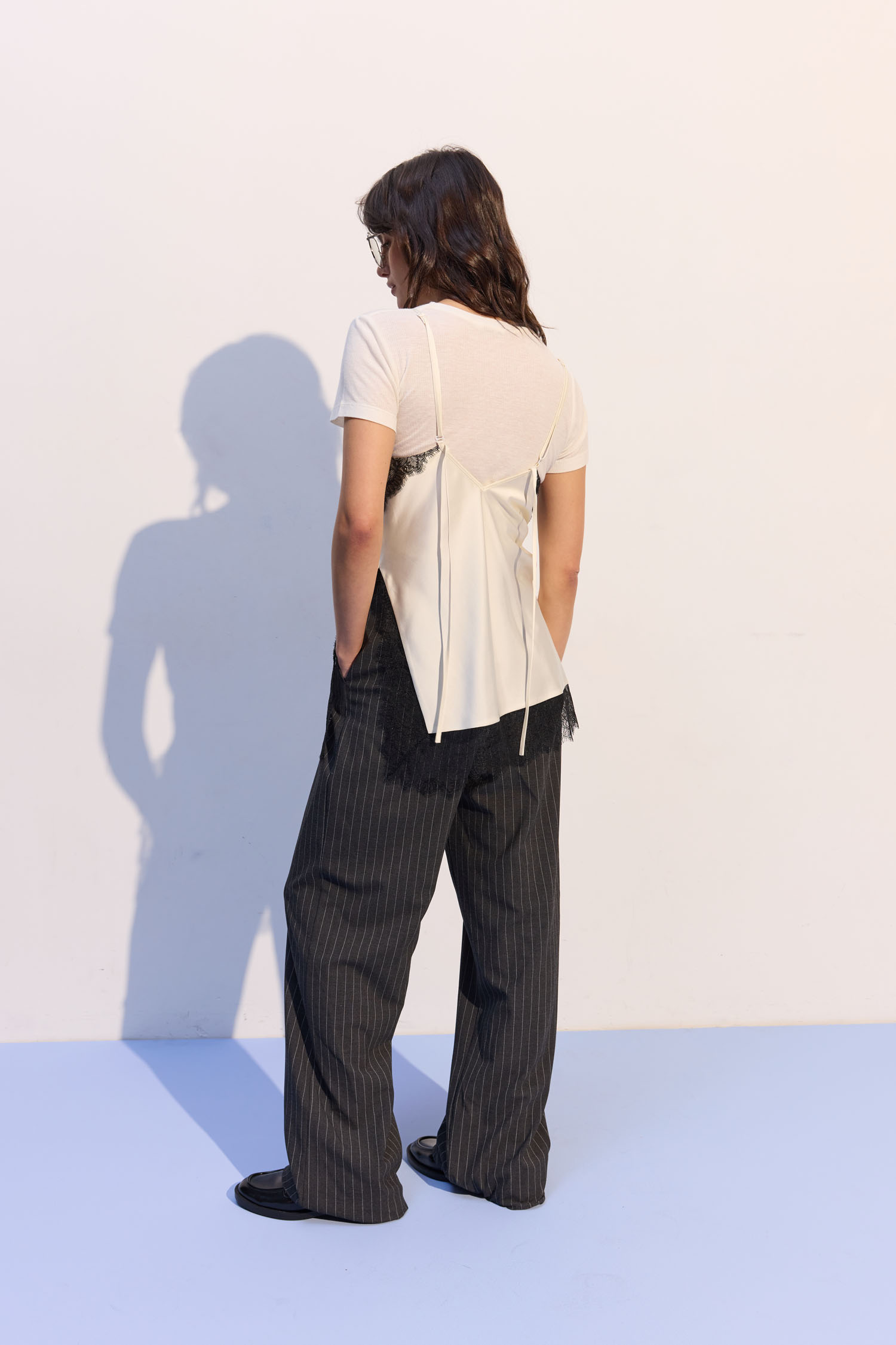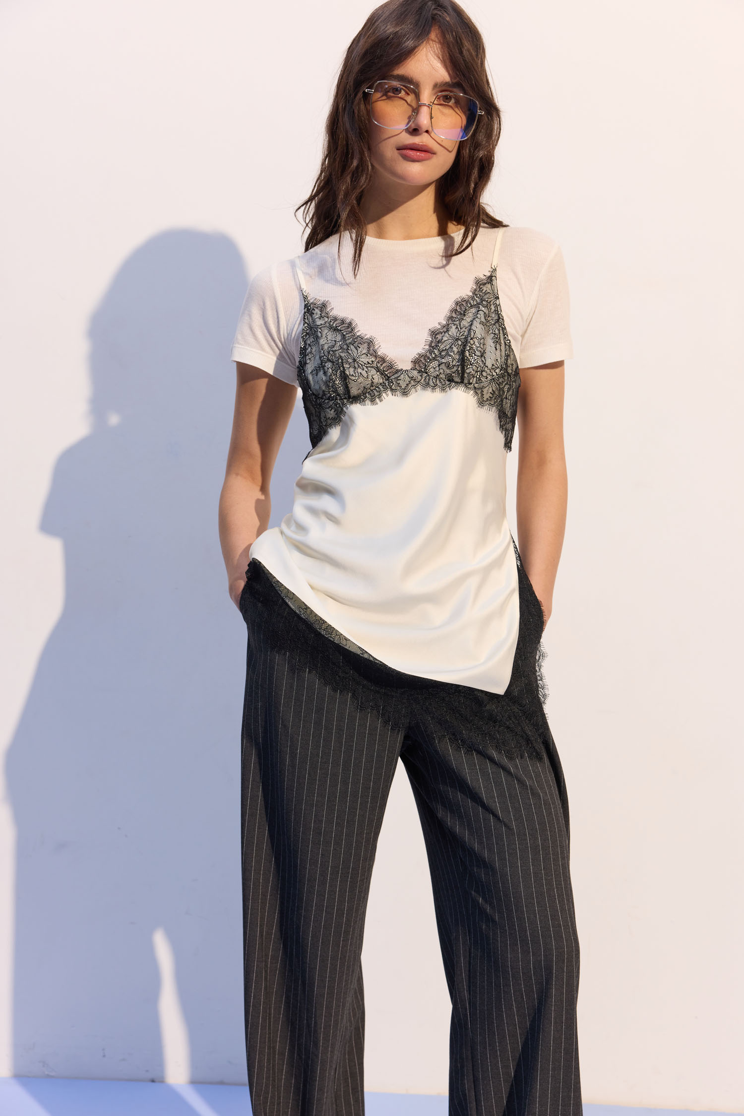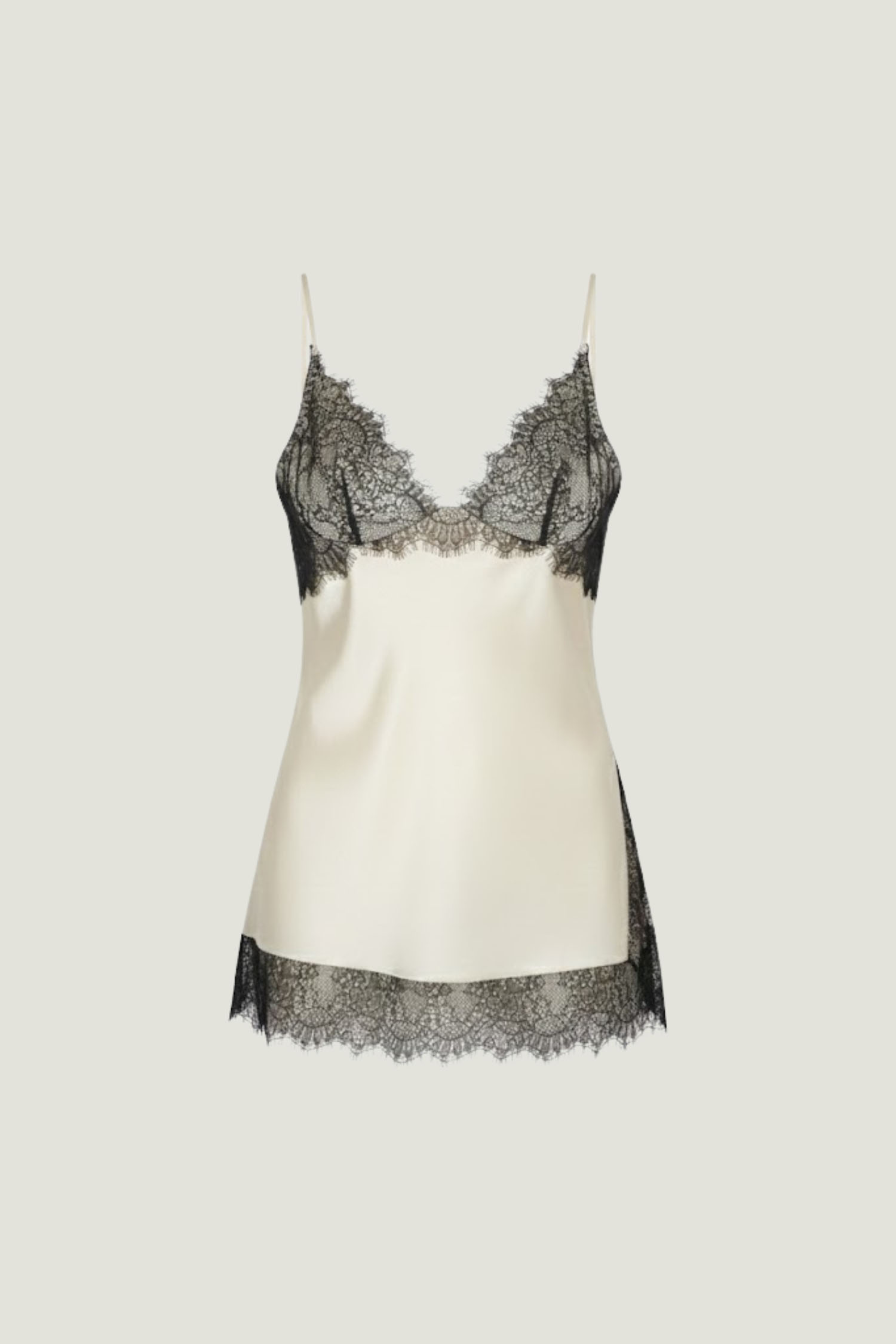 ДоставкаТоп на тонких бретелях у білизняному стилі. Виготовлений з легкого сатину молочного відтінку. Спереду оздоблений чорним мереживом.