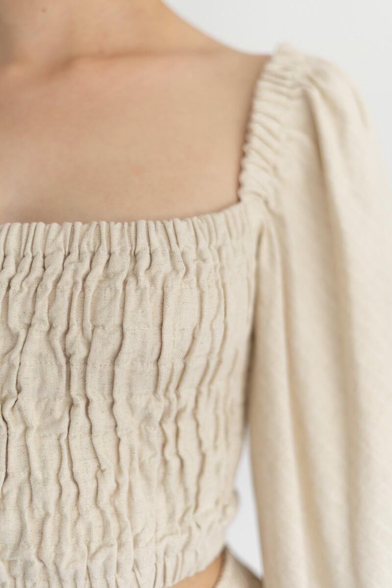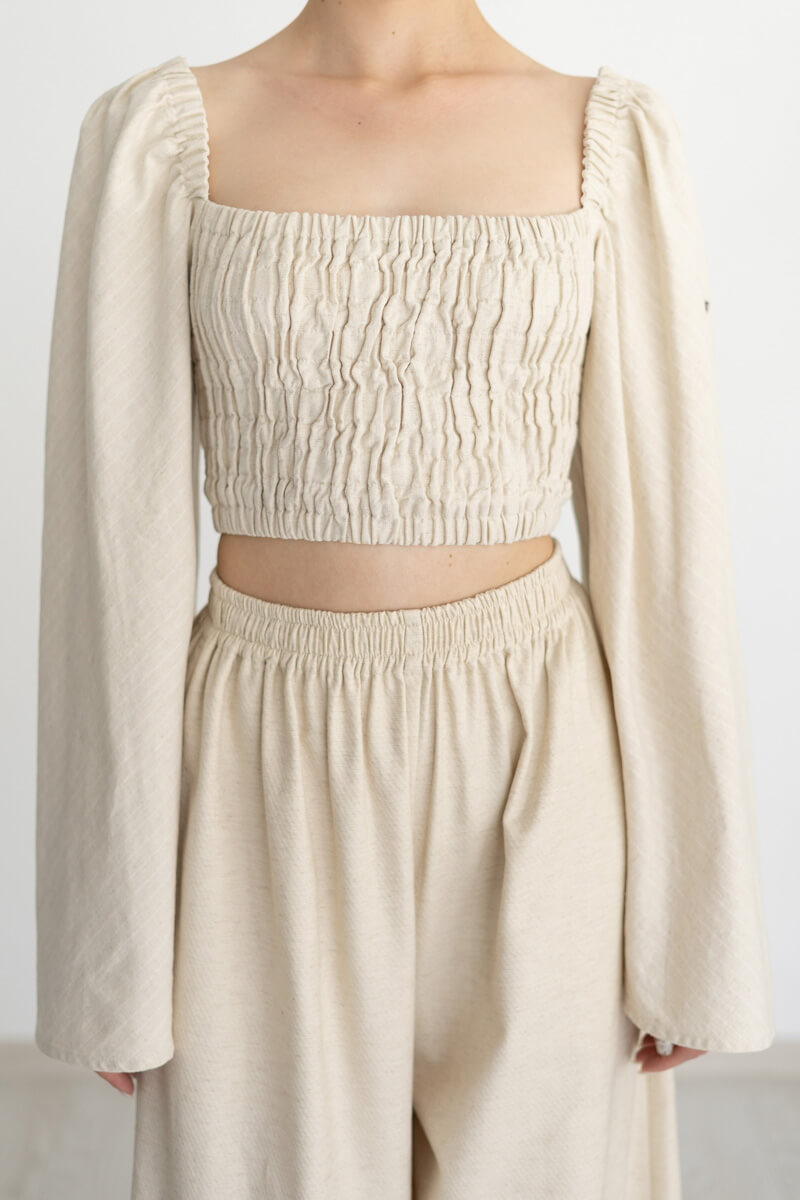 Доставка впродовж 2-5 робочих днівЖатий топ з рукавами-буфами, виконаний з сорочкового попліну, з гарною лінією декольте. Довгий рукав, імітація манжета. Ззаду на шнурівці.