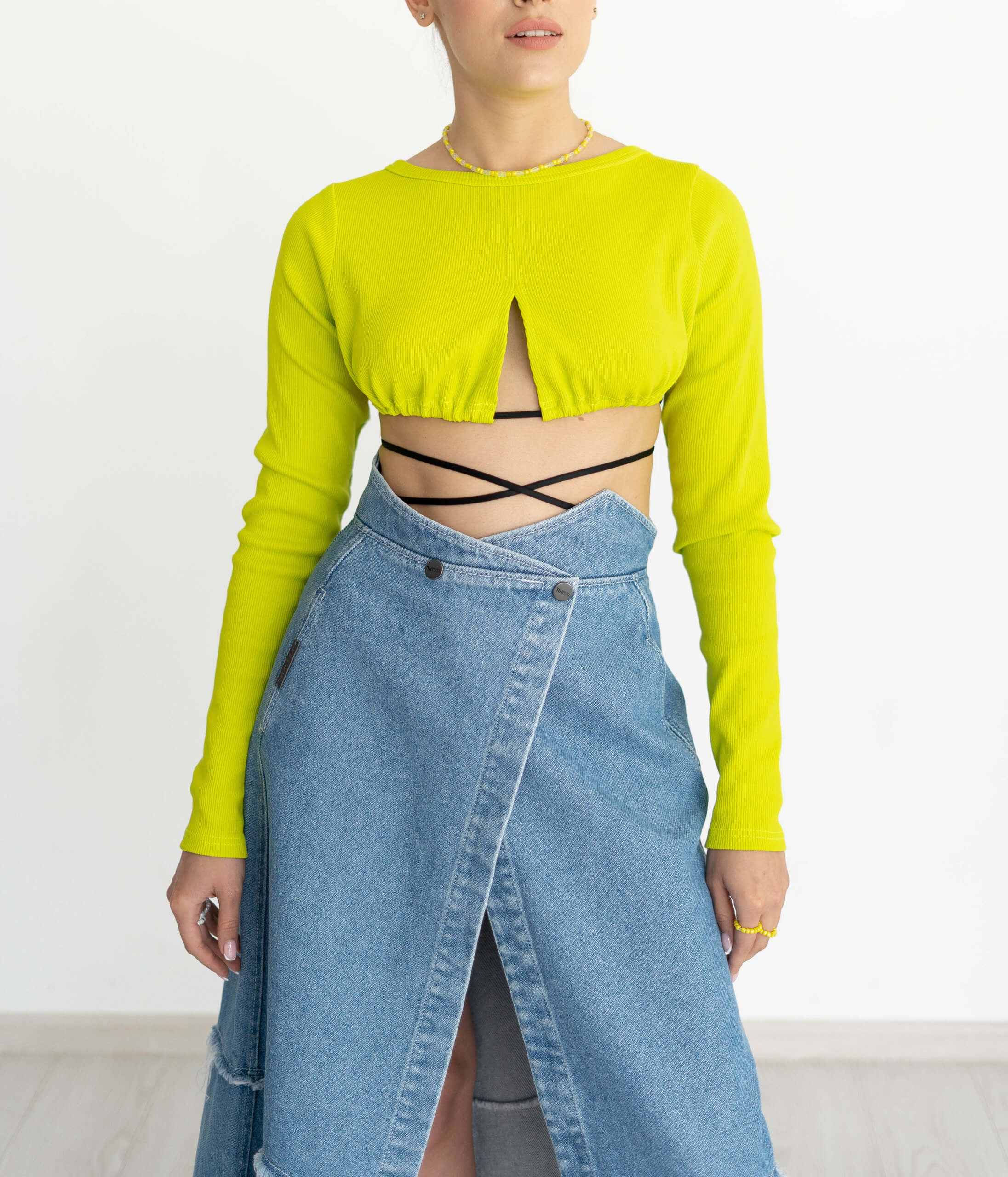 Доставка впродовж 2-5 робочих днівТрикотажний топ виконаний з бавовняної рибани. Довгий рукав. Дві шнурівки: знизу та ззаду декоративна.