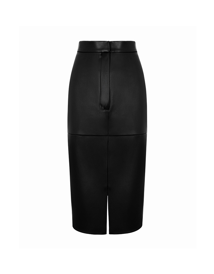 Доставка впродовж 2-5 робочих днівМіді спідниця чорного кольору з щільної еко-шкіри з розрізом спереду . Висока посадка, застібка на блискавку