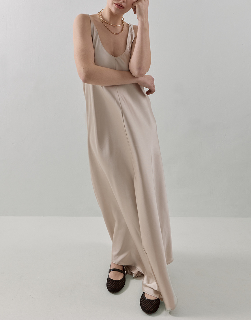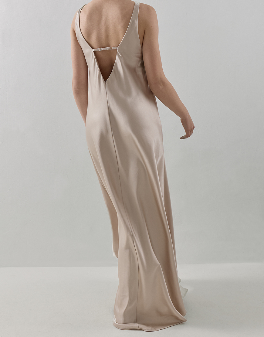 Доставка впродовж 2-5 робочих днівСатинова максі-сукня з витонченим вирізом на спині та регулятор по спинці дозволяє підлаштувати посадку під себе. Завдяки діагональному крою вона ідеально сідає на будь-який тип фігури