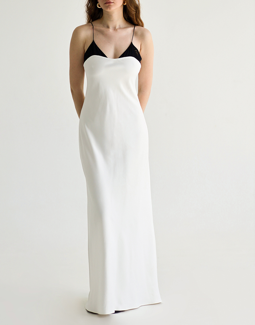 Сатинова максі-сукня з сітчастим ліфом біла