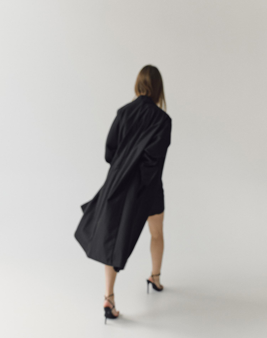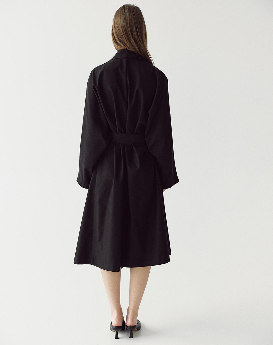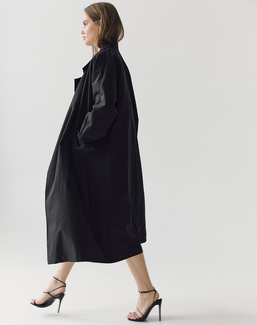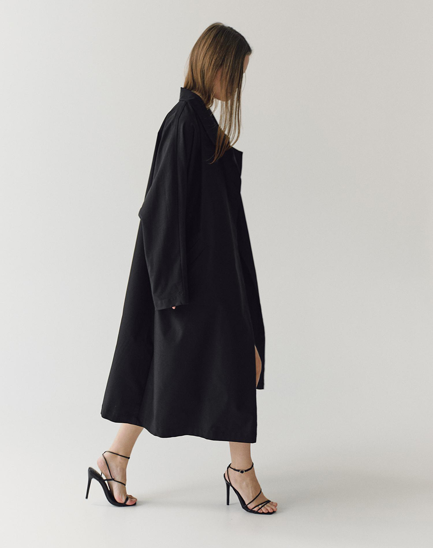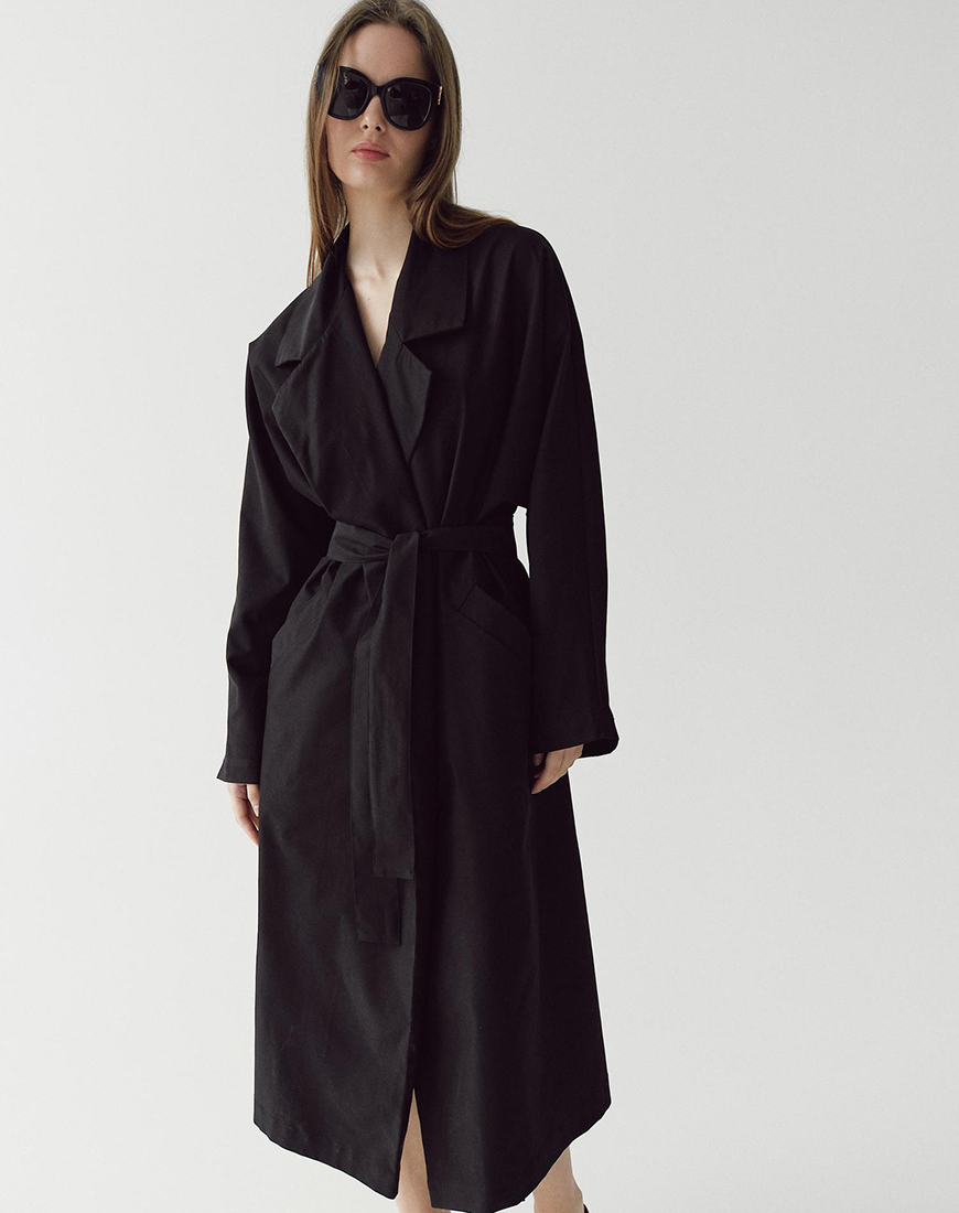 Доставка впродовж 3-5 робочих днівОверсайз тренч без підкладки з поясом та боковими кишенями. Тканина цупка чорного кольору без ґудзиків.