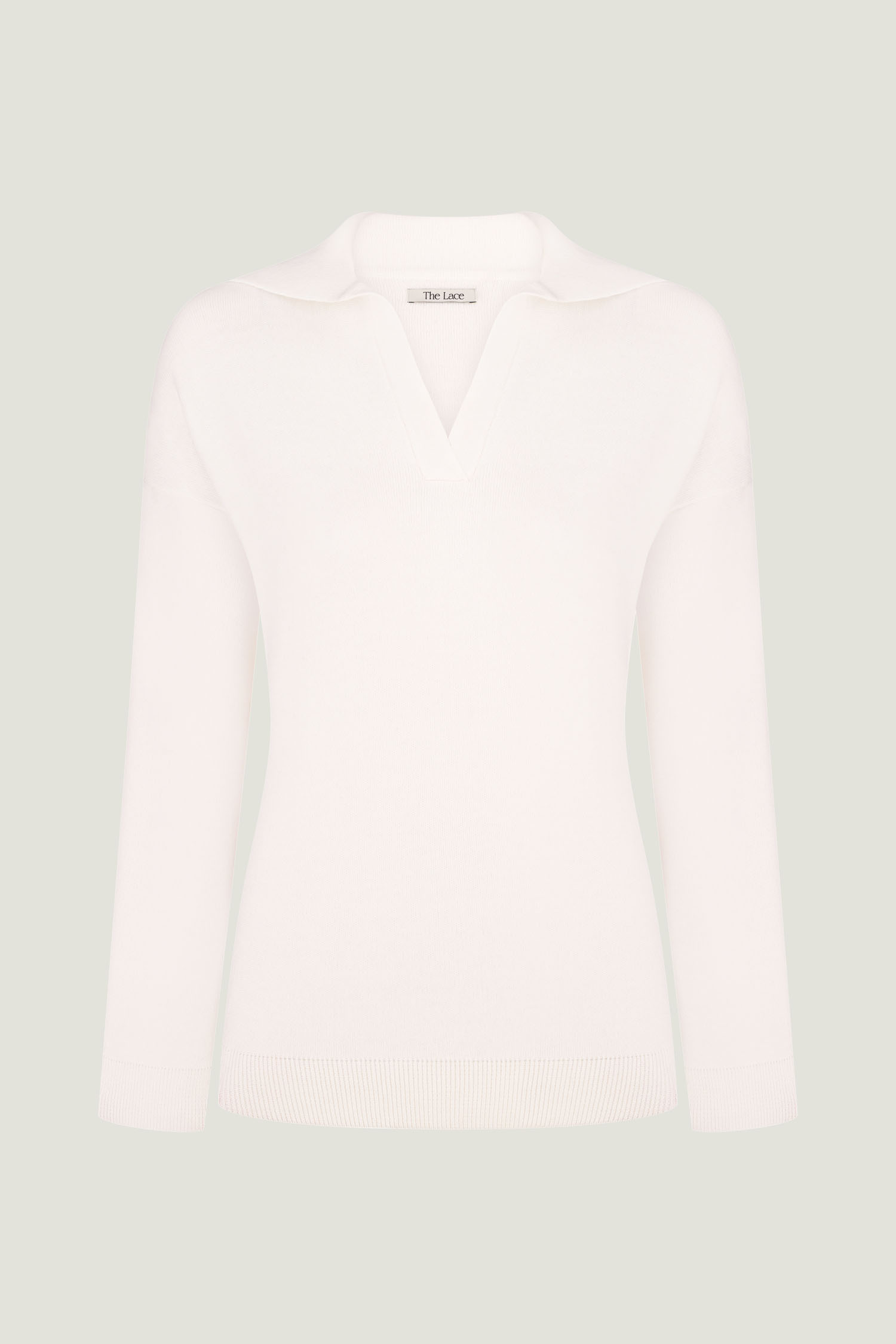 Жіночий поло-джемпер молочного відтінку, виконаний із цупкого, але м’якого трикотажу. Має довгі рукави та еластичні манжети. Тканина приємна на дотик. Зручна посадка рукава завдяки еластичним манжетам.