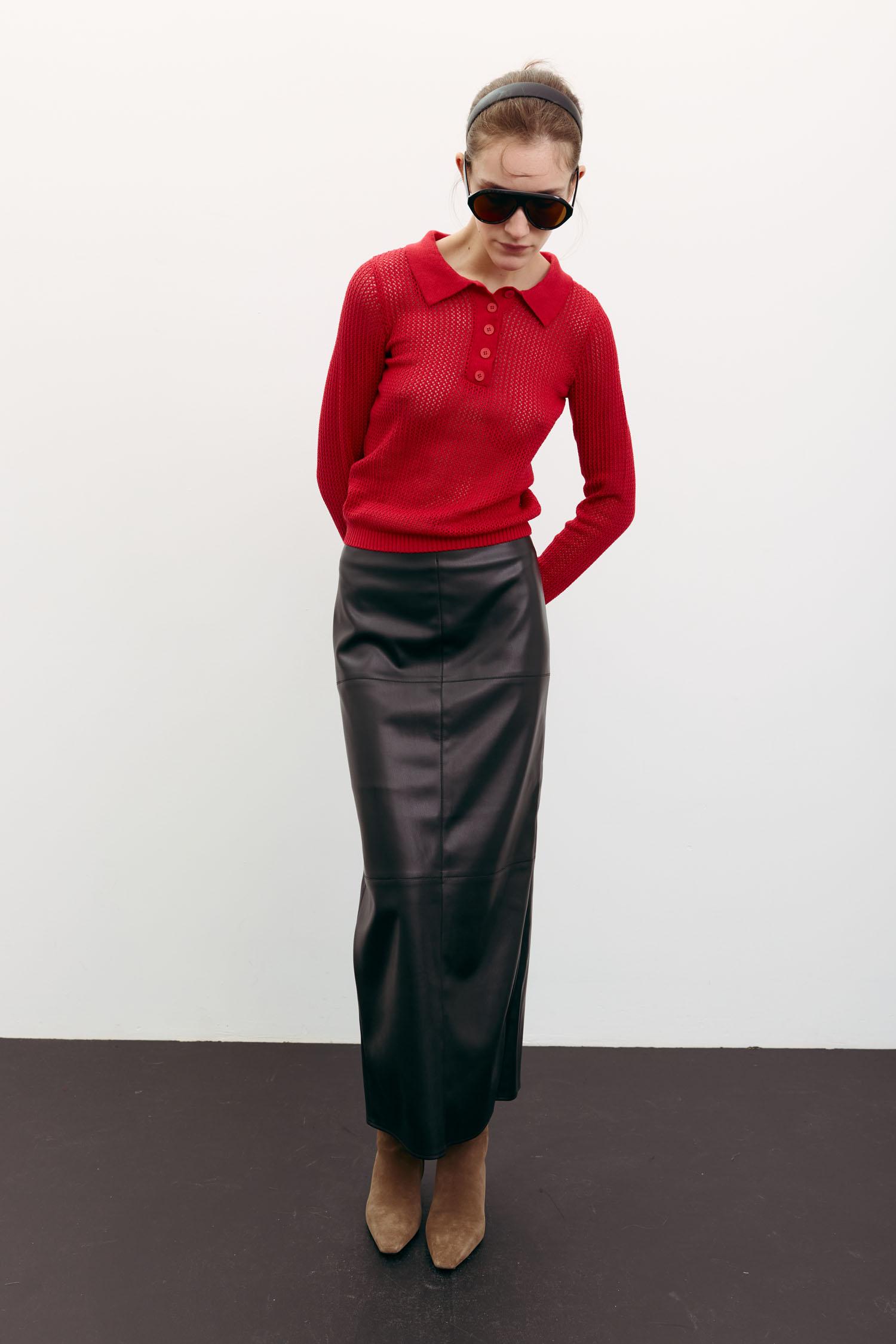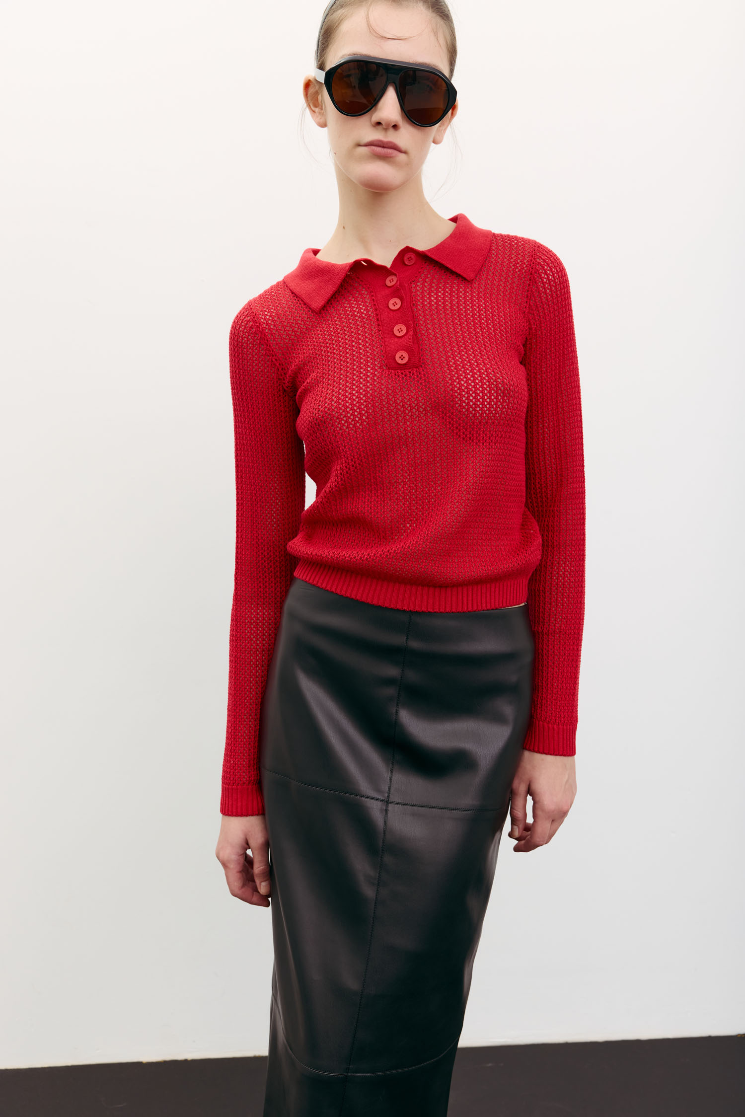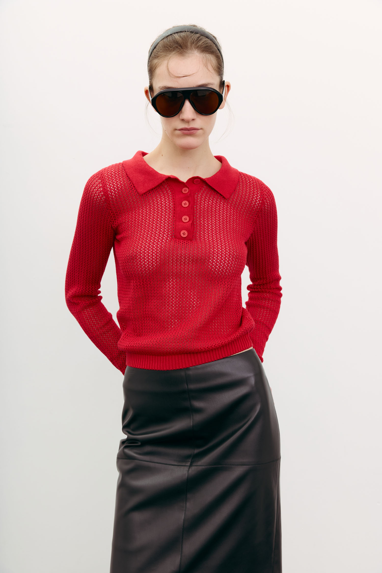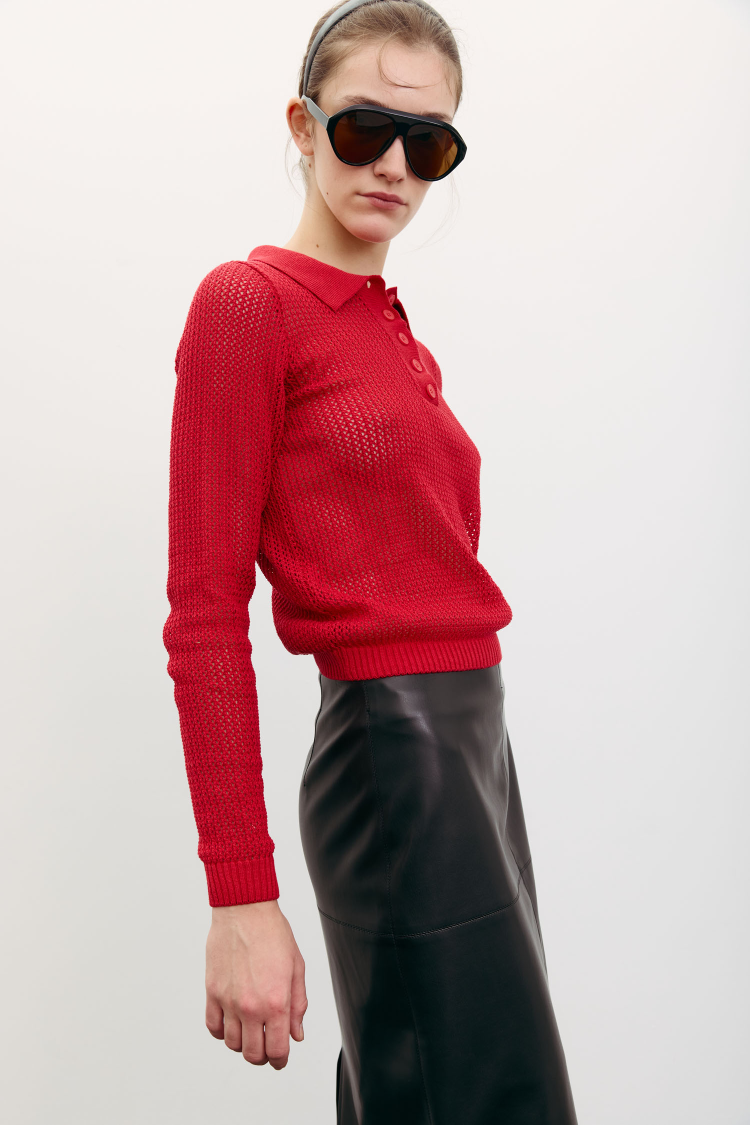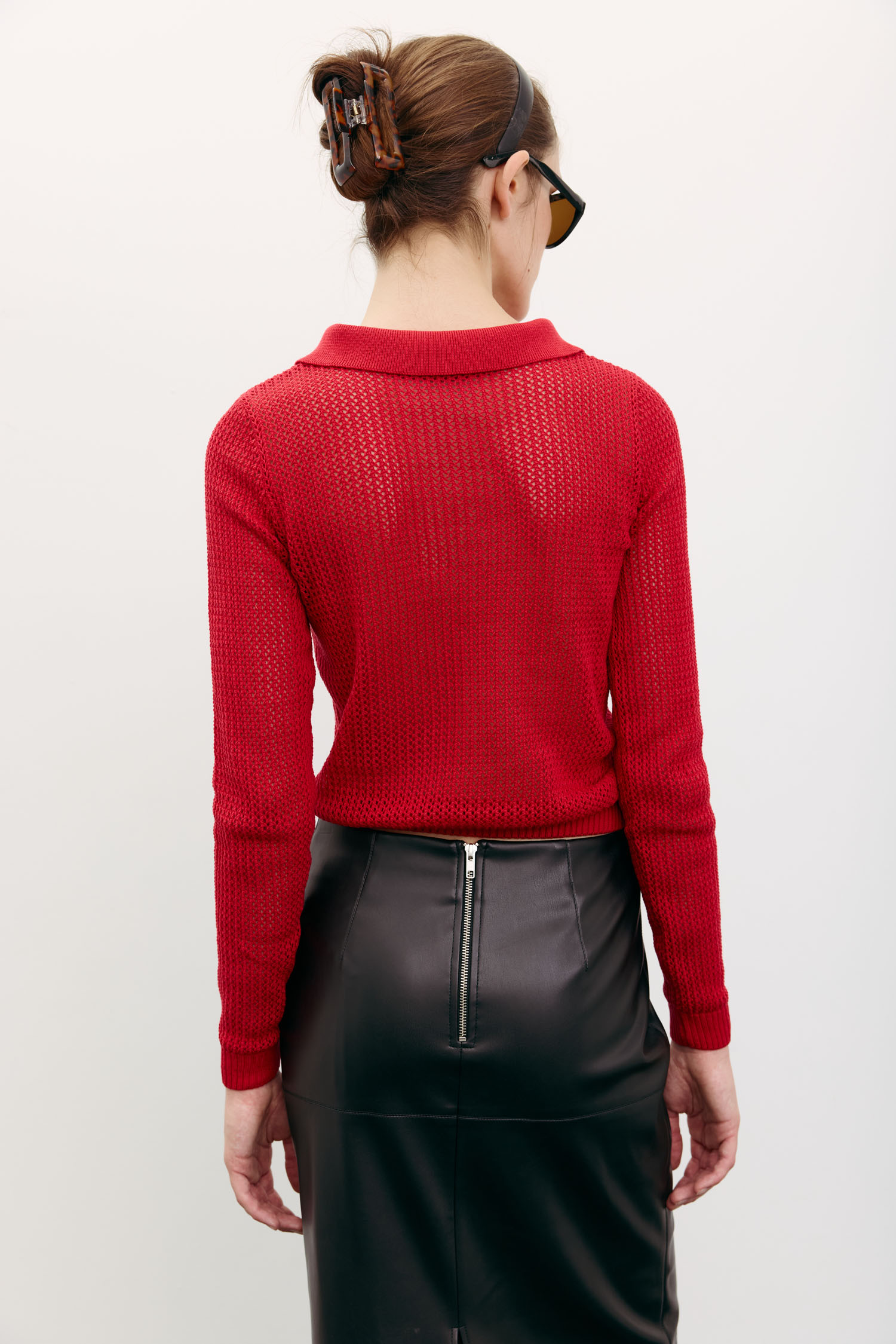 Жіночий джемпер-поло з трикотажу червоного кольору. Має довгі рукави і легкий ажурний візерунок, що робить полотно напівпрозорим. Текстура додає образу візуальної легкості. Мінімалістичний крій. Джемпер орієнтований на осінній гардероб.