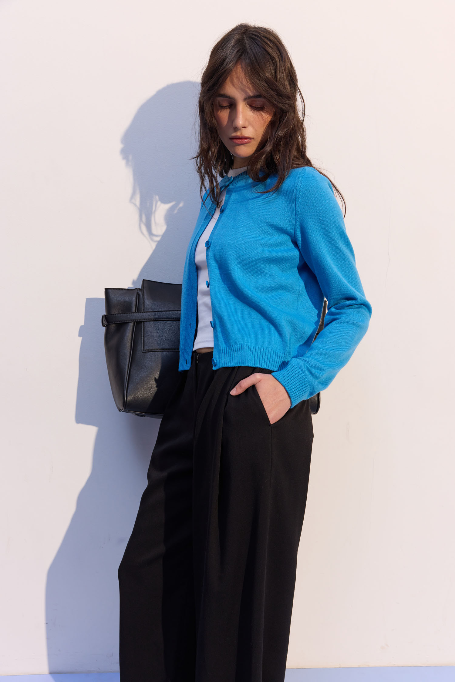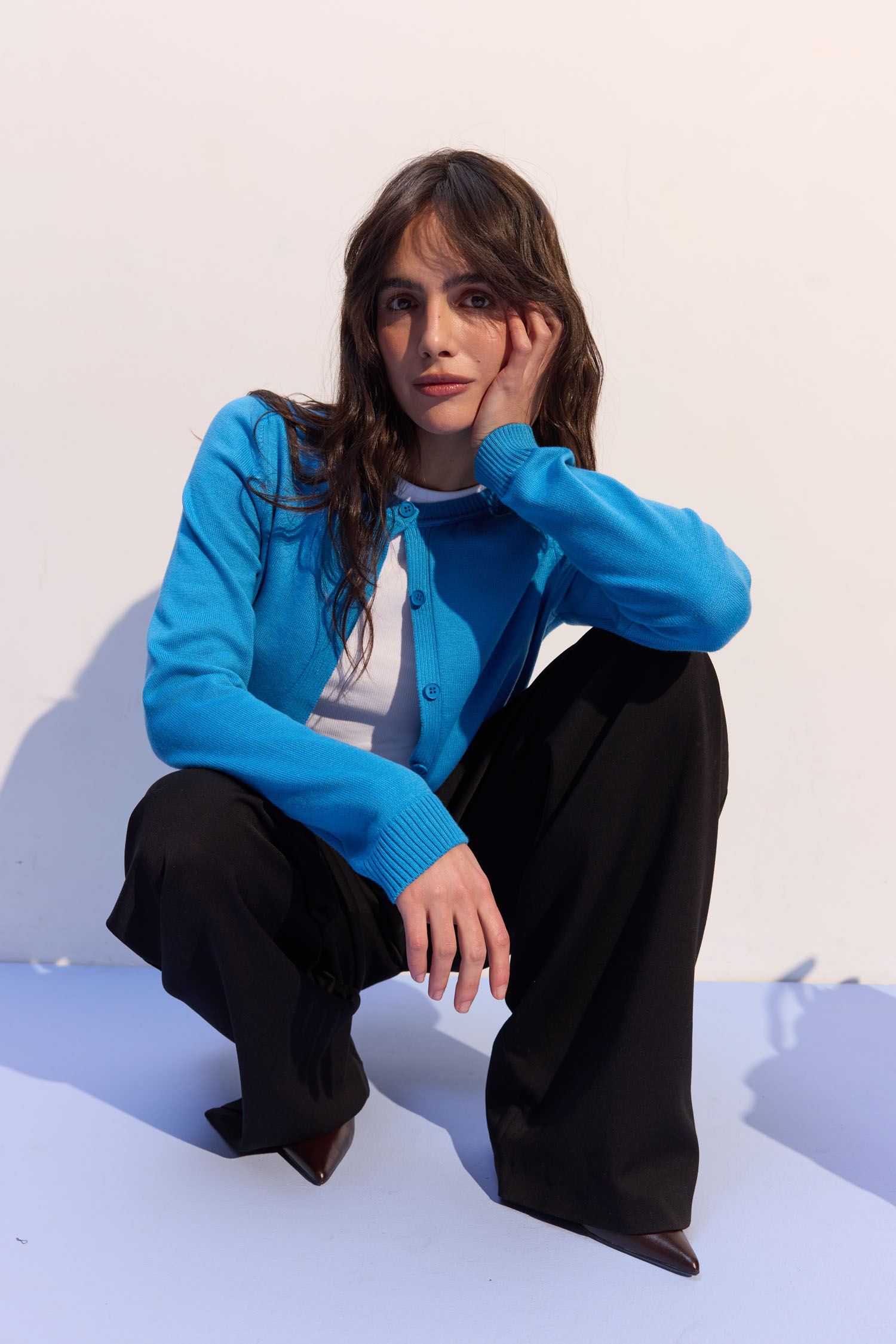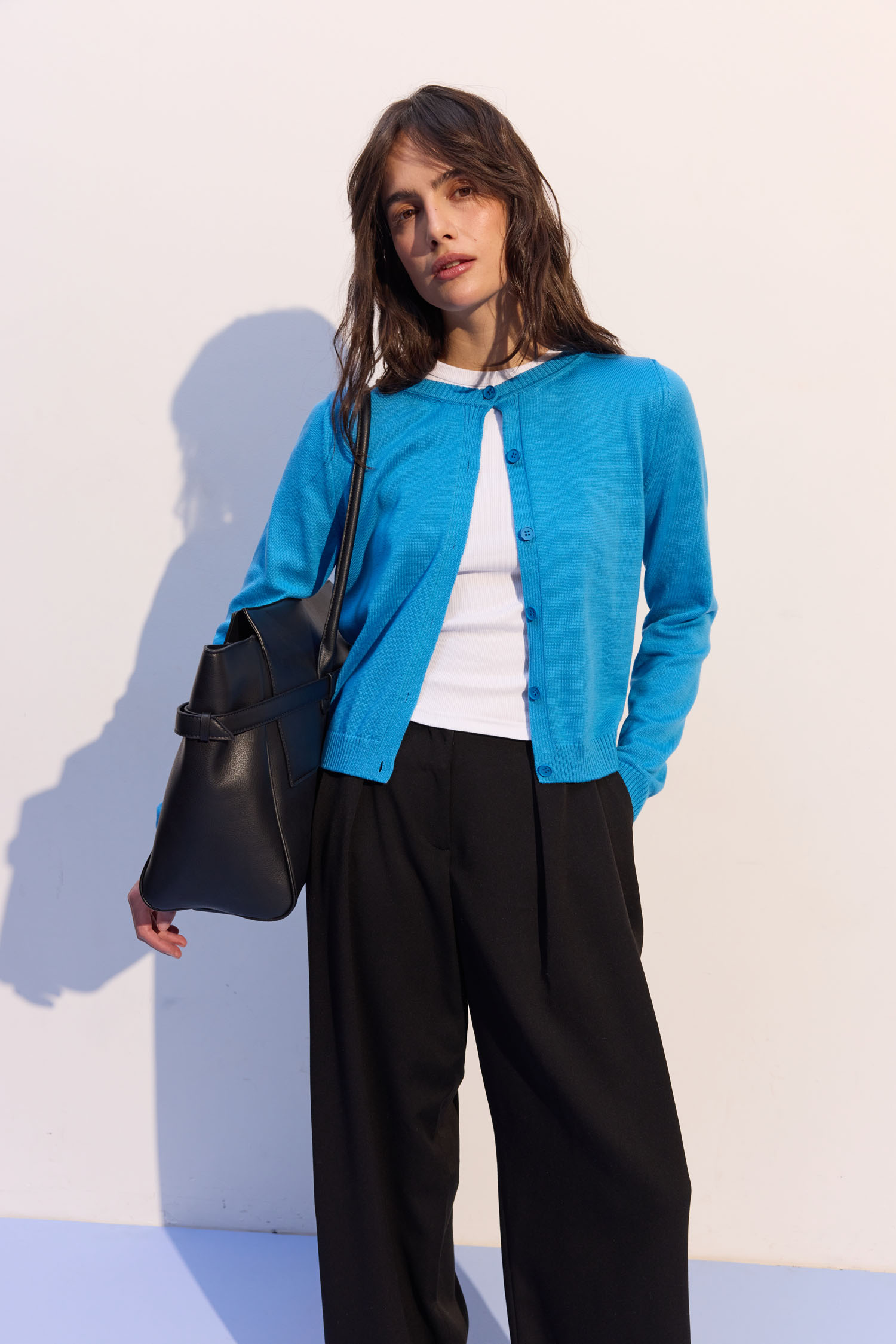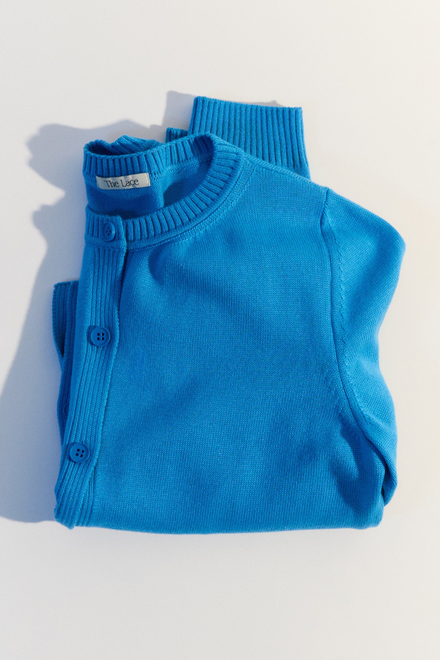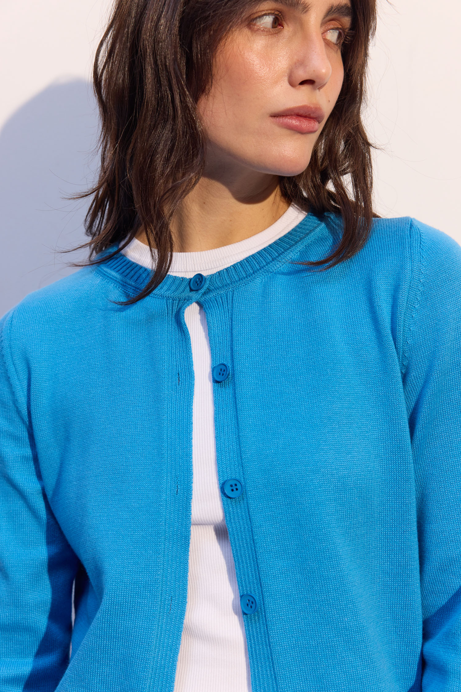 Від 3000 грн доступна оплата частинами monobank Детальніше Кардиган яскраво-блакитного відтінку, виготовлений із бавовняної пряжі. Має легку текстуру і круглий виріз горловини. Застібається на ґудзики. Завдяки ґудзикам його можна носити на голе тіло, комбінувати з топами або залишати розстебнутим. Універсальний крій і натуральна тканина забезпечують комфорт і практичність у повсякденному використанні.