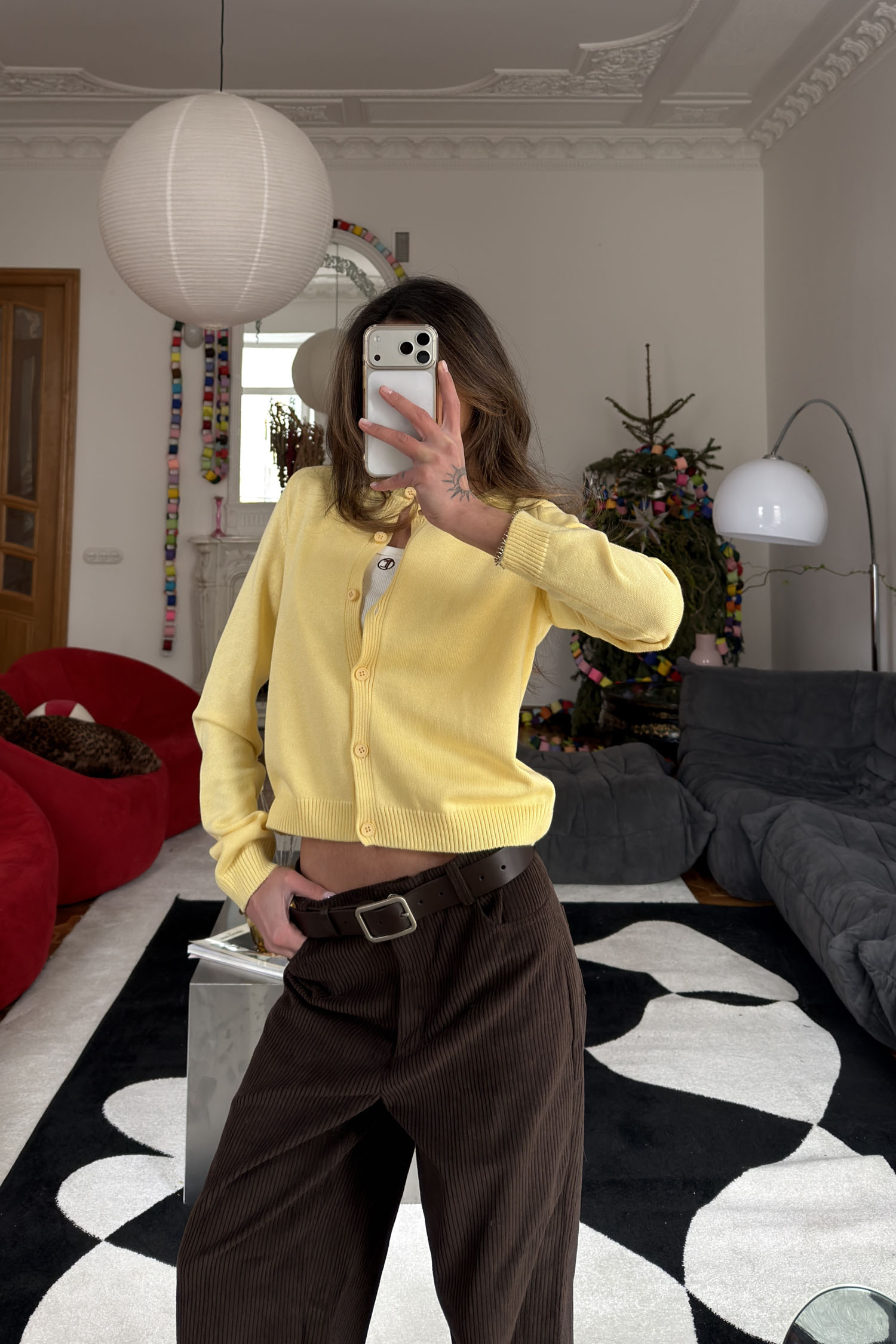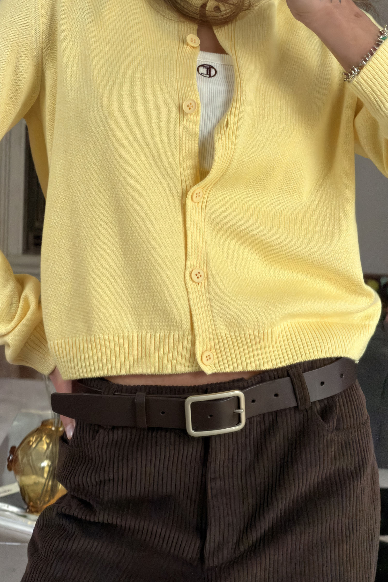 ДоставкаКардиган лимонного кольору, пов’язаний із бавовняної пряжі, оздоблений вишивкою. Легкий фасон із круглим вирізом горловини. Застібається на ґудзики, що дозволяють змінювати спосіб носіння. Можна надягати на голе тіло, поєднувати з топами або залишати розстебнутим. Забезпечує комфорт і простоту у стилізації щоденного образу.