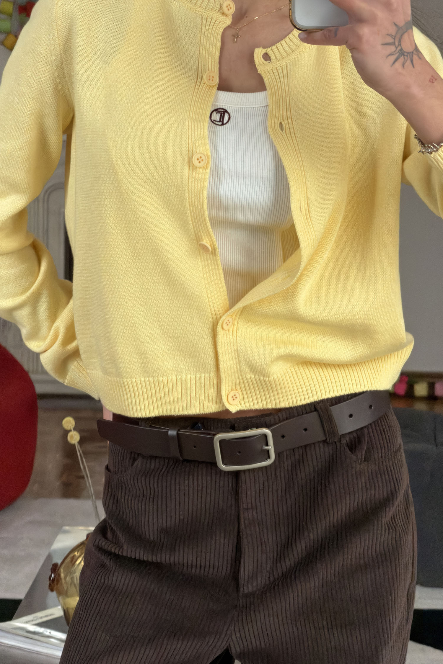 Трикотажний кардиган з круглим вирізом та вишивкою лимонний