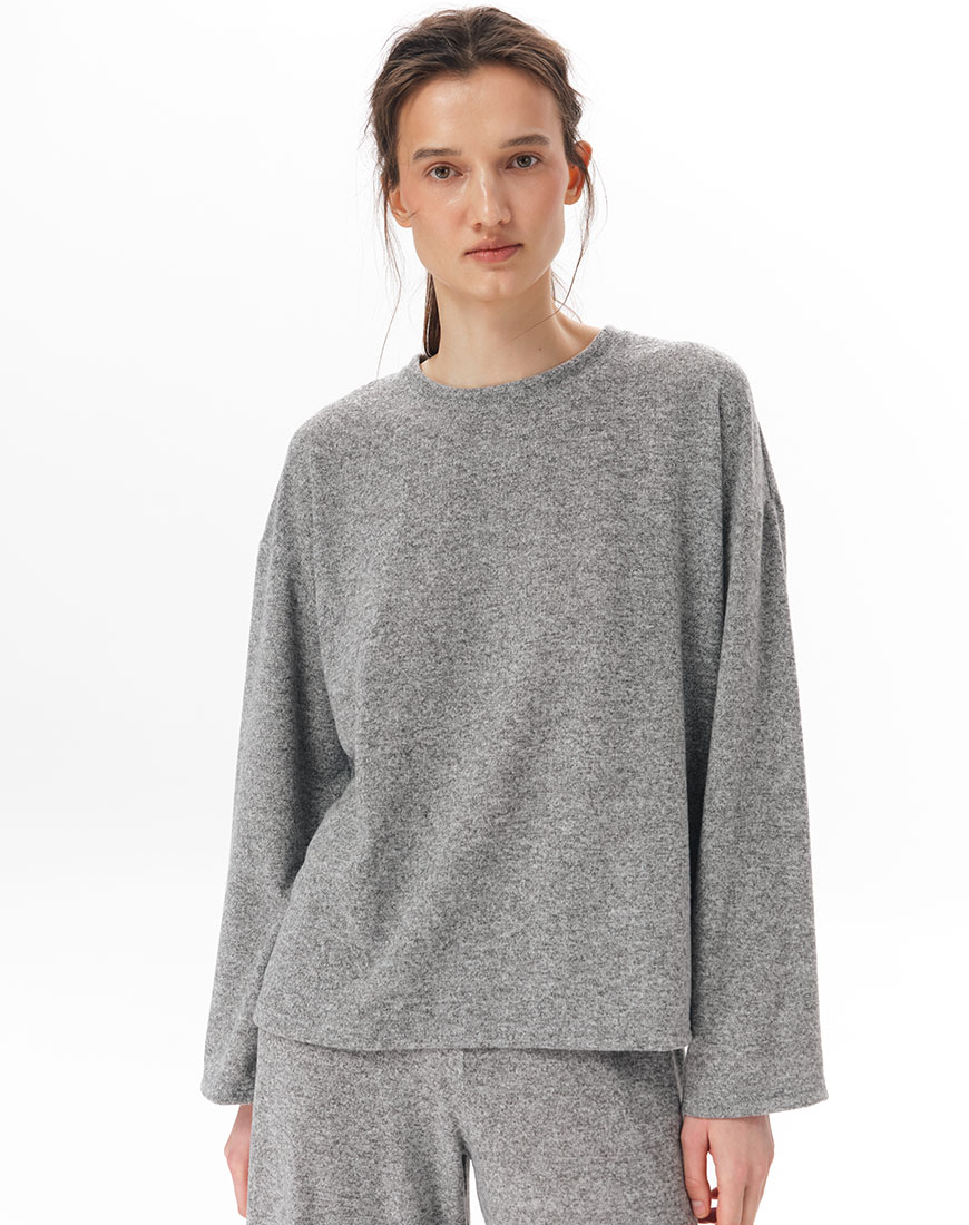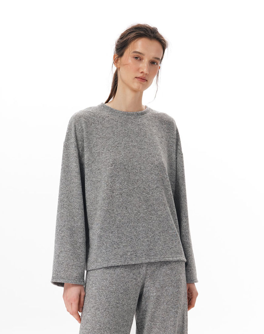 Доставка впродовж 5-7 робочих днівТрикотажний лонгслів з віскози з додаванням вовни. М’яка тонка тканина, легка й трохи тепліша завдяки вовняній нитці. Прямий вільний крій. Кругла горловина. Базова модель, яку можна носити окремо або як комплект із трикотажними штанами з цієї ж колекції.