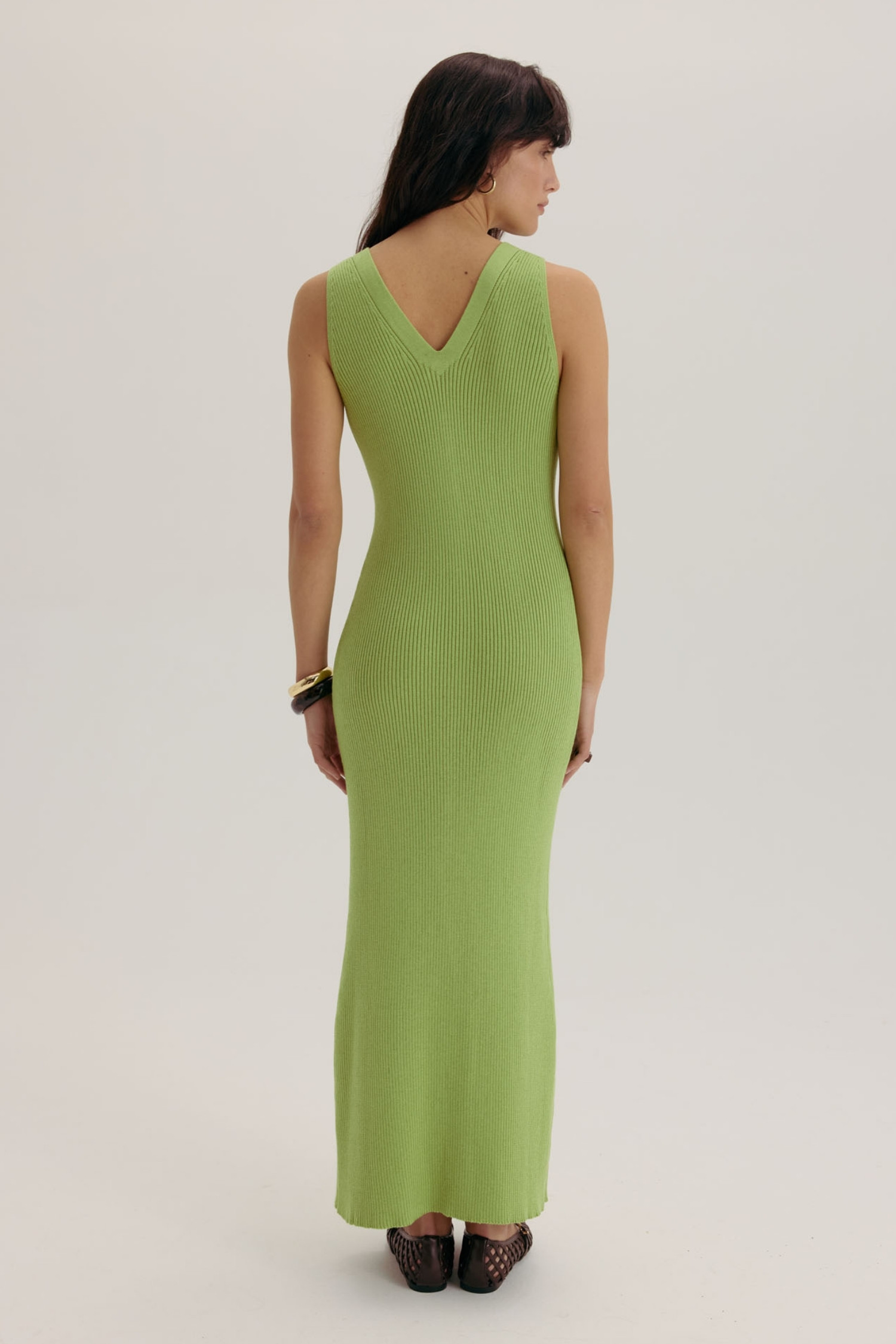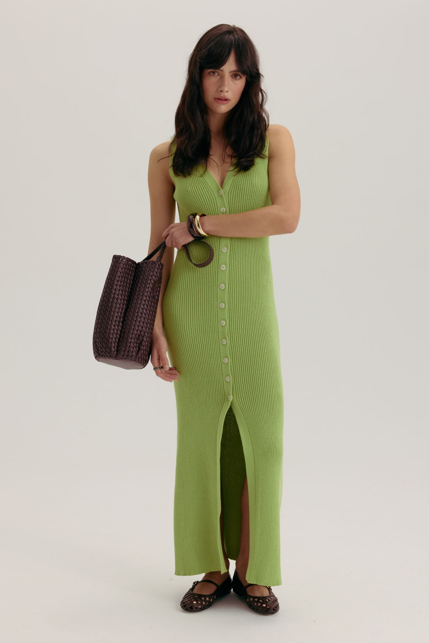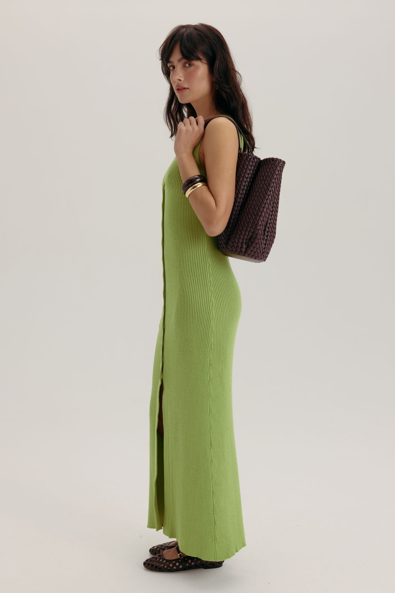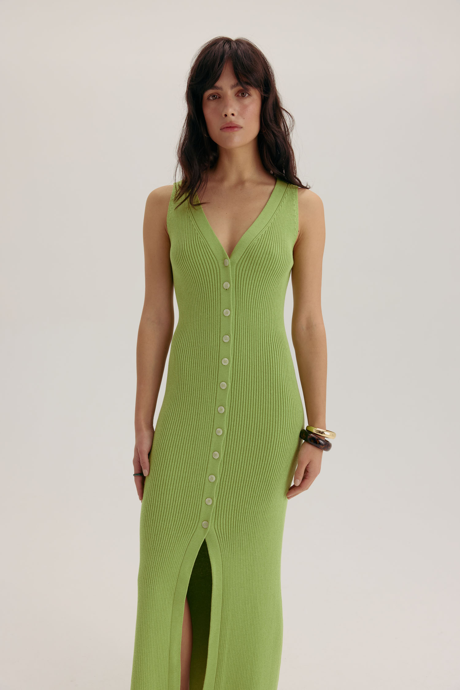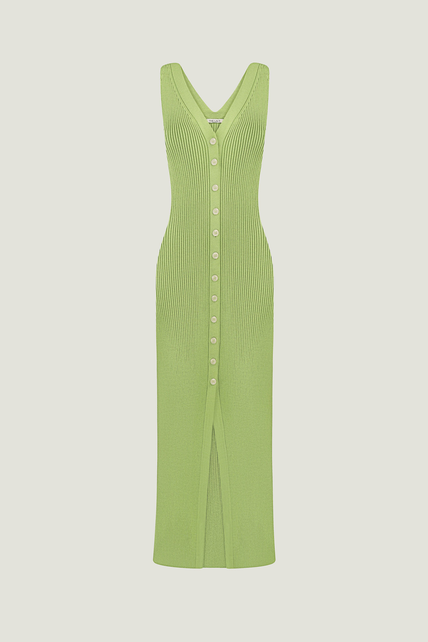 Сарафан із трикотажу кольору матча, застібається на ґудзики. Довжина максі, виконаний із бавовняної пряжі. Приталений крій підкреслює силует і забезпечує точну та комфортну посадку.