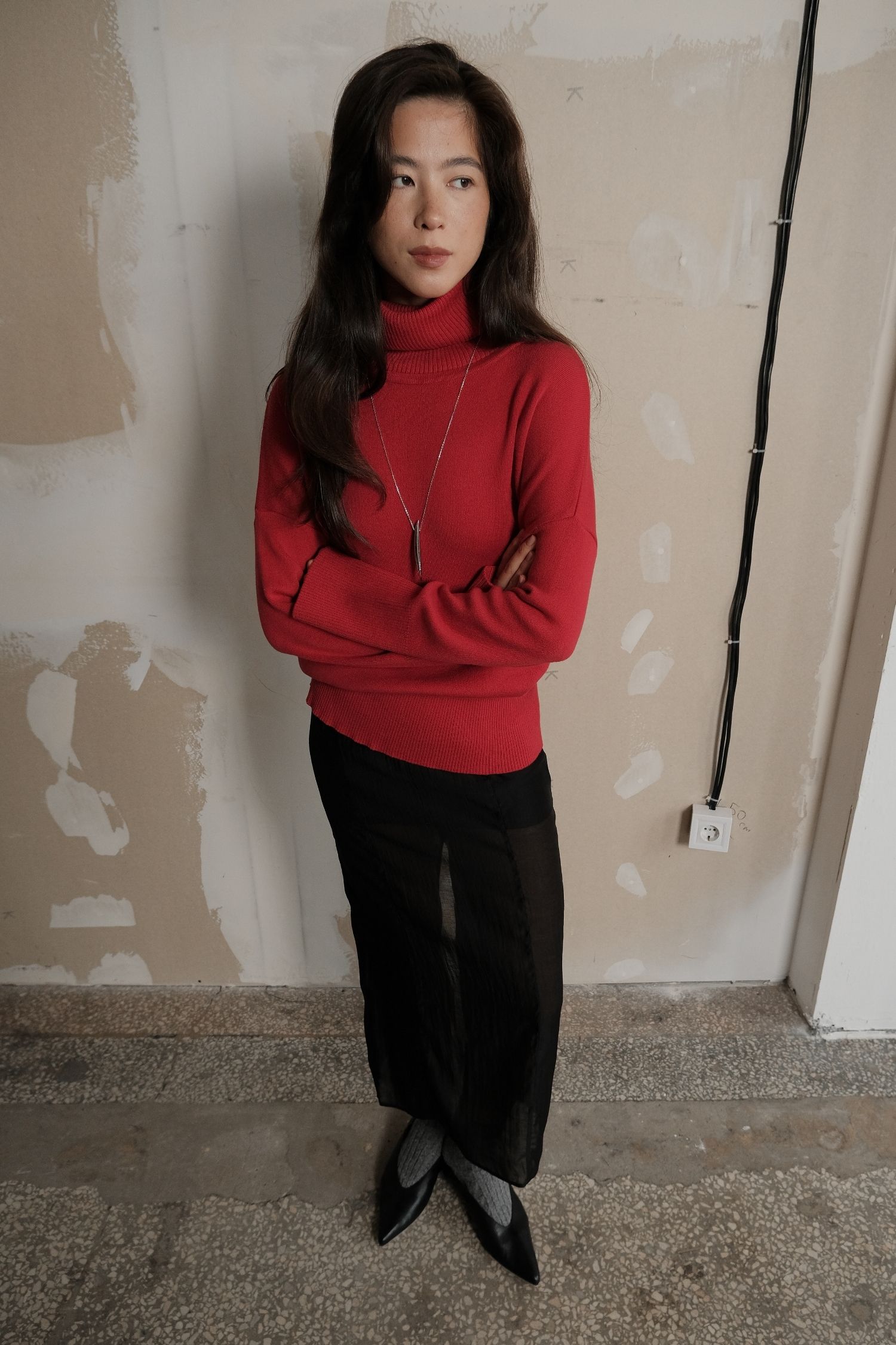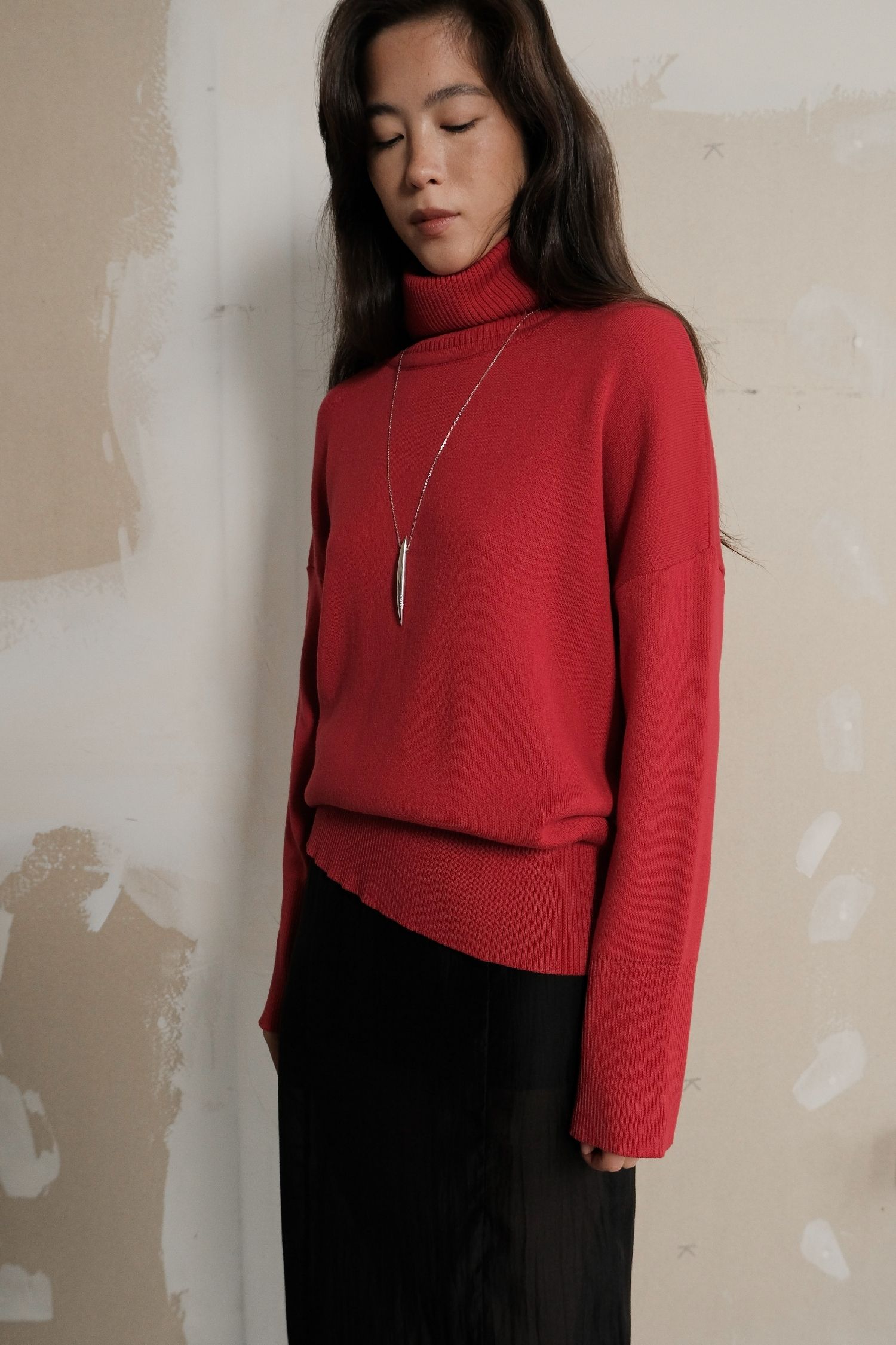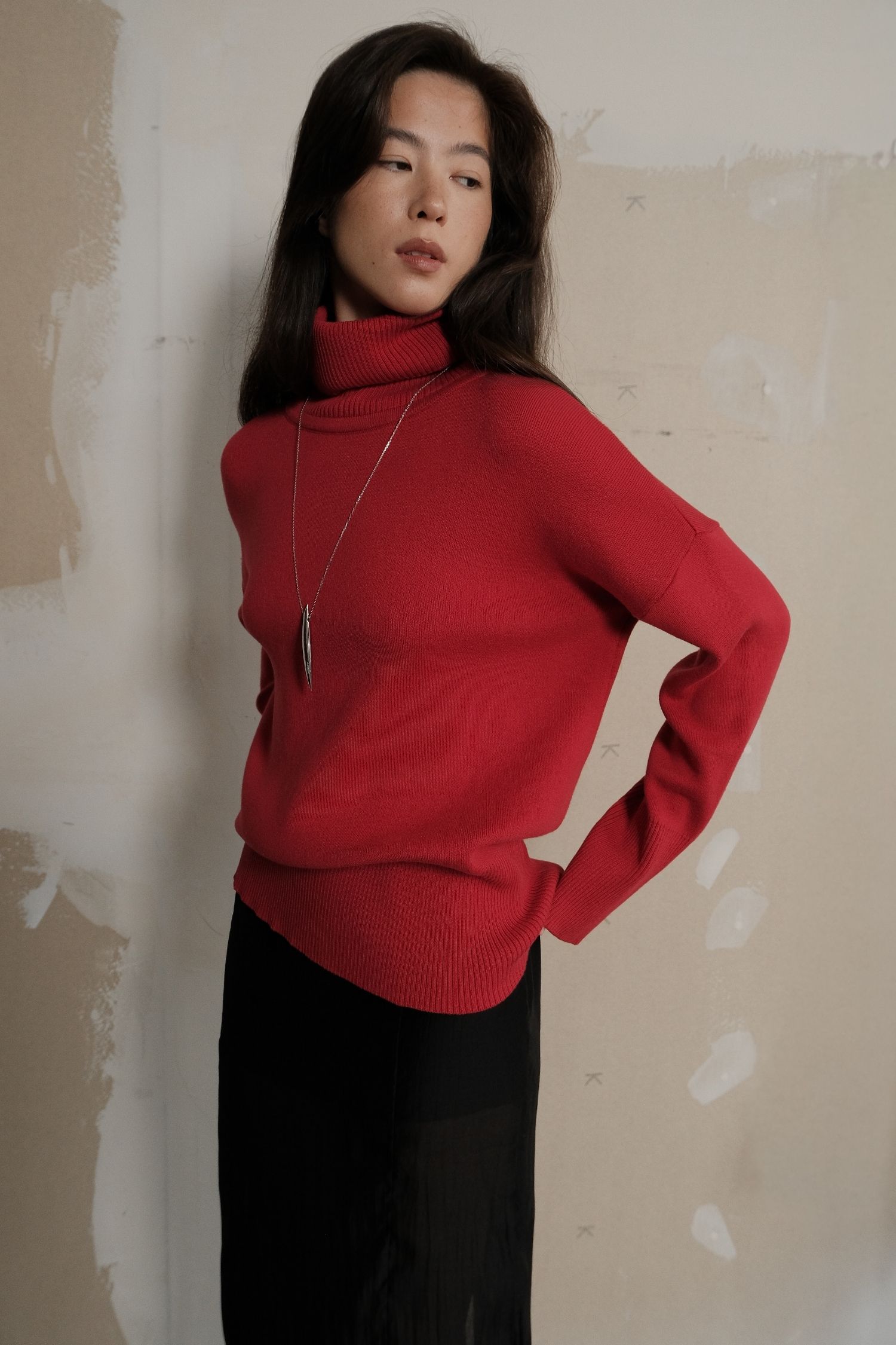 Жіночий светр із трикотажу з об’ємною горловиною. Колір – насичений червоний. Підійде для осінньо-зимового сезону. Теплий і комфортний у носінні, водночас має охайний вигляд. Добре поєднується з брюками з еко-шкіри та спідницями міді.