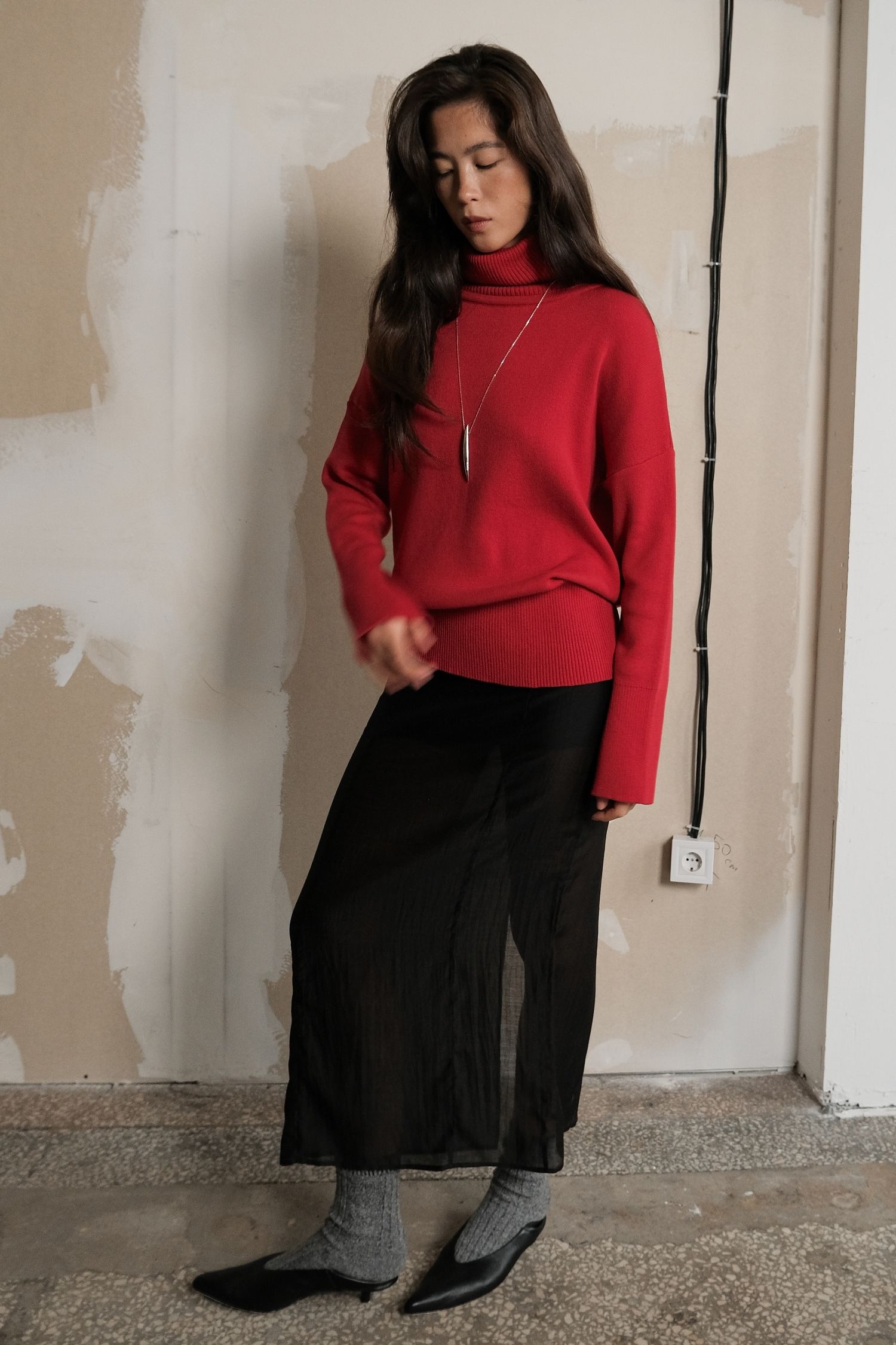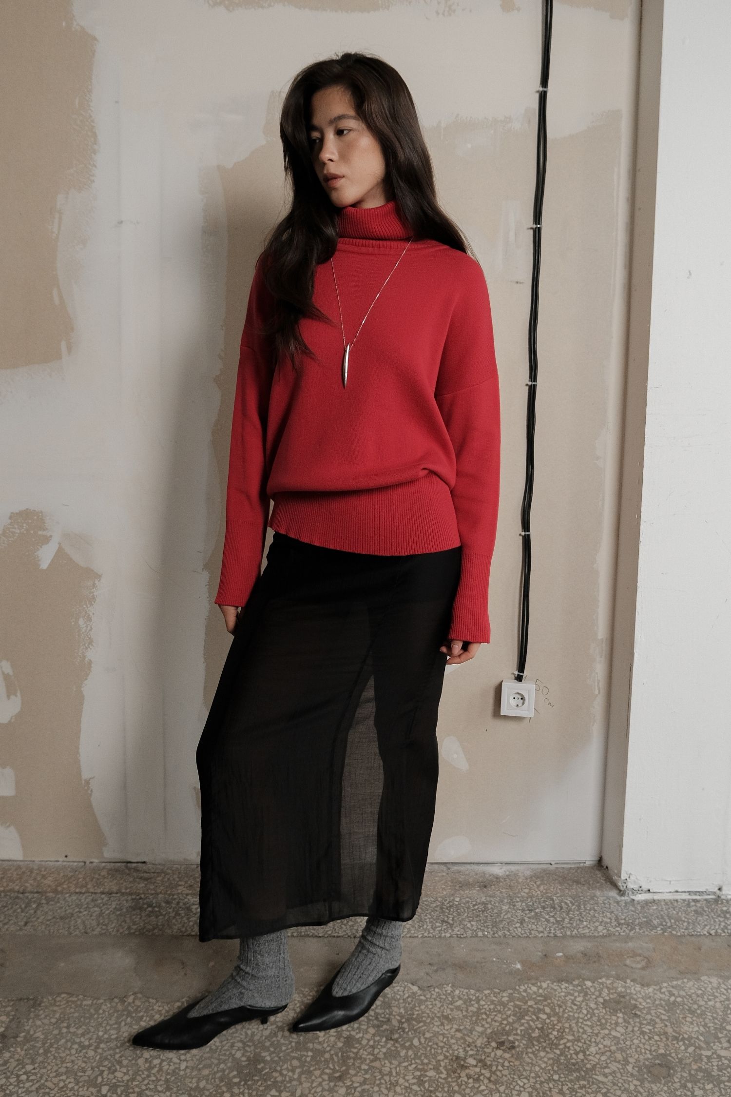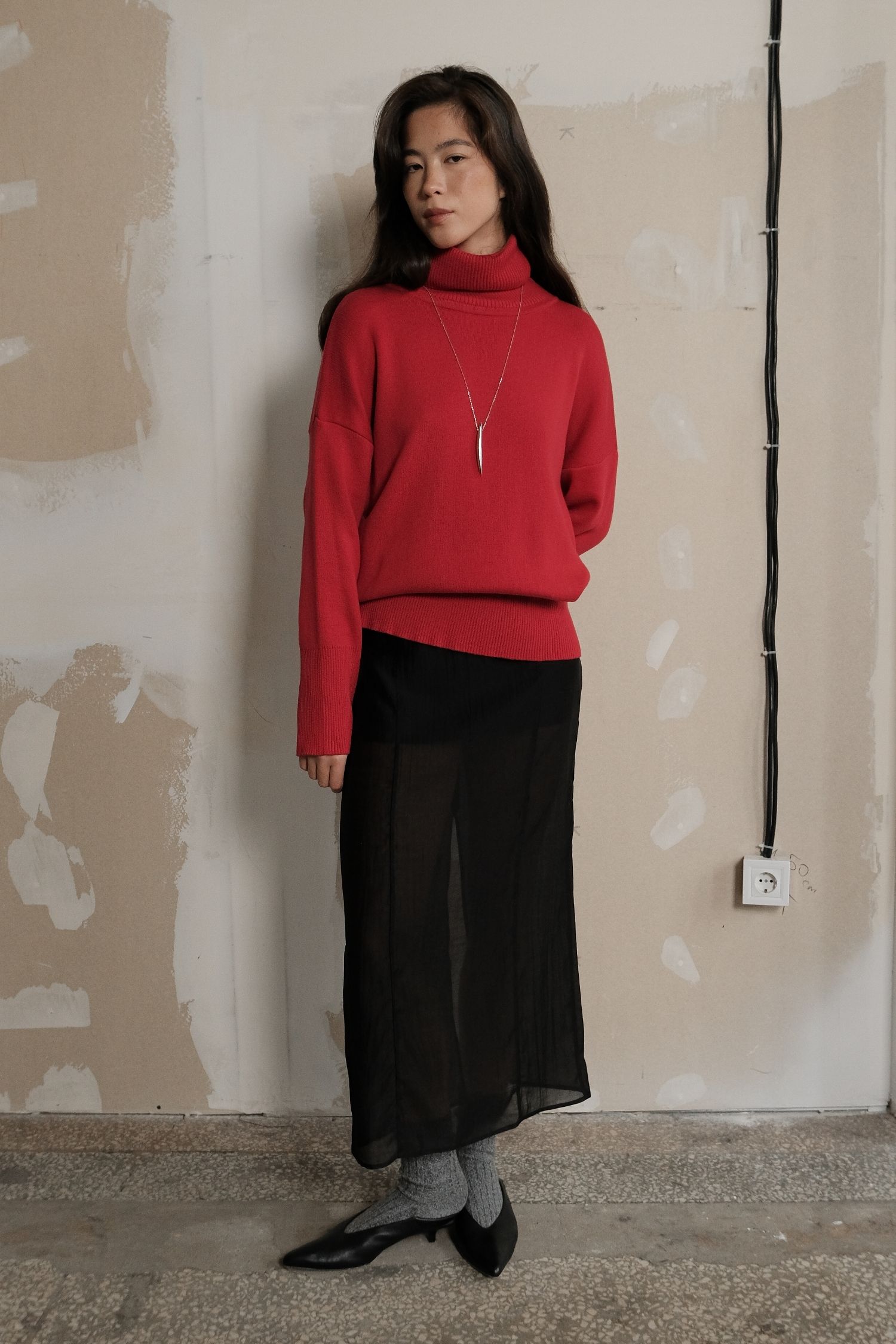 Жіночий светр із трикотажу з об’ємною горловиною. Колір – насичений червоний. Підійде для осінньо-зимового сезону. Теплий і комфортний у носінні, водночас має охайний вигляд. Добре поєднується з брюками з еко-шкіри та спідницями міді.