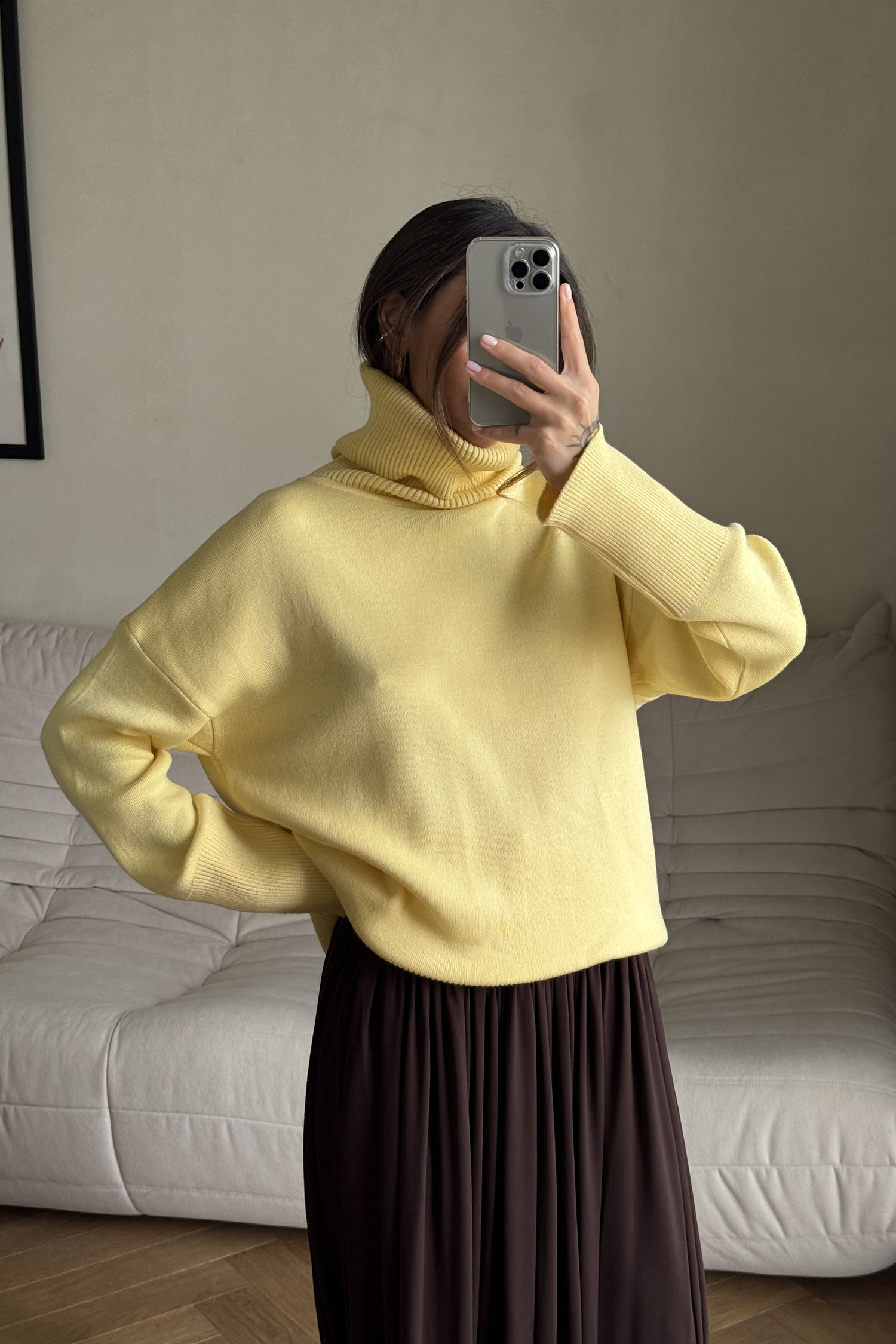 ДоставкаСветр із трикотажу лимонного відтінку, прямого силуету з об’ємним коміром. Лаконічний крій і м’яка фактура матеріалу створюють комфортну основу для щоденного носіння. Пасує до брюк з еко-шкіри та спідниць. Підходить для сезону весна-осінь: тримає тепло й забезпечує зручність, при цьому має охайний вигляд.