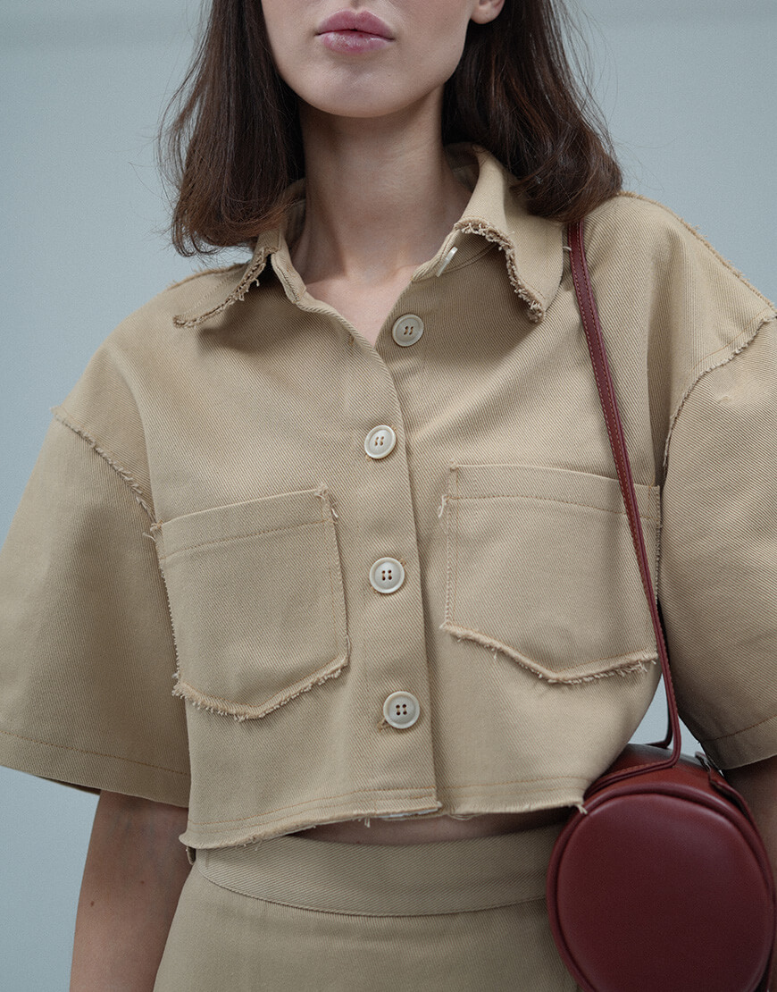Доставка в течение 3-10 рабочих днейСорочка із 100% бавовни пісочного кольору, вкорочена, вільного крою , з неоздобленим краєм, кишенями та коміром. Сорочка має накладні кишені на грудях, ґудзики беж-кольору великого діаметру. Чудово поєднується із спідницею-шортами. За рахунок свого крою