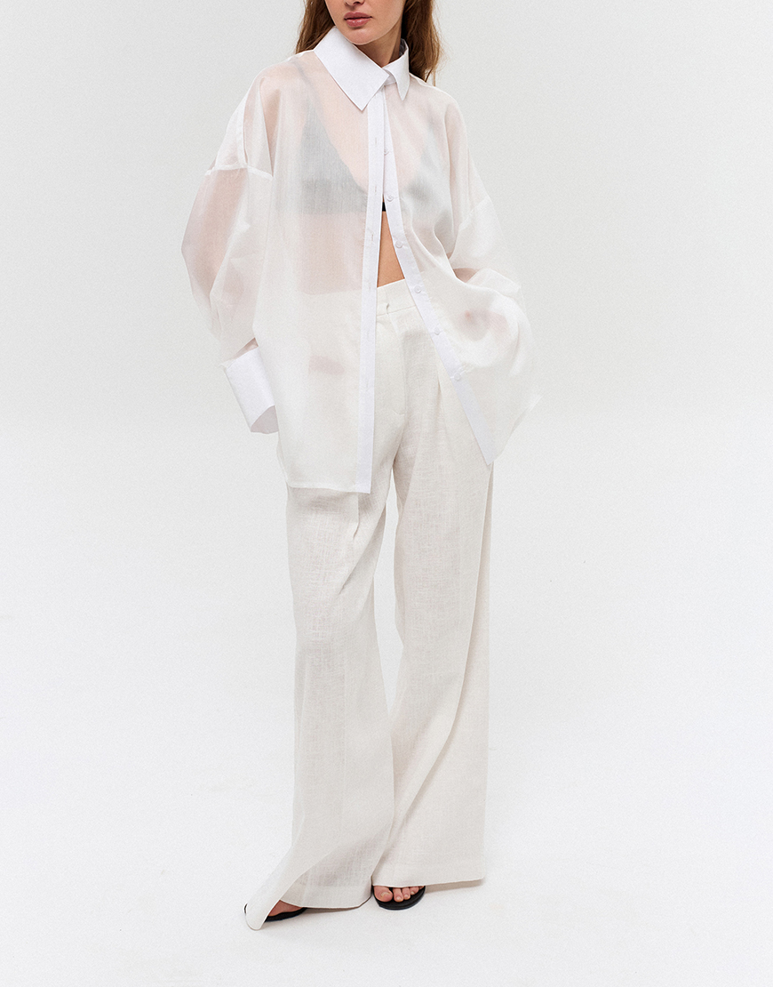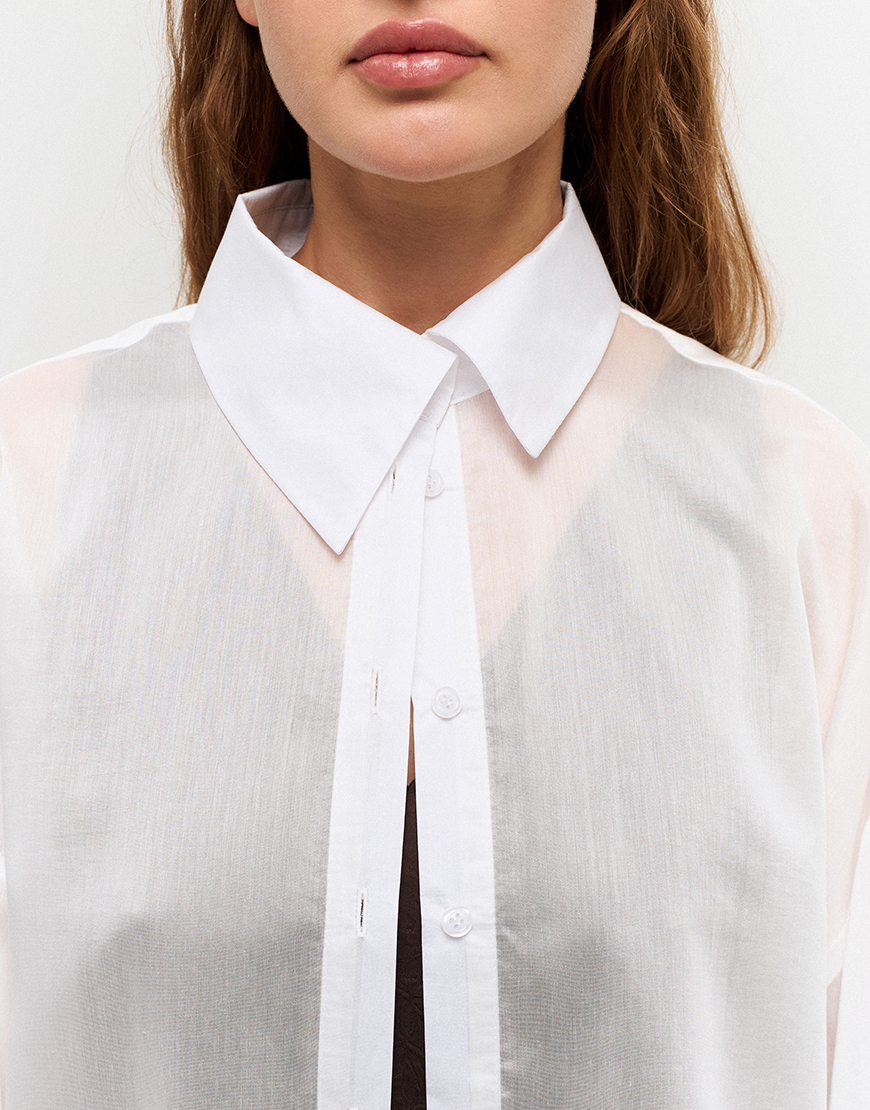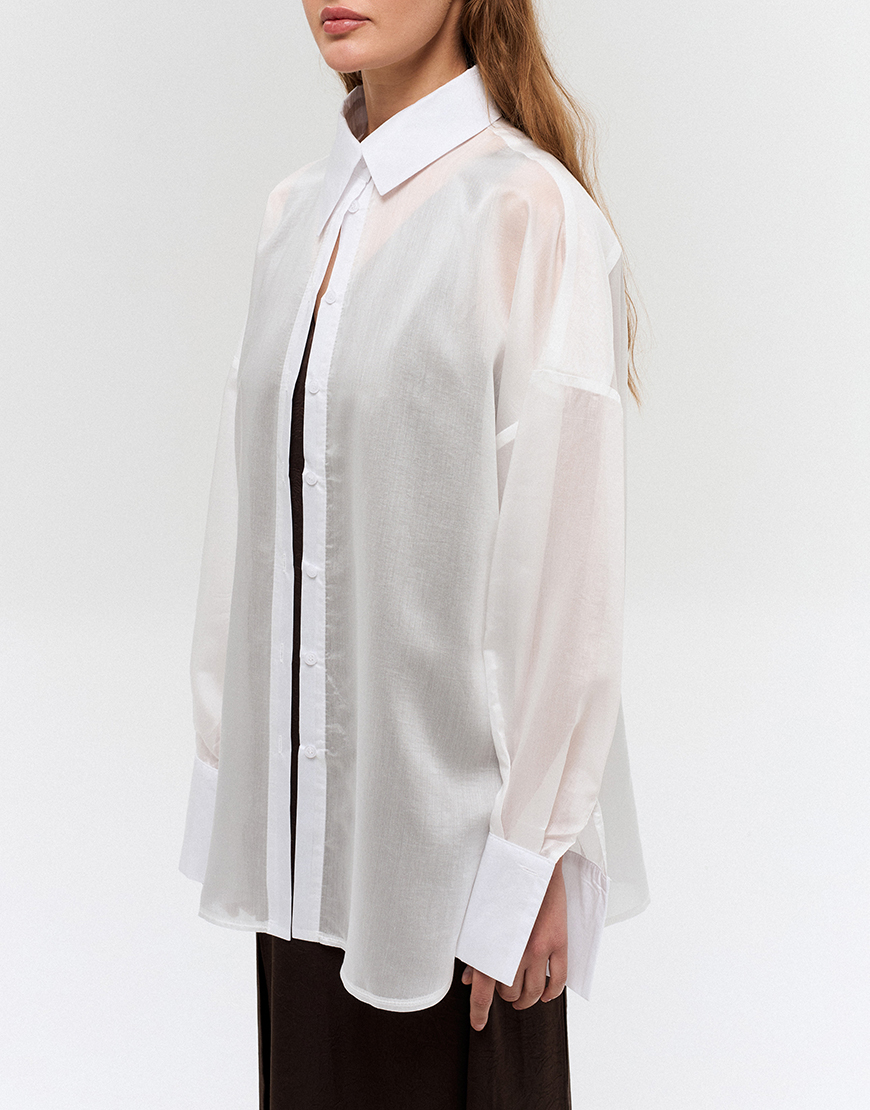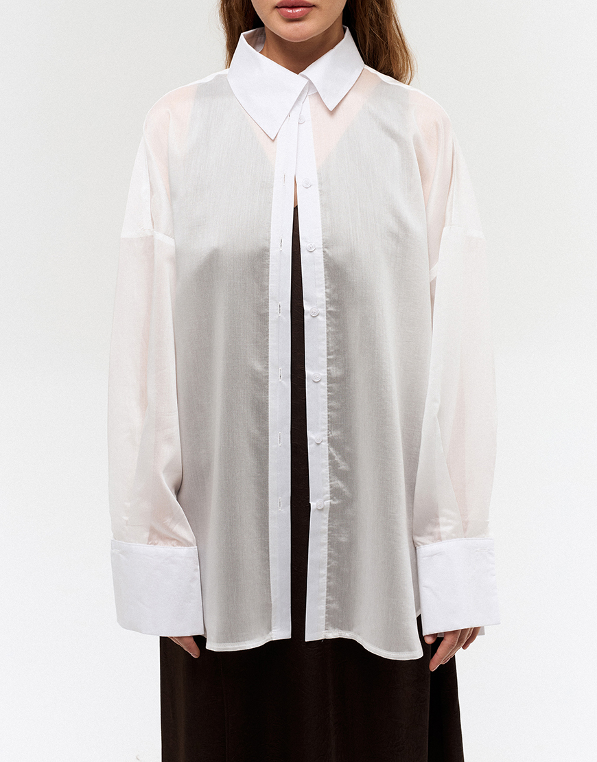 Доставка впродовж 3-10 робочих днівОверсайз сорочка виконана з прозорого білого тенселу. Попереду сорочка має асеметричний дубльований комір та застібається на маленькі білі класичні гудзики. Мантежи також продубльвані, широкі та застібаються на гудзики. Позаду сорочка має цікаий декоративний виріз посередині та розріз знизу, що додає ій динаміку.