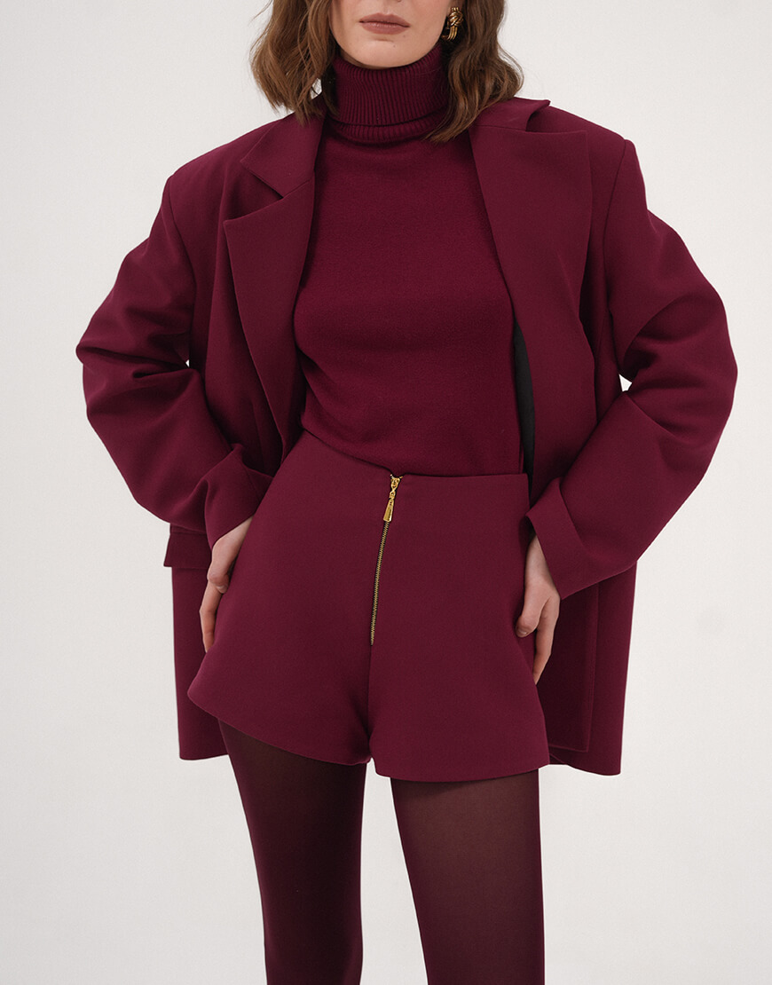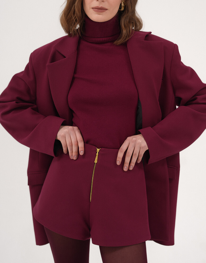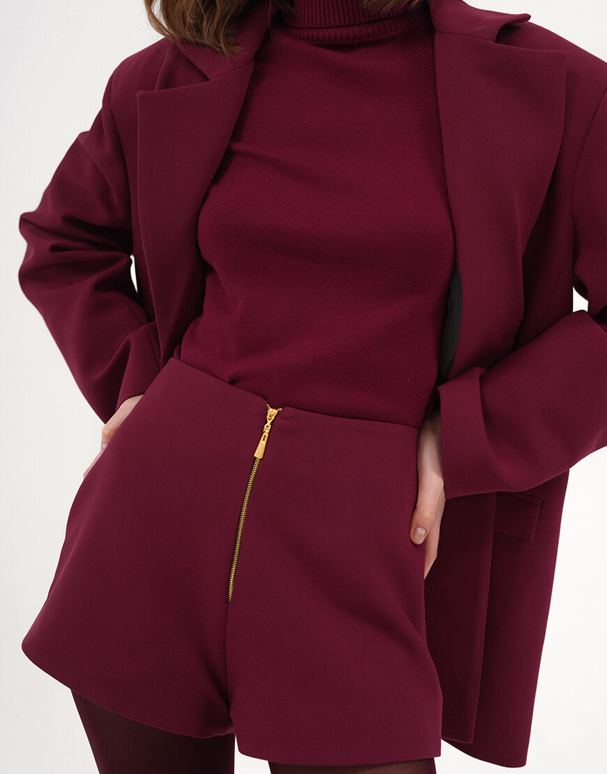 Доставка впродовж 3-10 робочих днівШорти бордового кольору , що виконані в формі трапеції та мають вільний крій донизу. Шорти складаються зсередини з дублерину, аби гарно тримати форму та мають щільний підклад із внутрішньої сторони. Попереду виріб застібається на брендовану блискавку в золотому відтінку.