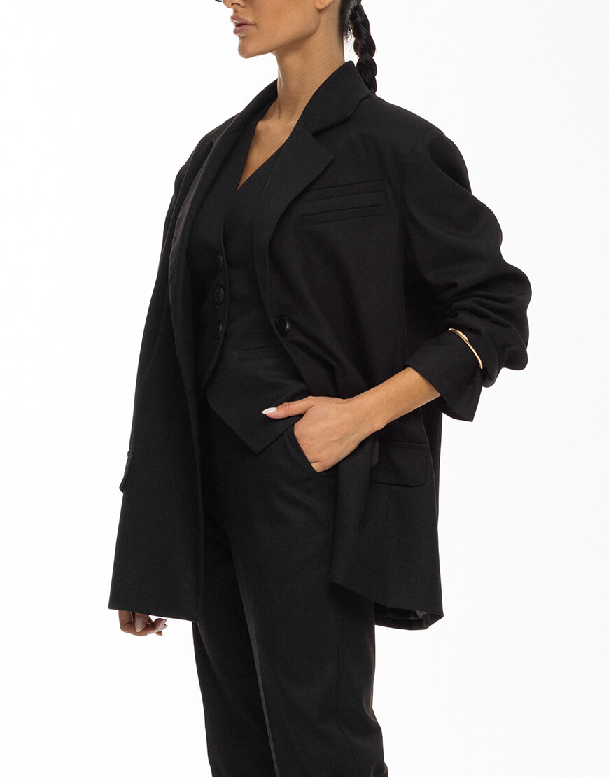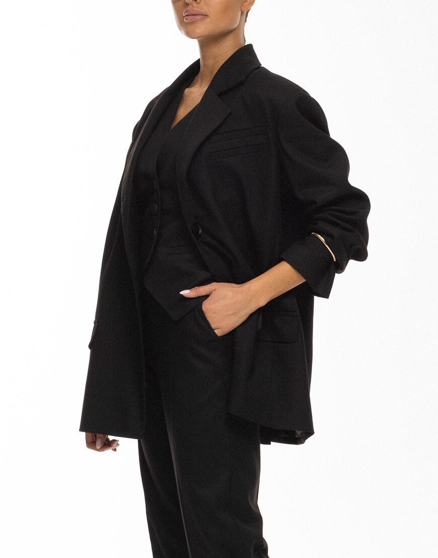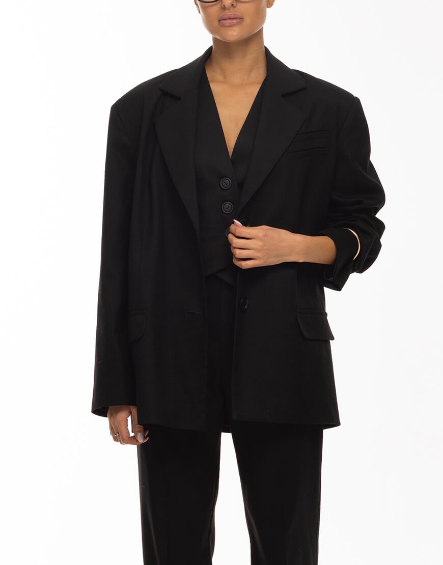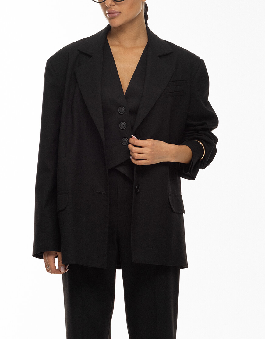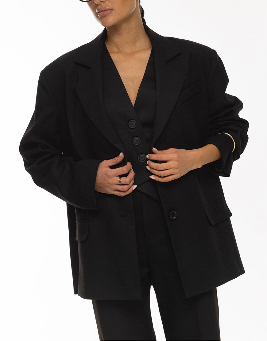 Доставка впродовж 3-10 робочих днівЖакет чорного кольору оверсайз крою, що виконаний зі щільної костюмноі тканини, яка гарно тримає форму. Жакет має широкі приспущені плечі, що додає виробу мускулінності та одночасно жіночності. Зсередини жакет продубльований, аби виріб гарно тримав форму, а також має чорний підклад з натуральної тканини. Попереду застібається на класичні чорні ґудзики та має функціональні кишені. Цей жакет може стати стильним та базовим доповненням до твого гардеробу.