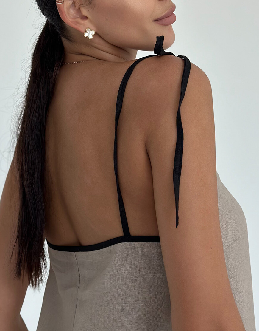 Доставка в течение 3-10 рабочих днейСарафан кольору беж з чорним кантом, виконаний із 100% льону. Має регулюючи бретелі, за допомогою яких можна корегувати довжину виробу. Має легкий та вільний крій, чудово стилізується під різного виду взуття.