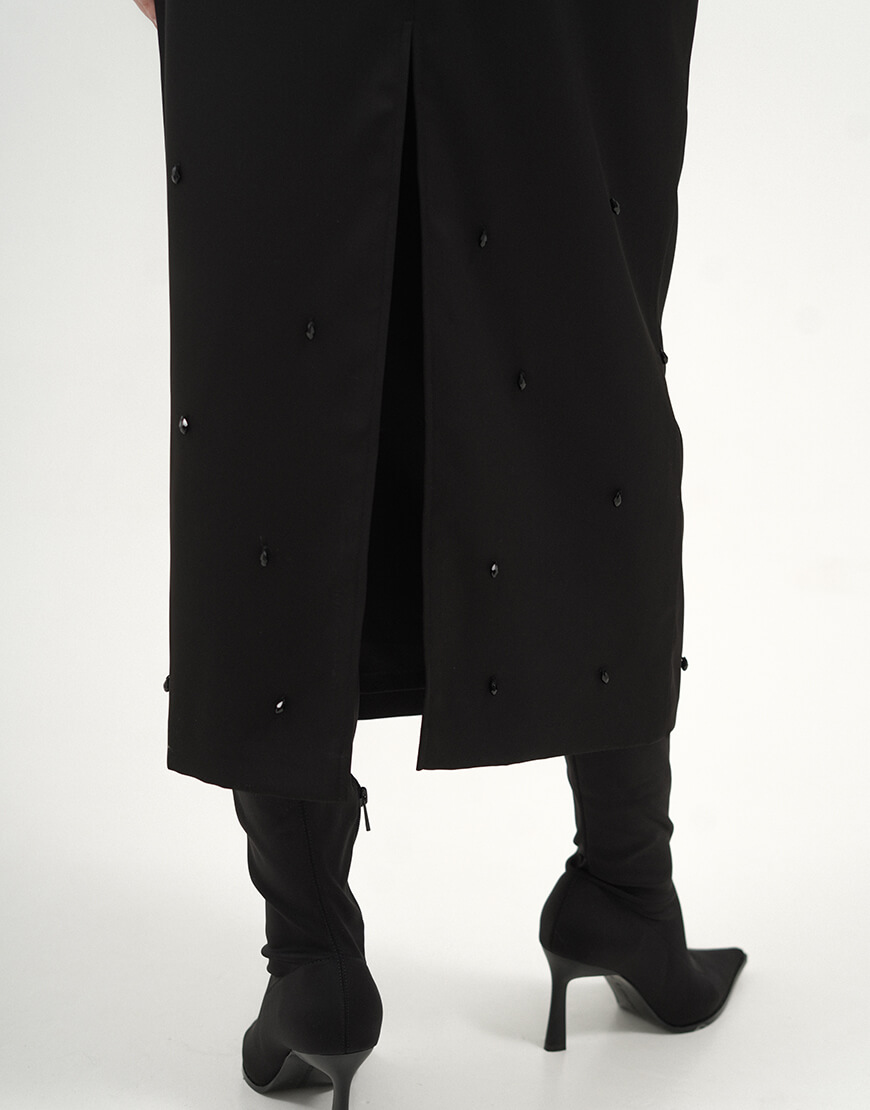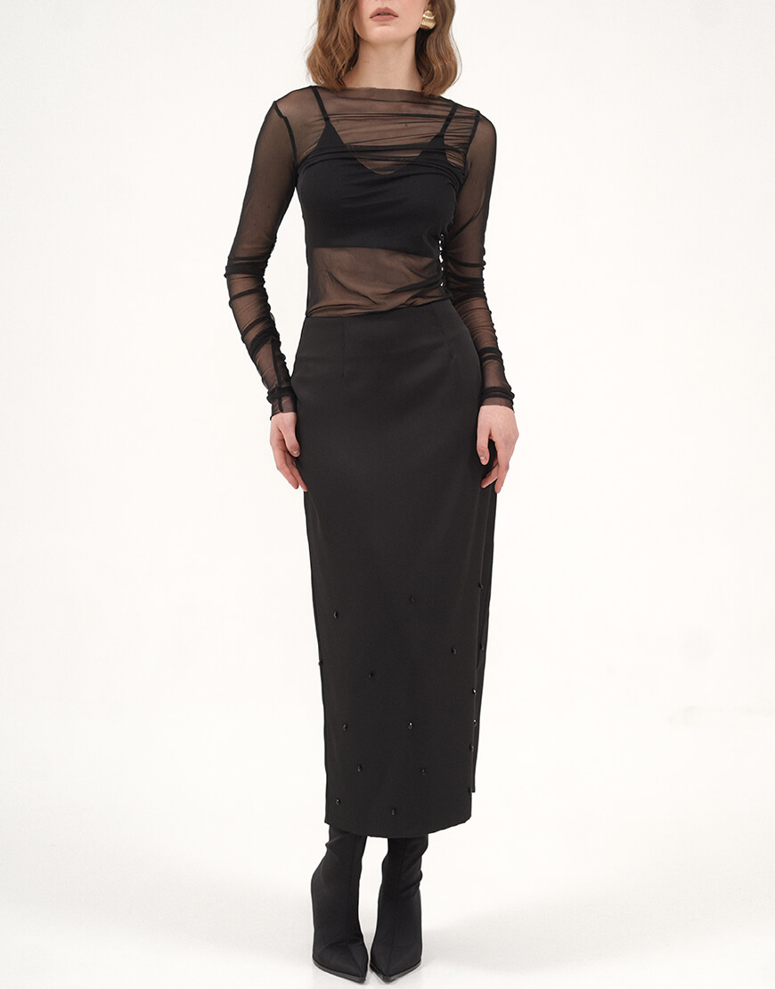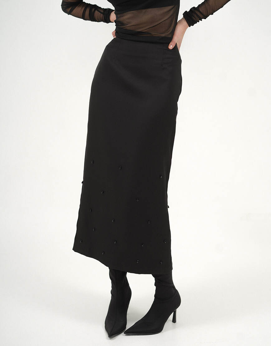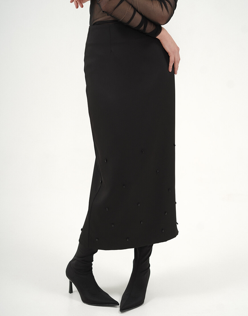 Доставка впродовж 3-10 робочих днівСпідниця довжини міді, виконана зі щільного вечірнього сатину. Спідниця має прямий крій, позаду елегантний виріз. Попереду та позаду спідниці кріпляться пришивні намистини чорного кольору, що додають виробу святковості. З внутрішньої сторони є чорний підклад. Спідниця застібається ззаду на потаємну блискавку.