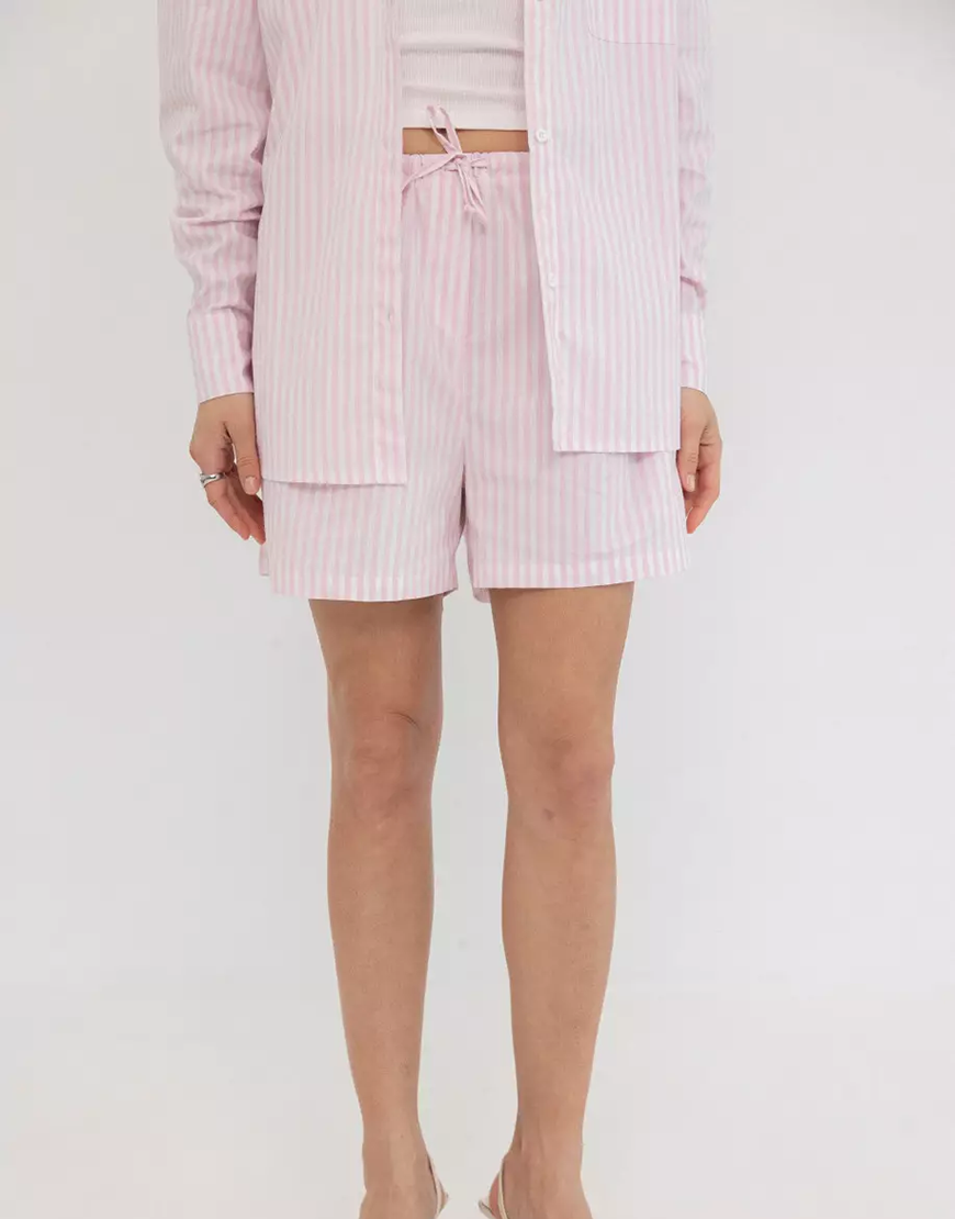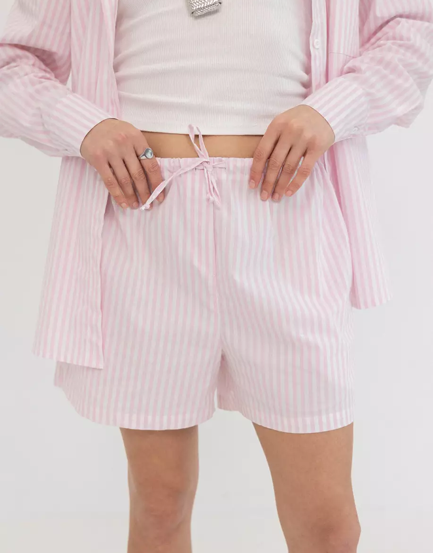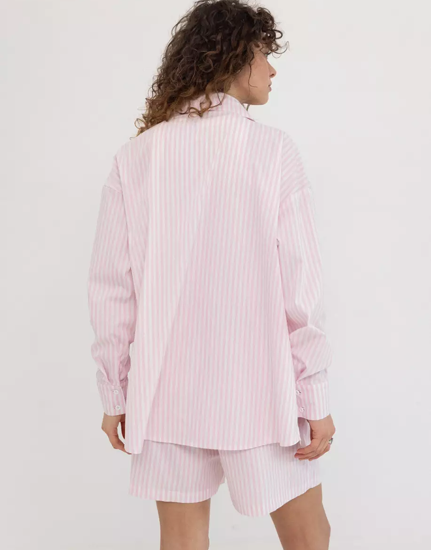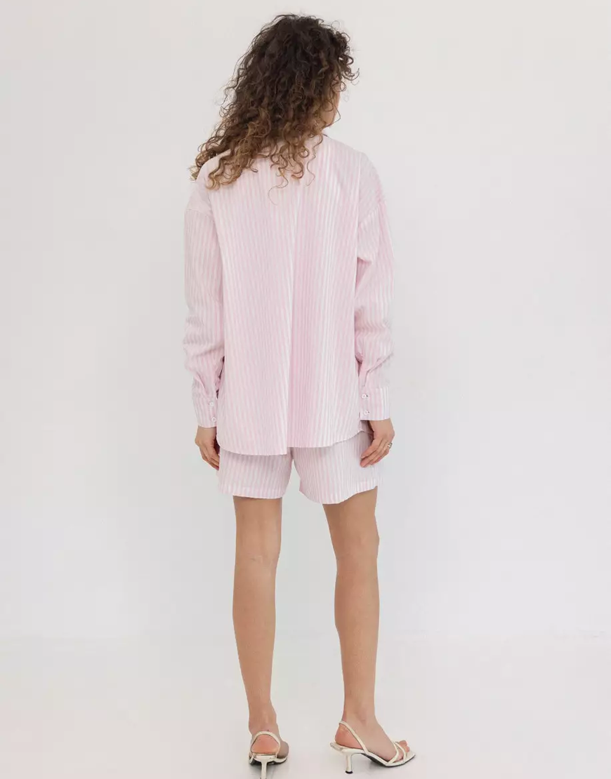 Легкий костюм, створений для комфорту та стилю щодня. Сорочка вільного крою з опущеною лінією плеча та шорти з високою посадкою створюють невимушений силует. Бавовна приємна до тіла й дозволяє шкірі дихати.